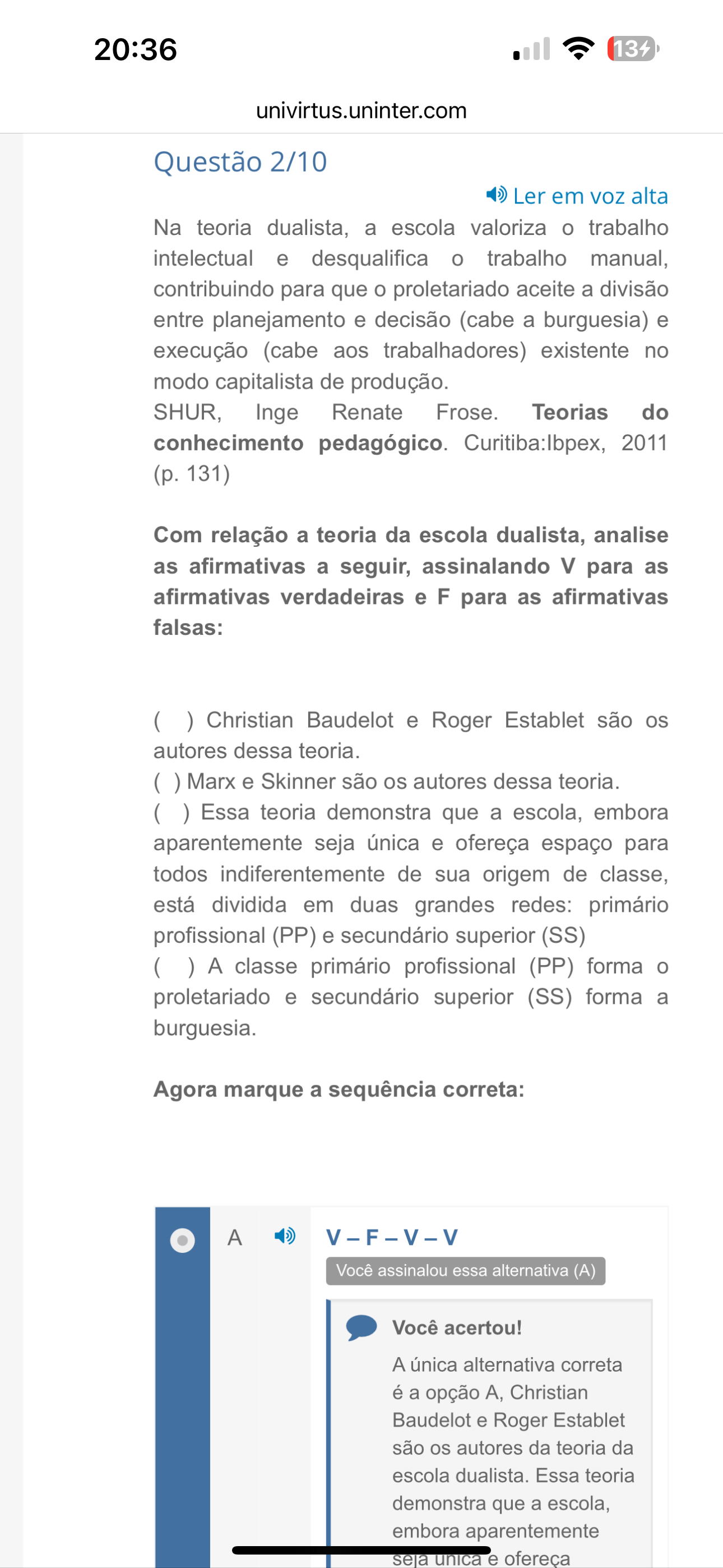 20:36 134 univirtus.uninter.com Questão 2/10 Ler em alta Na teoria dualista, a escola valoriza trabalho intelectual e desqualifica o trabalho manual, contribuindo para que proletariado aceite a divisão entre planejamento e decisão (cabe a burguesia) e execução (cabe aos trabalhadores) existente no modo capitalista de produção. SHUR, Inge Renate Frose. Teorias do conhecimento pedagógico. 2011 131) Com relação a teoria da escola dualista, analise as afirmativas a seguir, assinalando V para as afirmativas verdadeiras e F para as afirmativas falsas: ( ) Christian Baudelot e Roger Establet são os autores dessa teoria. Marx e Skinner são os autores dessa teoria. ( ) Essa teoria demonstra que a escola, embora aparentemente seja única e ofereça espaço para todos indiferentemente de sua origem de classe, está dividida em duas grandes redes: primário profissional (PP) e secundário superior (SS) ( ) A classe primário profissional (PP) forma proletariado e secundário superior (SS) forma a burguesia. Agora marque a sequência correta: A V-F-V-V Você assinalou essa alternativa (A) Você acertou! A única alternativa correta é a opção A, Christian Baudelot e Roger Establet são os autores da teoria da escola dualista. Essa teoria demonstra que a escola, embora aparentemente seja unica e ofereca