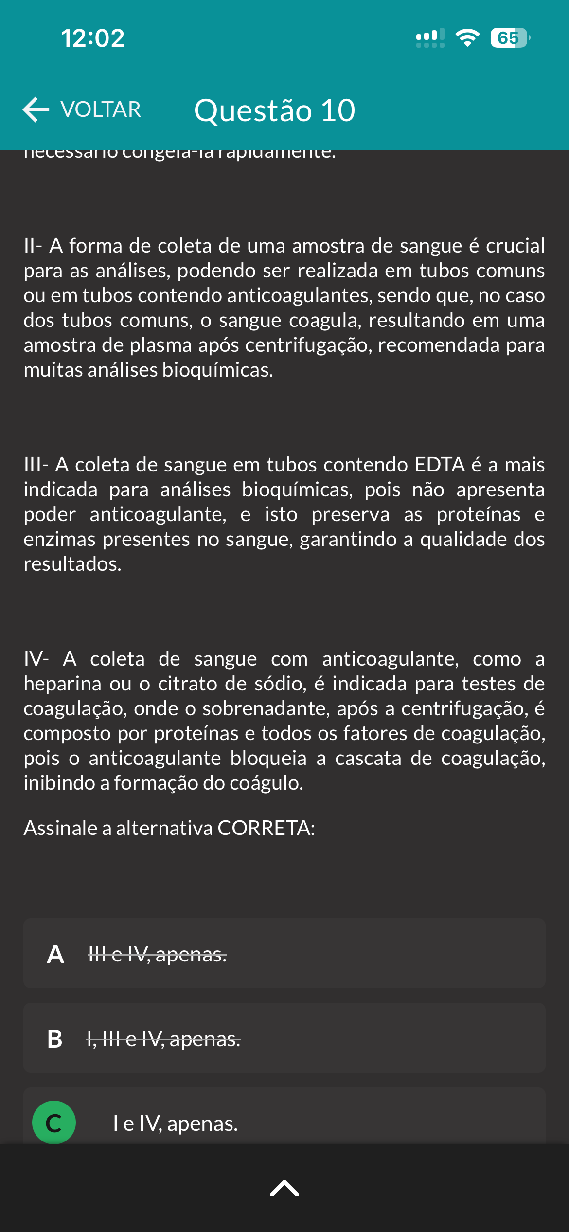 12:02 65 VOLTAR Questão 10 necessar apidamente. II- A forma de coleta de uma amostra de sangue é crucial para as análises, podendo ser realizada em tubos comuns ou em tubos contendo anticoagulantes, sendo que, no caso dos tubos comuns, sangue coagula, resultando em uma amostra de plasma após centrifugação, recomendada para muitas análises bioquímicas. III- A coleta de sangue em tubos contendo EDTA é a mais indicada para análises bioquímicas, pois não apresenta poder anticoagulante, e isto preserva as proteínas e enzimas presentes no sangue, garantindo a qualidade dos resultados. IV- A coleta de sangue com anticoagulante, como a heparina ou citrato de sódio, é indicada para testes de coagulação, onde o sobrenadante, após a centrifugação, é composto por proteínas e todos os fatores de coagulação, pois anticoagulante bloqueia a cascata de coagulação, inibindo a formação do coágulo. Assinale a alternativa CORRETA: A le IV, apenas.