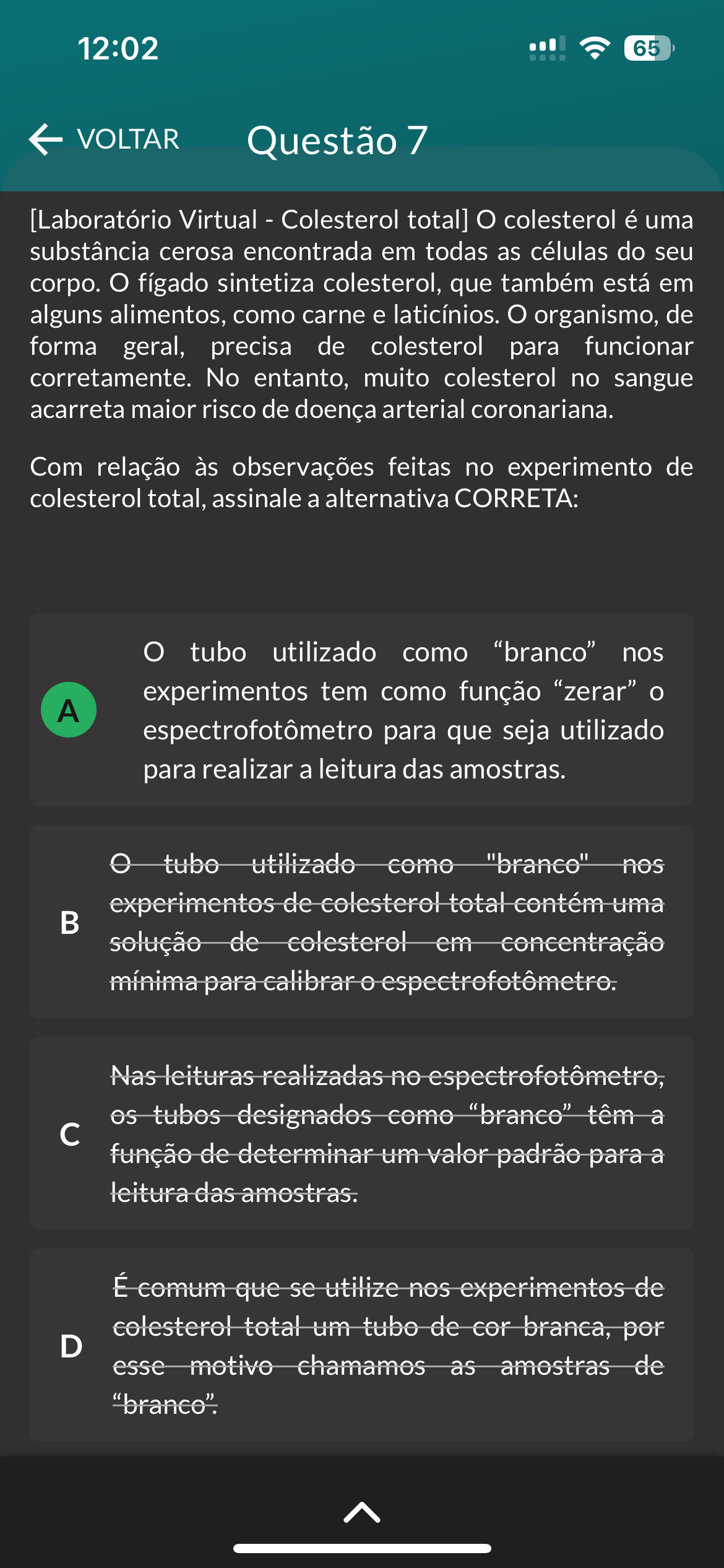 12:02 65 VOLTAR Questão 7 [Laboratório Virtual Colesterol total] colesterol é uma substância cerosa encontrada em todas as células do seu corpo. fígado sintetiza colesterol, que também está em alguns alimentos, como carne e laticínios. organismo, de forma geral, precisa de colesterol para funcionar corretamente. No entanto, muito colesterol no sangue acarreta maior risco de doença arterial coronariana. Com relação às observações feitas no experimento de colesterol total, assinale a alternativa CORRETA: tubo utilizado como "branco" nos experimentos tem como função "zerar" A espectrofotômetro para que seja utilizado para realizar a leitura das amostras. tubo utilizado como "branco" nos experimentos de colesterol total contém uma B solução de colesterol em concentração mínima para calibrar espectrofotômetro. Nas leituras realizadas no espectrofotômetro, tubos designados como "branco" têm a c função de determinar um valor padrão para a leitura das amostras. É comum que se utilize nos experimentos de colesterol total um tubo de cor branca, por D esse motivo chamamos as amostras de "branco".
