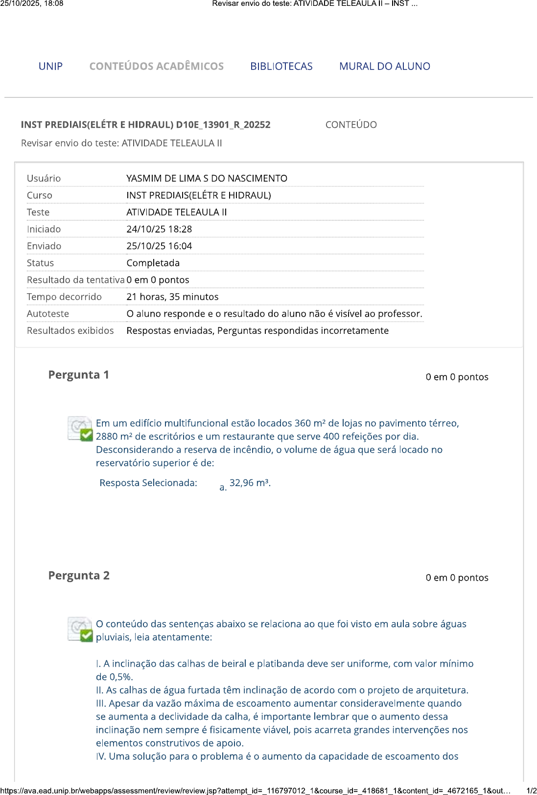 25/10/2025, 18:08 Revisar envio do teste: ATIVIDADE TELEAULA INST UNIP CONTEÚDOS ACADÊMICOS BIBLIOTECAS MURAL DO ALUNO INST PREDIAIS(ELÉTR E HIDRAUL) D10E_13901_R_20252 CONTEÚDO Revisar envio do teste: ATIVIDADE TELEAULA Usuário YASMIM DE LIMA S DO NASCIMENTO Curso INST PREDIAIS(ELÉTR E HIDRAUL) Teste ATIVIDADE TELEAULA Iniciado 24/10/25 18:28 Enviado 25/10/25 16:04 Status Completada Resultado da tentativa 0 em 0 pontos Tempo decorrido 21 horas, 35 minutos Autoteste O aluno responde e resultado do aluno não é visível ao professor. Resultados exibidos Respostas enviadas, Perguntas respondidas incorretamente Pergunta 1 0 em 0 pontos Em um edifício multifuncional estão locados 360 de lojas no pavimento térreo, 2880 de escritórios e um restaurante que serve 400 refeições por dia. Desconsiderando a reserva de incêndio, o volume de água que será locado no reservatório superior é de: Resposta Selecionada: 32,96 m³. a. Pergunta 2 0 em 0 pontos conteúdo das sentenças abaixo se relaciona ao que foi visto em aula sobre águas pluviais, leia atentamente: I. A inclinação das calhas de beiral e platibanda deve ser uniforme, com valor mínimo de 0,5%. II. As calhas de água furtada têm inclinação de acordo com projeto de arquitetura. III. Apesar da vazão máxima de escoamento aumentar consideravelmente quando se aumenta a declividade da calha, é importante lembrar que aumento dessa inclinação nem sempre é fisicamente viável, pois acarreta grandes intervenções nos elementos construtivos de apoio. IV. Uma solução para problema é aumento da capacidade de escoamento dos 1/225/10/2025, 18:08 Revisar envio do teste: ATIVIDADE TELEAULA - INST condutores verticais. Agora marque a alternativa falsa em relação às sentenças contidas neste enunciado: Resposta a. Selecionada: A sentença está correta e é uma consequência direta da sentença IV. Sábado, 25 de Outubro de 2025 18h08min20s BRT OK 2/2