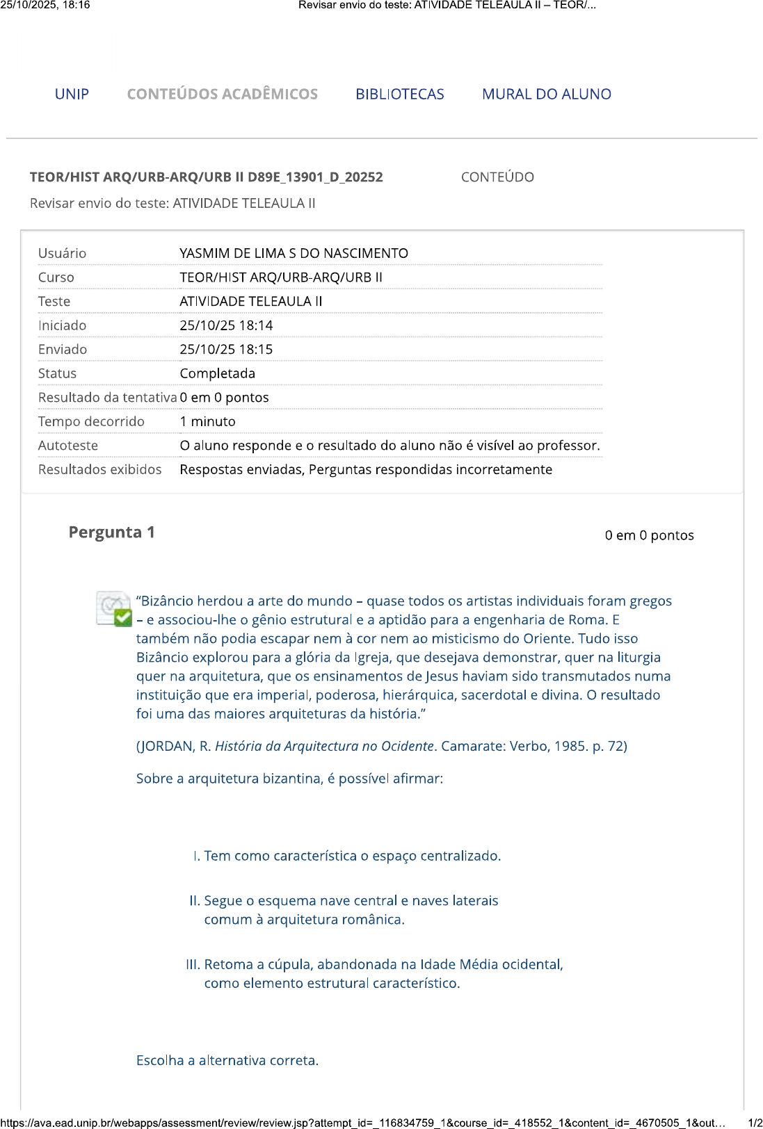 25/10/2025, 18:16 Revisar envio do teste: ATIVIDADE TELEAULA TEOR/... UNIP CONTEÚDOS ACADÊMICOS BIBLIOTECAS MURAL DO ALUNO TEOR/HIST ARQ/URB-ARQ/URB II D89E_13901_D_20252 CONTEÚDO Revisar envio do teste: ATIVIDADE TELEAULA Usuário YASMIM DE LIMA S DO NASCIMENTO Curso TEOR/HIST ARQ/URB-ARQ/URB Teste ATIVIDADE TELEAULA Iniciado 25/10/25 18:14 Enviado 25/10/25 18:15 Status Completada Resultado da tentativa 0 em 0 pontos Tempo decorrido 1 minuto Autoteste O aluno responde e resultado do aluno não é visível ao professor. Resultados exibidos Respostas enviadas, Perguntas respondidas incorretamente Pergunta 1 0 em 0 pontos "Bizâncio herdou a arte do mundo quase todos os artistas individuais foram gregos e associou-lhe gênio estrutural e a aptidão para a engenharia de Roma. E também não podia escapar nem à cor nem ao misticismo do Oriente. Tudo isso Bizâncio explorou para a glória da Igreja, que desejava demonstrar, quer na liturgia quer na arquitetura, que os ensinamentos de Jesus haviam sido transmutados numa instituição que era imperial, poderosa, hierárquica, sacerdotal e divina. resultado foi uma das maiores arquiteturas da história." (JORDAN, R. História da Arquitectura no Ocidente. Camarate: Verbo, 1985. p. 72) Sobre a arquitetura bizantina, é possível afirmar: I. Tem como característica espaço centralizado. II. Segue esquema nave central e naves laterais comum à arquitetura românica. III. Retoma a cúpula, abandonada na Idade Média ocidental, como elemento estrutural característico. Escolha a alternativa correta. 1/225/10/2025, 18:16 Revisar envio do teste: ATIVIDADE TELEAULA TEOR/... Resposta Selecionada: d. As afirmações I e III estão corretas. Pergunta 2 0 em 0 pontos Além dos avanços técnicos, a transição entre Românico e Gótico aponta para uma mudança de mentalidade. Os ensinamentos da filosofia escolástica enquadravam harmoniosamente todo saber daquele tempo e afirmavam a possibilidade de ascensão a Deus não só pela fé, como pela razão. Chegava-se a Deus por um esforço do pensamento, complexo, rigidamente formal, mas rico de sutilezas. Entre as evidências dessa transição na arquitetura, pode-se apontar: I. As dimensões das catedrais góticas que apontavam um afastamento simbólico da escala humana. II. papel simbólico da luz por meio dos vitrais e rosáceas nas catedrais românicas. III. predomínio da escala vertical nas catedrais românicas. Escolha a alternativa correta: Resposta Selecionada: a. Somente a afirmação está correta. Sábado, 25 de Outubro de 2025 18h16min17s GMT-03:00 OK 2/2