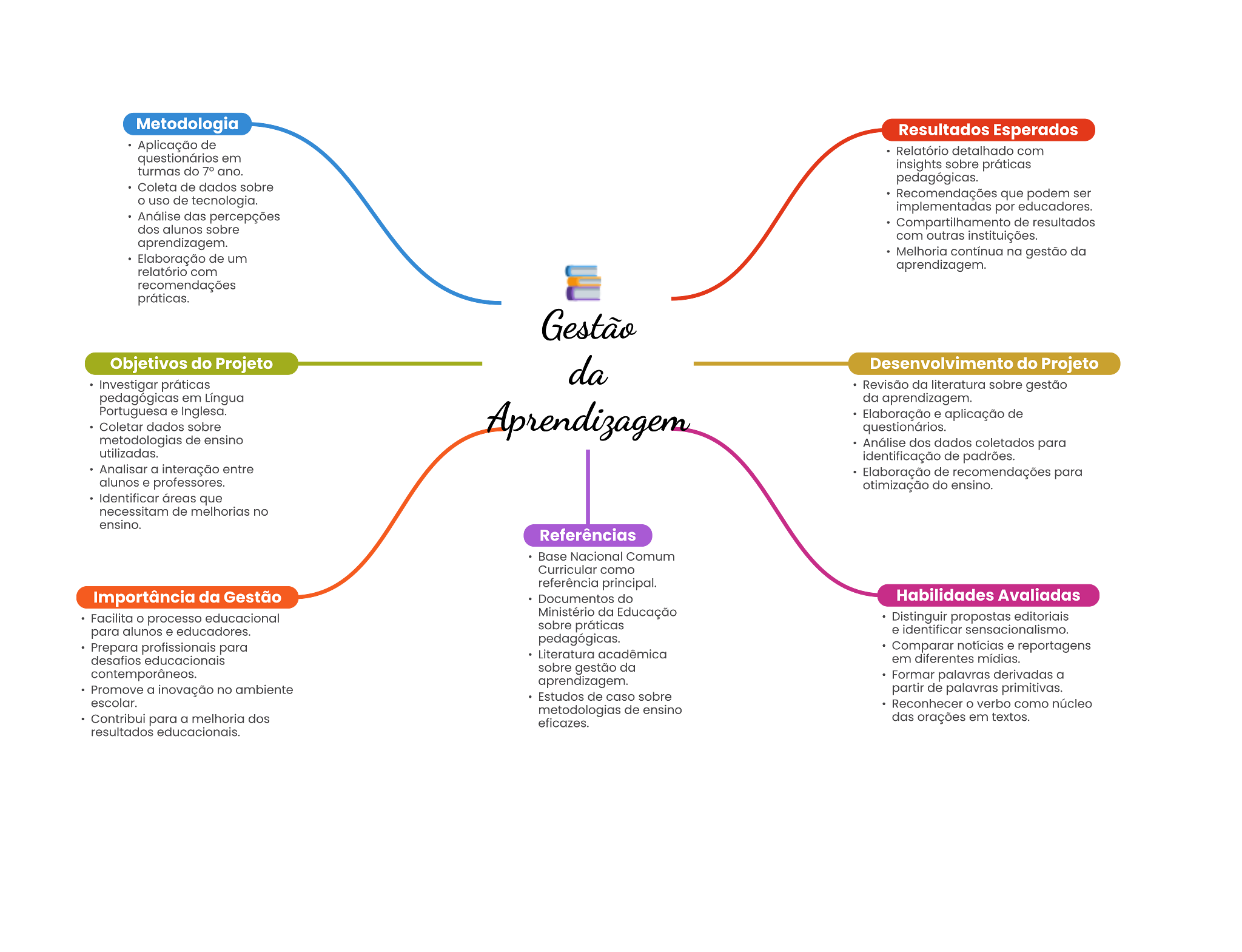 Metodologia Resultados Esperados Aplicação de Relatório detalhado com questionários em turmas do 7° ano. Insights sobre práticas pedagógicas. de dados sobre de tecnologia. que podem ser por educadores. das percepções alunos sobre de resultados aprendizagem. com outras instituições. Baboração de um Melhoria continua na gestão da relatório com aprendizagem. recomendações Objetivos do Projeto Desenvolvimento do Projeto Revisão da literatura sobre em Lingua da Elaboração aplicação de Coletar dados sobre questionários. metodologias de ensino Análise dos dados para identificação de a interação entre Elaboração de recomendações para alunos professores. otimização do eneino. Identificar áreas que de melhorias no Referências Base Nacional Comum Curricular como referência principal. Importância da Gestão Documentos do Habilidades Avaliadas Facilita processo educacional Ministério da Educação Distinguir propostas para alunos e educadores. sobre Prepara profissionals para Comparar noticias reportagene Literatura acadêmica em diferentes sobre gestão da Formar palavras derivadas a Promove a no ambiente partir de palavras primitivas. de COSO sobre escolar. metodologias de ensino verbo como para a melhoria dos das orações em textos. resultados