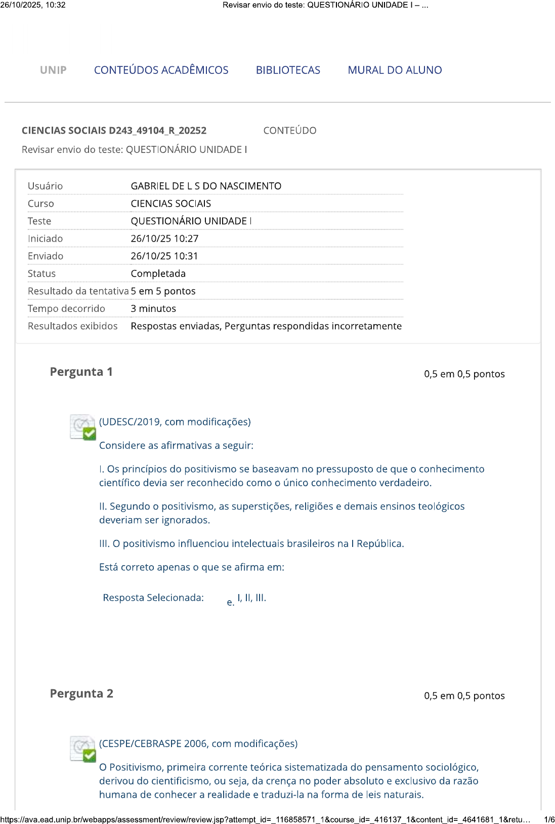 26/10/2025, 10:32 Revisar envio do teste: QUESTIONÁRIO UNIDADE UNIP CONTEÚDOS ACADÊMICOS BIBLIOTECAS MURAL DO ALUNO CIENCIAS SOCIAIS D243_49104_R_20252 CONTEÚDO Revisar envio do teste: QUESTIONÁRIO UNIDADE Usuário GABRIEL DE LS DO NASCIMENTO Curso CIENCIAS SOCIAIS Teste QUESTIONÁRIO UNIDADE Iniciado 26/10/25 10:27 Enviado 26/10/25 10:31 Status Completada Resultado da tentativa 5 em 5 pontos Tempo decorrido 3 minutos Resultados exibidos Respostas enviadas, Perguntas respondidas incorretamente Pergunta 1 0,5 em 0,5 pontos (UDESC/2019, com modificações) Considere as afirmativas a seguir: I. Os princípios do positivismo se baseavam no pressuposto de que conhecimento científico devia ser reconhecido como único conhecimento verdadeiro. II. Segundo positivismo, as superstições, religiões e demais ensinos teológicos deveriam ser ignorados. III. positivismo influenciou intelectuais brasileiros na I República. Está correto apenas que se afirma em: Resposta Selecionada: e. I, II, III. Pergunta 2 0,5 em 0,5 pontos (CESPE/CEBRASPE 2006, com modificações) Positivismo, primeira corrente teórica sistematizada do pensamento sociológico, derivou do cientificismo, ou seja, da crença no poder absoluto e exclusivo da razão humana de conhecer a realidade e traduzi-la na forma de leis naturais. 1/626/10/2025, 10:32 Revisar envio do teste: QUESTIONÁRIO UNIDADE Considere as afirmativas a seguir: I. pensamento positivista reconhecia que os princípios do mundo físico e do mundo social diferiam entre si quanto à essência, mas assumia que as leis filosóficas e metafísicas se aplicavam indistintamente aos fenômenos naturais e às questões humanas. II. pensamento positivista apontava as leis sociais como a base da regulamentação da vida humana, da natureza como um todo e até mesmo do próprio universo. III. pensamento positivista foi inspirado no método de investigação das ciências naturais e postulava que fossem identificados, nas relações sociais, as mesmas relações e princípios que os cientistas naturais utilizavam para explicar a vida natural. Está correto apenas que se afirma em: Resposta Selecionada: Pergunta 3 0,5 em 0,5 pontos (UECE/2018, com modificações) As ciências sociais estiveram, sobretudo em seu nascedouro, profundamente marcadas pelo positivismo. No concernente à pesquisa social, sob os parâmetros desta corrente de pensamento, uma ideia ganha centralidade quando se busca entendimento ou construção da realidade social. Sobre o tema, considere as afirmativas a seguir. I. Assim como a natureza, a sociedade humana reger-se-ia por leis invariáveis e independentes leis naturais que interferem na vida social, econômica, política e cultural de seus membros. conhecimento dessas leis proporcionaria, pois, desvendamento da realidade social. II. A sociedade humana está organizada de forma caótica, sem que haja nas ações humanas quaisquer sinais de evolução e progresso. III. conhecimento da realidade fica condicionado à possibilidade de os fenômenos sociais serem tratados em termos das suas causas finais, causas essas definidas por meio da investigação das intenções de um ser superior, criador do universo e da realidade. Está correto apenas que se afirma em: Resposta Selecionada: Pergunta 4 0,5 em 0,5 pontos 2/626/10/2025, 10:32 Revisar envio do teste: QUESTIONÁRIO UNIDADE (UEM/2011, com modificações) Sobre a relação entre a revolução industrial e surgimento da sociologia como ciência, considere as afirmativas a seguir. I. A consolidação do modelo econômico baseado na indústria conduziu a uma grande concentração da população no ambiente urbano, qual acabou se constituindo em laboratório para trabalho de intelectuais interessados no estudo dos problemas que essa nova realidade social gerava. II. A migração de grandes contingentes populacionais do campo para as cidades gerou uma série de problemas modernos, que passaram a demandar investigações visando à sua resolução ou minimização. III. Os conflitos entre capital e trabalho, potencializados pela concentração dos operários nas fábricas, foram tema de pesquisa dos precursores da sociologia e continuam inspirando debates científicos relevantes na atualidade. IV. A necessidade de controle da força de trabalho fez com que as fábricas e indústrias do século XIX inserissem sociólogos em seus quadros profissionais para atuarem no desenvolvimento de modelos de gestão mais eficientes e produtivos. Está correto apenas que se afirma em: Resposta Selecionada: d. I, e III. Pergunta 5 0,5 em 0,5 pontos (UFU/2015, com modificações) A concepção da Sociologia de Durkheim se baseia em uma teoria do fato social. Seu objetivo é demonstrar que pode e deve existir uma Sociologia objetiva e científica, conforme modelo das outras ciências, tendo por objeto fato social. ARON, R. As etapas do pensamento sociológico. São Paulo: Martins Fontes, 1995. p. 336. Em vista do exposto, considere as afirmativas a seguir. I. Segundo Durkheim, a primeira regra, e a mais fundamental, é considerar os fatos sociais como objeto de análise. II. Durkheim demonstrou que fato social está desconectado dos padrões de comportamento culturais do indivíduo em sociedade e, portanto, deve ser usado para explicar apenas alguns tipos de sociedade. III. estado normal da sociedade para Durkheim é estado de anomia, quando todos os indivíduos exercem bem os fatos sociais. IV. A solidariedade orgânica, para Durkheim, possui pequena divisão do trabalho social, como pode ser demonstrada pela análise dos fatos sociais da sociedade. 3/626/10/2025, 10:32 Revisar envio do teste: QUESTIONÁRIO UNIDADE Está correto apenas que se afirma em: Resposta Selecionada: Pergunta 6 0,5 em 0,5 pontos (AOCP/2020, com modificações) Max Weber é reconhecido na sociologia pela qualidade de seus estudos que envolvem tema Estado Poder. Considere as afirmativas a seguir. I. Para Weber, o poder e a dominação podem ser vi