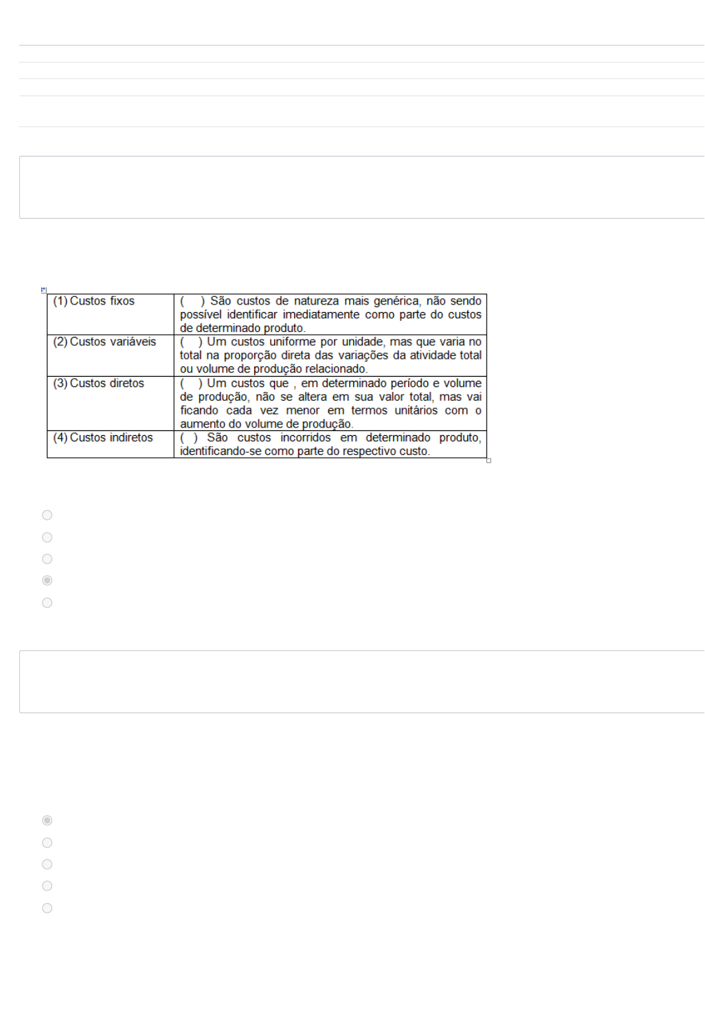 Iniciado em quinta-feira, 9 out. 2025, 09:55 Estado Finalizada Concluída em domingo, 26 out. 2025, 11:00 Tempo empregado 17 dias 1 hora Avaliar 1,80 de um máximo de 2,00(90%) Questão 1 Correto Atingiu 0,20 de 0,20 Questão 2 Correto Atingiu 0,20 de 0,20 De acordo com a teoria contábil acerca da contabilidade de custos, relacione o tipo de custos descritos na primeira coluna com os conceitos apresentados na segunda coluna e, em seguida, assinale a opção correta. Escolha uma opção: a. 3, 1, 2, 4 b. 4, 2, 3, 1 c. 2, 4, 3, 1 d. 4, 2, 1, 3 e. 2, 4, 1, 3 Considerando o conceito de Custos Indiretos de Fabricação (CIF), assinale a alternativa que NÃO CONTÉM um exemplo de CIF: Escolha uma opção: a. Matéria-prima para produção. b. salário do supervisor na fábrica. c. seguro da fábrica. d. reparo nas máquinas. e. lubrificantes de máquinas. 26/10/2025, 11:02 ATIVIDADE ONLINE 1 - AV12025/4: Revisão da tentativa | Graduação EAD https://ava.graduacaoead.unicv.edu.br/mod/quiz/review.php?attempt=6673413&cmid=391110 1/5 Questão 3 Correto Atingiu 0,20 de 0,20 Questão 4 Correto Atingiu 0,20 de 0,20 Questão 5 Incorreto Atingiu 0,00 de 0,20 Uma sociedade empresária adquiriu mercadorias para revenda por R$4.400,00. No mesmo período, a totalidade das mercadorias adquiridas foi vendida por R$ 7.000,00. A comissão devida aos vendedores foi de R$ 80,00. Na Demonstração do Resultado do Período, o Lucro Bruto é igual a: Escolha uma opção: a. R$ 1.868,00 b. R$ 4.400,00 c. R$ 3.600,00 d. R$ 2.600,00 e. R$ 2.520,00 No método de custeio variável apenas os custos variáveis são apropriados aos produtos quanto que os custos fixos são separados e: Escolha uma opção: a. atribuídos aos produtos por direcionadores de custos. b. alocados aos produtos por meio de rastreadores de custos. c. atribuídos aos produtos proporcionalmente a quantidade produzida. d. alocados aos produtos por um critério de rateio escolhido. e. considerados como despesas do período. A Cia das Camisas pretende elaborar a Demonstração de Resultado do Exercício pelo Método do Custeio por Absorção e pelo Custeio Variável. Para isso, irá utilizar as informações a seguir. Preço de venda R$ 20,00 Custos variáveis de produção R$ 6,00 por unidade Despesas variáveis: R$ 2,00 por unidade Custos fixos R$ 60.000,00 por mês Volume mensal de produção 30.000 unidades Volume mensal de vendas 20.000 unidades Diante do exposto, o lucro mensal da Cia das Camisas pelo Custeio por Absorção e pelo Custeio Variável é igual a, respectivamente: Escolha uma opção: a. R$ 344 000,00 e R$ 234 000,00 b. R$ 240 000,00 e R$ 180 000,00 c. R$ 216 000,00 e R$ 236 000,00 d. R$ 240 000,00 e R$ 220 000,00 e. R$ 200 000,00 e R$ 180 000,00 26/10/2025, 11:02 ATIVIDADE ONLINE 1 - AV12025/4: Revisão da tentativa | Graduação EAD https://ava.graduacaoead.unicv.edu.br/mod/quiz/review.php?attempt=6673413&cmid=391110 2/5 Questão 6 Correto Atingiu 0,20 de 0,20 Questão 7 Correto Atingiu 0,20 de 0,20 Questão 8 Correto Atingiu 0,20 de 0,20 Em relação aos produtos fabricados, identifique a alternativa INCORRETA: Escolha uma opção: a. Custos indiretos compreendem os gastos com materiais, mão-de-obra e gastos fabricação aplicados indiretamente na fabricação dos produtos. b. Os custos diretos compreendem os gastos com materiais, mão-de-obra e gastos gerais de fabricação aplicados diretamente na fabricação dos produtos. c. A atribuição dos custos indiretos aos produtos é feita por meio de um critério de rateio. d. Os custos diretos são distribuídos aos produtos por meio de um critério de rateio. e. A impossibilidade de identificação de um gasto em relação aos produtos ocorre porque beneficiam a fabricação de vários produtos ao mesmo tempo. De acordo com os conceitos das terminologias contábeis é correto afirmar que: Escolha uma opção: a. Custo não é a aplicação de recursos para a obtenção de bens para a entidade que possam vir a gerar lucro durante sua atividade. b. As despesas não são incluídas como custos dos produtos, mas sim como recursos consumidos fora do processo de produção ou da prestação de serviços para a obtenção de receita. c. Desembolso são os demais gastos após a fabricação do produto, que interfere diretamente no resultado do exercício. d. Gasto caracteriza-se pela entrega de numerários (dinheiro), que pode ocorrer antes (pagamento antecipado), no momento (pagamento a vista) ou depois (pagamento a prazo) da ocorrência do gasto. e. Perda é a aplicação de recursos para a obtenção de bens para a entidade que possam vir a gerar lucro durante sua atividade. De acordo com o volume de produção assinale a alternativa correta: Escolha uma opção: a. Os Custos variáveis sofrem alterações de acordo com o volume de produção. b. A mão-de-obra direta é alocada aos produtos utilizando rateio. c. Os Custos diretos não podem ser apropriados diretamente ao produto necessitando de um critério de rateio. d. Os custos fixos se alteram com o volume de produção. e. Os custos indiretos são apropriados aos produtos de acordo com o volume produzido. 26/10/2025, 11:02 ATIVIDADE ONLINE 1 - AV12025/4: Revisão da tentativa | Graduação EAD https://ava.graduacaoead.unicv.edu.br/mod/quiz/review.php?attempt=6673413&cmid=391110 3/5 Questão 9 Correto Atingiu 0,20 de 0,20 Os gastos incorridos para a elaboração do produto são contabilmente classificados como custos. Gastos incorridos após a disponibilização do produto devem ser classificados como despesa. Custos estão diretamente relacionados ao processo de produção de bens ou serviços sendo considerados pela contabilidade de custos como diretos e indiretos, fixos e variáveis de acordo com a apropriação ao objeto de custeio. As despesas estão associadas ao período - não repercutem, diretamente, na elaboração dos produtos ou serviços prestados. (Fonte: BRUNI, Adriano Leal. FAMÁ, Rubens. Gestão de custos e form