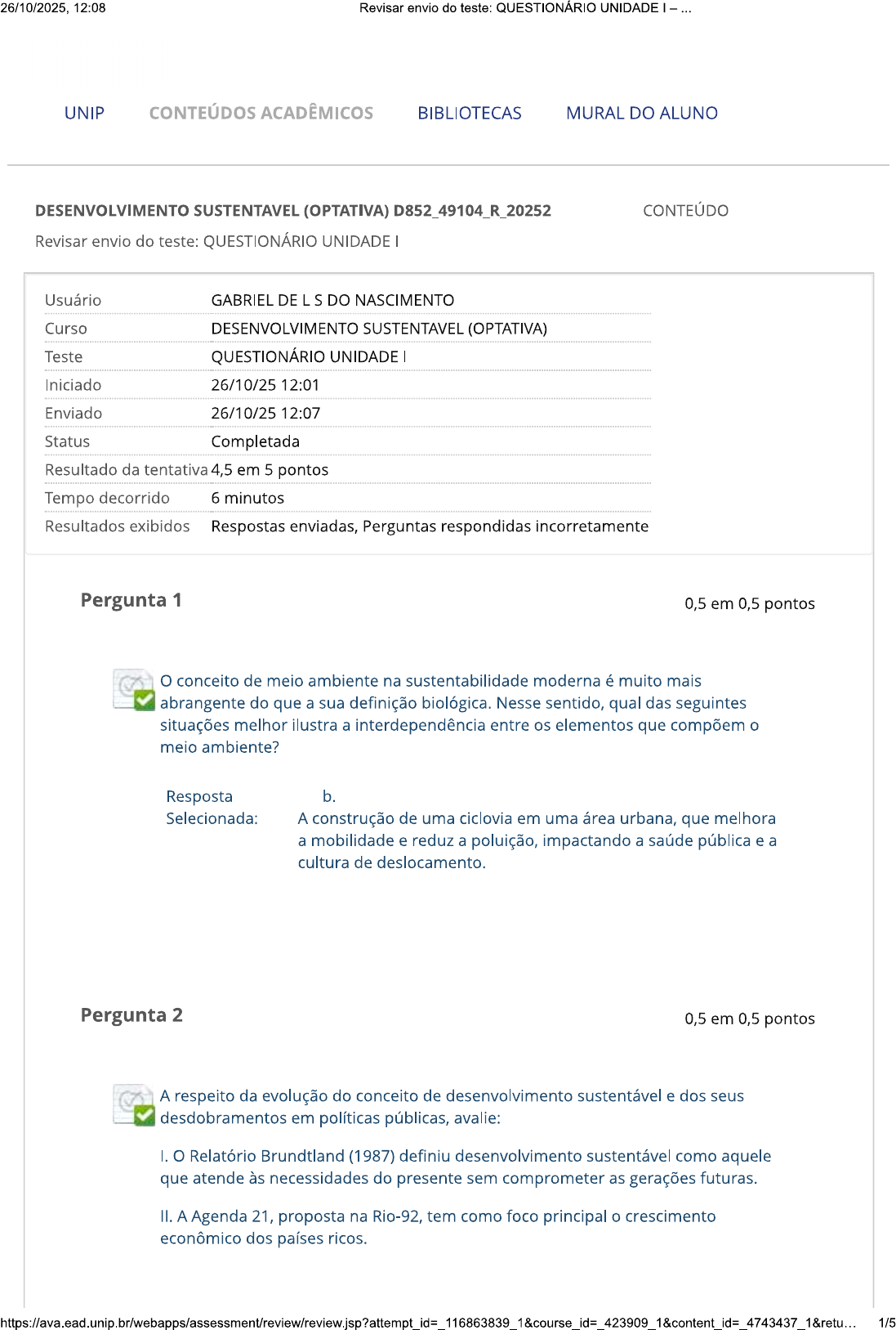 26/10/2025, 12:08 Revisar envio do teste: QUESTIONÁRIO UNIDADE UNIP CONTEÚDOS ACADÊMICOS BIBLIOTECAS MURAL DO ALUNO DESENVOLVIMENTO SUSTENTAVEL (OPTATIVA) D852_49104_R_20252 CONTEÚDO Revisar envio do teste: QUESTIONÁRIO UNIDADE Usuário GABRIEL DE LS DO NASCIMENTO Curso DESENVOLVIMENTO SUSTENTAVEL (OPTATIVA) Teste QUESTIONÁRIO UNIDADE I Iniciado 26/10/25 12:01 Enviado 26/10/25 12:07 Status Completada Resultado da tentativa 4,5 em 5 pontos Tempo decorrido 6 minutos Resultados exibidos Respostas enviadas, Perguntas respondidas incorretamente Pergunta 1 0,5 em 0,5 pontos conceito de meio ambiente na sustentabilidade moderna é muito mais abrangente do que a sua definição biológica. Nesse sentido, qual das seguintes situações melhor ilustra a interdependência entre os elementos que compõem meio ambiente? Resposta b. Selecionada: A construção de uma ciclovia em uma área urbana, que melhora a mobilidade e reduz a poluição, impactando a saúde pública e a cultura de deslocamento. Pergunta 2 0,5 em 0,5 pontos A respeito da evolução do conceito de desenvolvimento sustentável e dos seus desdobramentos em políticas públicas, avalie: I. Relatório Brundtland (1987) definiu desenvolvimento sustentável como aquele que atende às necessidades do presente sem comprometer as gerações futuras. II. A Agenda 21, proposta na Rio-92, tem como foco principal crescimento econômico dos países ricos. 1/526/10/2025, 12:08 Revisar envio do teste: QUESTIONÁRIO UNIDADE III. desenvolvimento sustentável está baseado na articulação entre os pilares social, ambiental e econômico. Está correto o que se afirma em: Resposta Selecionada: b. le III, apenas. Pergunta 3 0,5 em 0,5 pontos Considerando contexto histórico dos encontros mundiais sobre meio ambiente, analise: documento "O Futuro que Queremos", resultante da Rio+20 (2012), teve impacto significativo na transição para os Objetivos do Desenvolvimento Sustentável (ODS). texto reforça a necessidade de: Resposta e. Selecionada: integrar as dimensões sociais, ambientais e econômicas nas políticas públicas. Pergunta 4 0 em 0,5 pontos O direito ambiental como a ciência autônoma que é, possui princípios constitucionais, bem como princípios que apoiam-se em declarações internacionais. Como assevera Kanto (apud Machado, 2017, p. 47), assinale a alternativa que representa os três princípios que formam os pilares do Direito Ambiental: Resposta Selecionada: Usuário-Pagador, Poluidor-Pagador e Correção. C. Pergunta 5 0,5 em 0,5 pontos conceito de "Justiça Ambiental" emerge como resposta aos impactos desiguais da degradação ambiental sobre populações vulneráveis. Nesse contexto, qual afirmação está mais alinhada com esse princípio? 2/526/10/2025, 12:08 Revisar envio do teste: QUESTIONÁRIO UNIDADE Resposta d. Selecionada: Busca garantir que todos tenham acesso igual aos benefícios e riscos ambientais. Pergunta 6 0,5 em 0,5 pontos A Lei n. 6.938/81, que instituiu a Política Nacional do Meio Ambiente (PNMA), estabeleceu uma série de instrumentos para a sua execução. Um desses instrumentos é a criação de um sistema de órgãos e conselhos para a gestão ambiental em diferentes esferas. Esse sistema, que inclui Conselho Nacional do Meio Ambiente (CONAMA) e Instituto Brasileiro do Meio Ambiente e dos Recursos Naturais Renováveis (IBAMA), é conhecido como: Resposta Selecionada: Sistema Nacional do Meio Ambiente (SISNAMA). a. Pergunta 7 0,5 em 0,5 pontos Durante uma feira empresarial, uma startup apresenta produtos "100% ecológicos", mas não possui certificações ambientais e não divulga seus processos produtivos. Essa apresentação gera desconfiança entre os visitantes. Essa situação indica possível ocorrência de: Resposta Selecionada: b. Greenwashing disfarçado. Pergunta 8 0,5 em 0,5 pontos A economia verde, como um modelo de desenvolvimento, busca reestruturar as economias para que o crescimento econômico e a sustentabilidade ambiental não sejam objetivos conflitantes. Considerando essa definição, qual das seguintes ações de uma nação ou de uma empresa estaria mais alinhada com os princípios da economia verde? 3/526/10/2025, 12:08 Revisar envio do teste: QUESTIONÁRIO UNIDADE Resposta d. Selecionada: Implementar políticas que subsidiam a produção de energia a partir de fontes renováveis, como a solar e a eólica. Pergunta 9 0,5 em 0,5 pontos Uma empresa de bebidas lança uma nova embalagem "100% reciclável", mas não investe em logística reversa ou em campanhas de conscientização sobre a destinação correta do material. Paralelamente, suas operações de produção continuam a gerar alta emissão de carbono e grande consumo de água. Nesse contexto, analise as afirmativas a seguir: I A prática de greenwashing desvia a atenção do público de problemas ambientais mais graves causados pela empresa. A publicidade enganosa, mesmo que de cunho ambiental, não prejudica a reputação da marca a longo prazo, pois os consumidores valorizam a intenção. III greenwashing pode ser considerado uma violação das leis de proteção ao consumidor e da ética empresarial. IV Para evitar greenwashing, é fundamental que a empresa demonstre coerência entre seu discurso e suas práticas ambientais e sociais em toda a sua cadeia produtiva. Está correto que se afirma em: Resposta Selecionada: d. I, III e IV, apenas. Pergunta 10 0,5 em 0,5 pontos Uma empresa de tecnologia lança um programa de capacitação profissional em programação para jovens de baixa renda, com a promessa de contratar os melhores alunos. Ao mesmo tempo, ela adota um plano de reciclagem de eletrônicos e passa a usar energia renovável em suas sedes. Qual das alternativas a seguir melhor descreve essas ações no contexto da Responsabilidade Social Empresarial (RSE)? Resposta e. Selecionada: As ações demonstram que a RSE busca integrar as dimensões social e ambiental ao modelo de negócio, gerando valor para a sociedade e 