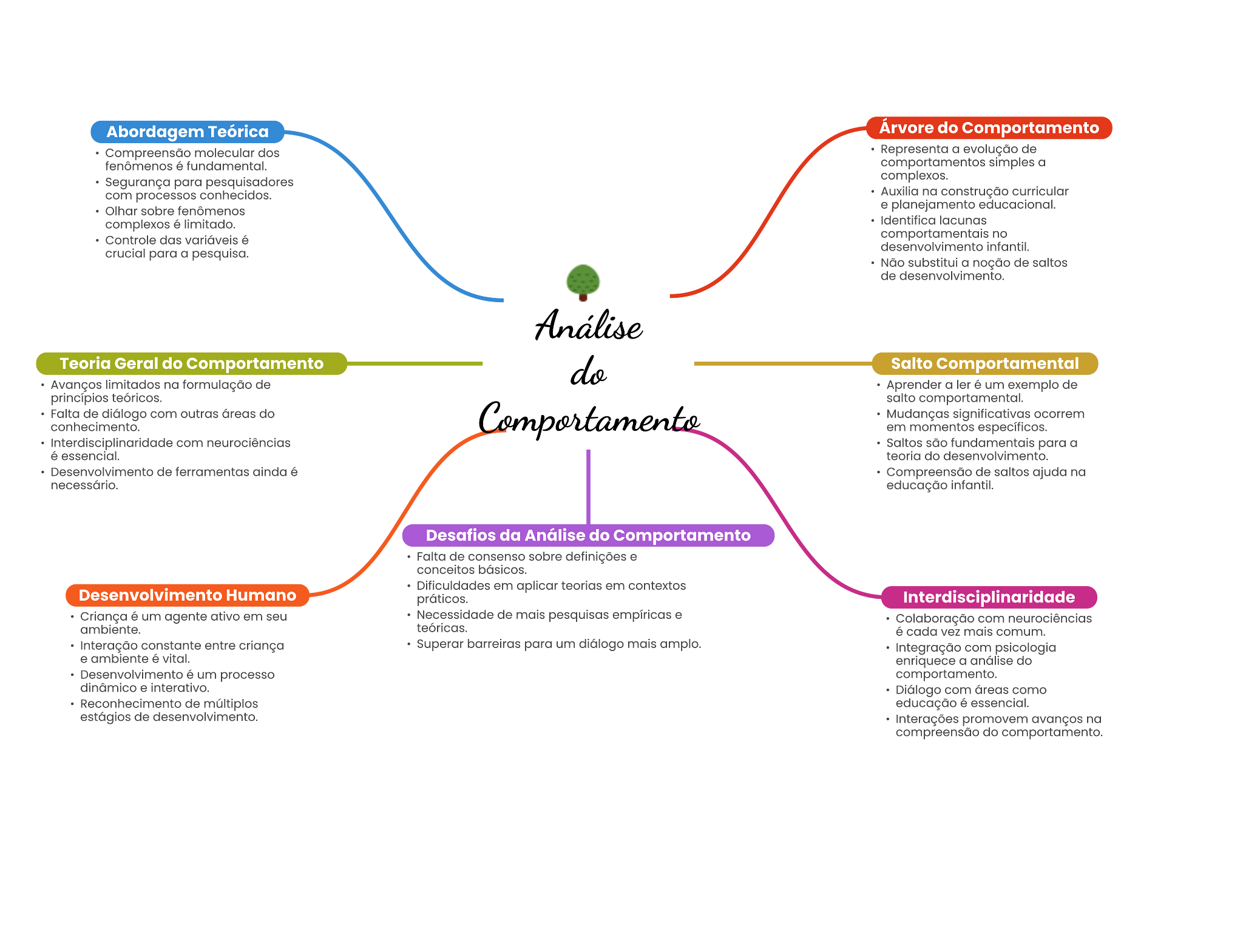 Abordagem Teórica Árvore do Comportamento dos Representa a evolução de fenômenos fundamental. comportamentos a Segurança para com processos conhecidos. na construção curricular Olhar sobre . limitado. Identifica Controle das no desenvolvimento infantil. para a Não substitui a noção de de Teoria Geral do Comportamento Salto Comportamental limitados na formulação de Aprender a ler é um de principios salto Faita de diálogo com outras do Mudanças significativas ocorrem em momentos específicos. com neurociências Saltos são para a essencial. do de ferramentas ainda é Compreensão de ajuda na educação Desafios da Análise do Comportamento Falta de consenso sobre definições . conceitos em aplicar em contaxtos Desenvolvimento Humano práticos. Interdisciplinaridade Criança é um ativo em seu Necessidade de male Colaboração com neurociências ambiente. teóricas. vez male comum. constante entre para um amplo. com ambiente vital. enriquece a análise do um processo dinâmico com como Reconhecimento de múltiplos educação de promovem avanços do comportamento.