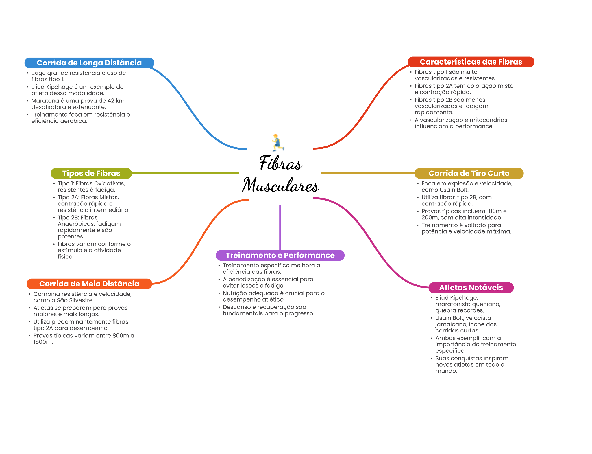 Corrida de Longa Distância Características das Fibras Exige grande resistência uso de Fibras tipo 1 são multo fibras tipo L vasculartzadas . resistentes. Eliud Kipchoge um exemplo de Fibras tipo 2A têm coloração mista modalidade. contração rápida. Maratona uma prova de 42 km, Fibras tipo 2B são menos vasculartzadas . fadigam Treinamento foca em . eficiência aeróbica. A vasculartzação . a performance. Tipos de Fibras Corrida de Tiro Curto Tipo Fibras Foca em explosão e velocidade, resistentes fadiga. como Usain Bolt. Tipo 2A: Fibras Utiliza fibras tipo com contração rápida contração resistência Provas incluem 100m Tipo 2B: 200m, com alta intensidade. fadigam Treinamento é voltado para rapidamente são velocidade potentes. conforme o a atividade Treinamento e Performance Treinamento específico melhora a eficiência A periodização essencial para Corrida de Meia Distância lesões fadiga. Atletas Notáveis Combina resistência e velocidade, Nutrição adequada é para como a São desempanho se preparam para provas Descanso recuperação são maratonista queniano, malores mais longas. para o progresso. quebra recordes. Bolt, Utiliza fibras das tipo 2A para desempenho. curtas. Provas variam entre 800m a Ambos exemplificam a 1500m. do treinamento específico. conquistas inspiram novos em todo mundo.