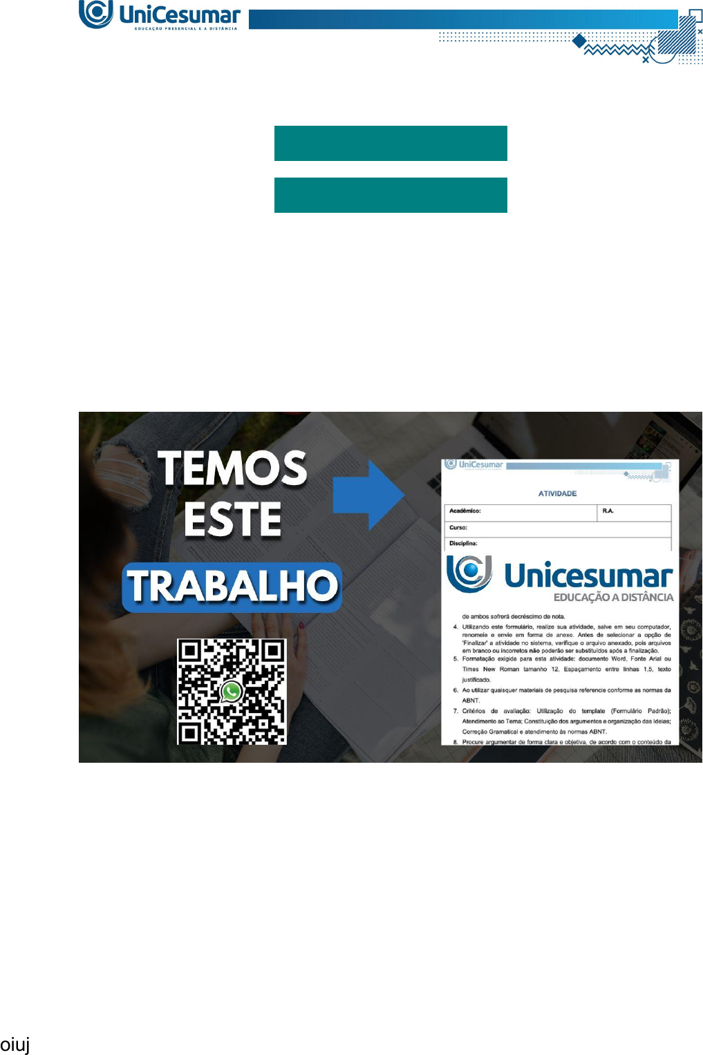 (99) 99119-3171 (99) 99119-3171 Olá!!! Somos da Assessoria Excellence Educacional e iremos te ajudar com este trabalho! Entre em contato conosco! MAPA - CÁLCULO I - 54_2025 MAPA - CÁLCULO I - 54_2025 A interdisciplinaridade no ensino da Matemática é fundamental para tornar a aprendizagem mais significativa. Ao estabelecer conexões entre conteúdos matemáticos e outras áreas do conhecimento, como Física, Química, Biologia, Geografia e Economia, o professor amplia a compreensão dos alunos e mostra a aplicabilidade real da disciplina. Você como professor de Matemática tem papel fundamental nesse processo mostrando que essa interdisciplinaridade faz muita diferença e abre horizontes na vida do estudante. Esse movimento rompe com a visão fragmentada do saber, permitindo que o estudante perceba o conhecimento oiuj como um todo integrado. Além disso, favorece a motivação, pois os estudantes conseguem relacionar o que aprendem em sala com situações do cotidiano e de outras disciplinas. A prática interdisciplinar estimula o pensamento crítico, a criatividade e a capacidade de resolver problemas complexos. Para a formação de futuros professores, como no caso da Licenciatura em Matemática, a interdisciplinaridade também é essencial, já que contribui para uma atuação pedagógica mais rica, contextualizada e alinhada às demandas da sociedade atual. Com base nesse princípio apresentamos o nosso MAPA. Elabore um relatório escrito (de 3 a 5 páginas) contendo as seguintes partes: 1. Introdução Apresente, em poucas linhas, o que são derivadas e qual sua importância na Matemática e em outras áreas do conhecimento. 2. Escolha de um Contexto Aplicado O estudante deverá escolher um tema real em que o conceito de derivada possa ser aplicado. Exemplos: - Crescimento populacional (Biologia). - Movimento de um objeto (Física). - Lucro máximo ou custo mínimo (Economia). - Problemas de otimização (Engenharia/Arquitetura). - Variação de temperatura (Climatologia). 3. Modelagem Matemática Apresente um problema e a função matemática relacionada ao contexto. Calcule a derivada e interprete seu significado dentro da situação escolhida. Se possível, mostre pontos de máximo, mínimo ou intervalos de crescimento/decrescimento. Se não for possível calcular, deverá justificar. 4. Parte Visual (Obrigatória) Inclua um gráfico da função (feito no GeoGebra, Excel ou outro software). 5. Reflexão Didática Explique como você ensinaria esse conceito para alunos da Educação Básica. Sugira uma atividade simples que um professor poderia aplicar em sala de aula sobre derivadas, não necessariamente a derivada, mas um resultado que foi gerado por ela. 6. Conclusão Retome a importância das derivadas no exemplo escolhido. Comente como esse tipo de aplicação ajuda a valorizar a Matemática no dia a dia. ATENÇÃO! Para maior facilidade na execução dessa atividade, a seguir, apresentamos mais detalhes sobre a sua realização: - Leia com atenção as informações contidas aqui e procure outras informações oiuj sobre o assunto que agreguem à sua atividade. - No material da disciplina encontra-se disponível um TEMPLATE para elaboração da atividade. - Seu texto deve ser escrito na fonte Times New Roman ou Arial, com tamanho de letra 12. Não se esqueça de apresentar todos os cálculos realizados (apenas fotografia dos cálculos manuais NÃO serão aceitas!). - Não serão consideradas respostas sem justificativa. - Realize uma cuidadosa revisão em sua atividade e anexe o arquivo nela, clicando sobre o botão “Selecionar Arquivo”. oiuj