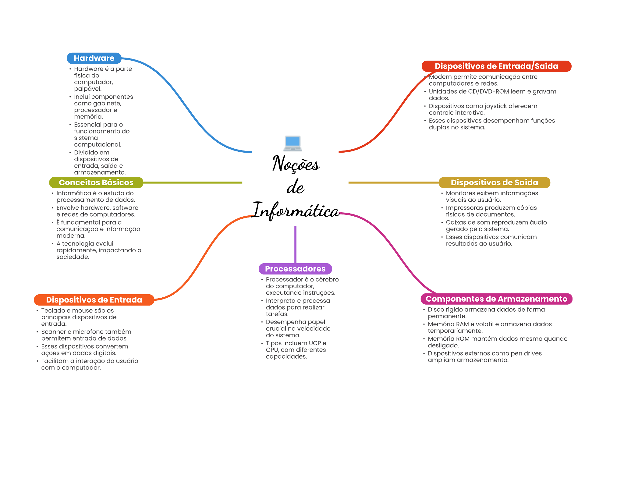 Hardware Hardware a parte Dispositivos de Entrada/Saída do Modem comunicação entre computador, computadores redes. Unidades de CD/DVD-ROM Isem gravam componentes dados. como processador Dispositivos como oferecem Essencial para Esses dispositivos desempenham funções funcionamento do no sistema computacional. Dividido em dispositivos de entrada, Conceitos Básicos Dispositivos de Saída Informática estudo do Monitores informações processamento de usuário. Envolve hardware, software Impressoras produzem cópias redes de computadores. de documentos. É fundamental para a de som reproduzem comunicação informação gerado pelo sistema. dispositivos comunicam A tecnologia resultados usuário. a sociedade. Processadores Processador cérebro do computador, Dispositivos de Entrada processa Componentes de Armazenamento mouse são dados para Disco dados de forma principais dispositivos de permanente. entrada. Desempenha papel Memória RAM dados Scanner 6 microfone crucial velocidade permitem entrada de do ROM dados mesmo quando dispositivos convertem Tipos UCP desligado. ações em dados com capacidades. Dispositivos externos como pen drives Facilitam a interação do usuário ampliam com computador.