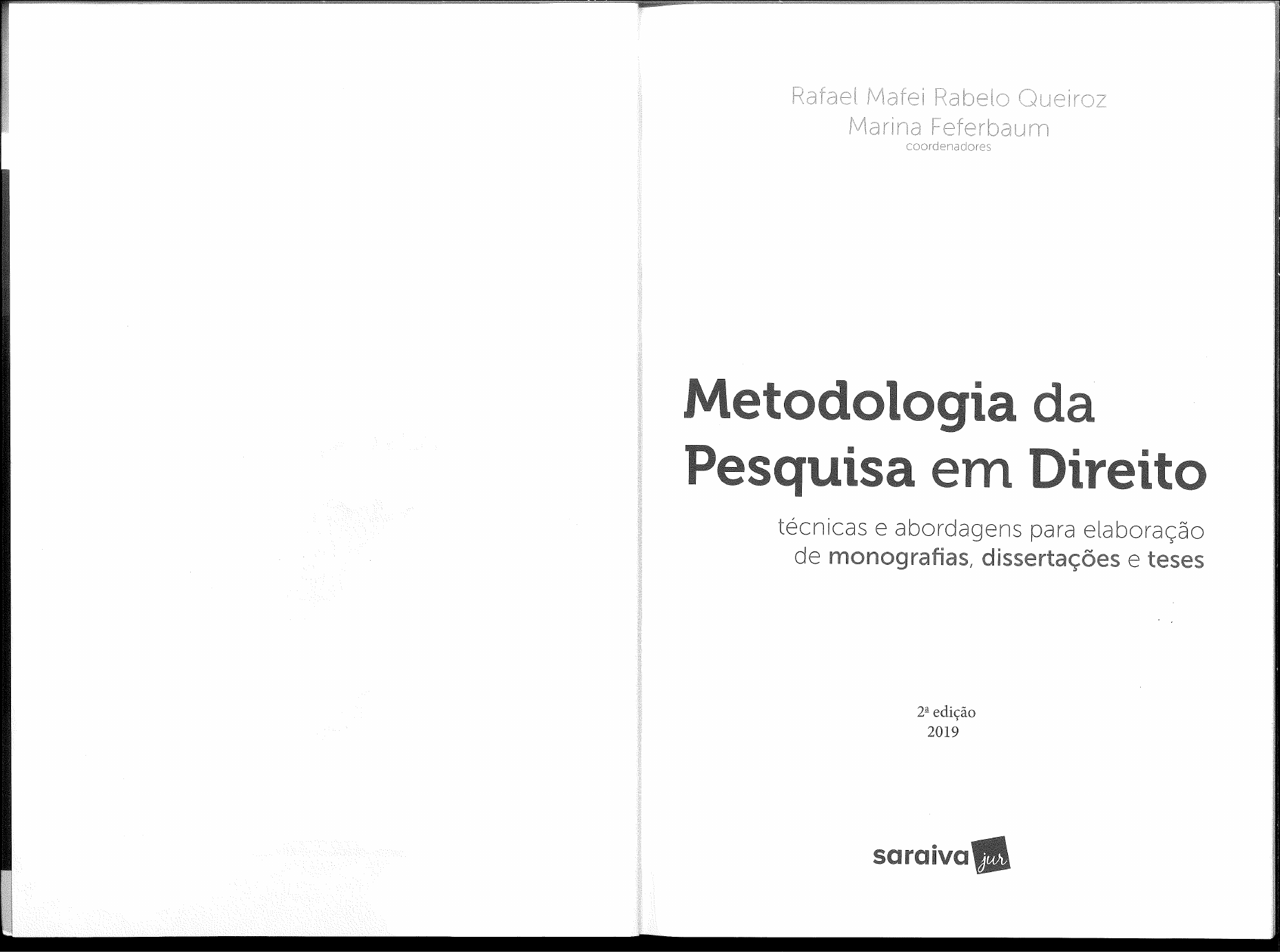 Rafael Mafei Rabelo Queiroz Marina Feferbaum coordenadores Metodologia da Pesquisa em Direito técnicas e abordagens para elaboração de monografias, dissertações e teses edição 2019 saraiva jurISBN 978-85-536-1249-9 APRESENTAÇÃO À EDIÇÃO DADOS INTERNACIONAIS DE CATALOGAÇÃO NA PUBLICAÇÃO (CIP) ANGÉLICA ILACQUA CRB-8/7057 Metodologia da pesquisa em direito técnicas e aborda- gens para elaboração de monografias, dissertações e teses / saraiva coordenadores: Marina Feferbaum, Rafael Mafei Rabelo Quei- saraiva EDUCAÇÃO roz. 2. São Paulo Saraiva, 2019. Av. Doutora Ruth Cardoso, 7.221, andar, Setor Título anterior: Metodologia jurídica : um roteiro prático Pinheiros São Paulo SP CEP 05425-902 para trabalhos de conclusão de curso. 1. Pesquisa jurídica Metodologia 2. Redação forense 3. Redação técnica Feferbaum, Marina II. Queiroz, Rafael Mafei SAC sac.sets@somoseducacao.com.br Rabelo. CDU 340.115 Este livro deveria ser uma segunda edição de nossa obra anterior Metodologia 19-1018 um roteiro prático para trabalhos de conclusão de curso (Série GVlaw, Ed. Sarai- Índice para catálogo sistemático: 1. Pesquisa jurídica Metodologia 340.115 va, 2012). O primeiro livro foi escrito com um propósito bastante específico: servir Direção executiva Flávia Alves Bravin como manual de pesquisa jurídica para alunos de pós-graduação lato sensu. Esse ob- Direção editorial Renata Pascual Müller Gerência editorial Roberto Navarro jetivo determinou as características fundamentais da obra: textos curtos, eminente- Gerência de produção Ana Paula Santos Matos mente práticos, voltados às dificuldades cotidianas de pesquisadoras e pesquisadores e planejamento Gerência de projetos e Fernando Penteado com baixa experiência acadêmica e pouca disponibilidade de tempo (porque, geral- serviços editoriais mente, dividem seu tempo de dedicação à pós-graduação com carreira e família). Consultoria acadêmica Murilo Angeli Dias dos Santos A recepção da obra, porém, foi muito além do que esperávamos: em pouco tem- po tivemos notícia de que livro se tornara leitura obrigatória não apenas em cursos Planejamento Clarissa Boraschi Maria (coord.) de especialização, mas também de graduação e de pós-graduação stricto sensu em todo Novos projetos Melissa Rodriguez Arnal da Silva Leite Brasil. Acreditamos que esse resultado deveu-se tanto às suas características edito- riais únicas (simplicidade, viés prático, apelo visual dos textos e quadros), quanto, e Edição Eveline Gonçalves Denardi (coord.) Daniel Pavani Naveira principalmente, à qualidade das autoras e autores que contribuíram com capítulos Data de fechamento da edição: 12-7-2019 excepcionais dentro de seus temas de expertise. Produção editorial Luciana Cordeiro Shirakawa A ampla aceitação daquele livro nos animou a publicar uma segunda edição, Dúvidas? Acesse www.editorasaraiva.com.br/direito Arte digital Mônica Landi (coord.) melhorada no que fosse possível. Contudo, sete anos nos separam desde a primeira Amanda Mota Loyola Nenhuma parte desta publicação poderá ser reproduzida por publicação e, ao longo desse período, direito mudou muito, em diversos aspectos. Camilla Felix Cianelli Chaves Claudirene de Moura Santos Silva qualquer meio ou forma sem a prévia autorização da Editora Enfrentar novos paradigmas, ocasionados pelo impacto da tecnologia no modo como Saraiva. A violação dos direitos autorais é crime estabelecido Deborah Mattos na Lei n. 9.610/98 e punido pelo art. 184 do Código Penal. se pesquisa e se faz direito, trouxe a necessidade de revisar métodos, técnicas e te- Fernanda Matajs mas para atender a um mundo que está em constante transformação. Guilherme H. M. Salvador CL 605903 CAE 659138 Tiago Dela Rosa Após muito tempo de trabalho, notamos que as melhoras haviam sido tantas que não faria sentido a publicação da nova obra como segunda edição. Daí a opção Projetos e serviços editoriais Juliana Bojczuk Fermino por um novo livro, mais ambicioso que anterior: ele pretende ser um manual de Kelli Priscila Pinto referência para pesquisas para qualquer nível acadêmico no direito inclusive o mes- Marília Cordeiro Mônica Gonçalves Dias trado profissional, objeto de um capítulo próprio (Capítulo 3). Tantas mudanças re- comendavam, ainda, a publicação deste novo produto fora de sua coleção editorial de Projeto gráfico Fernanda Matajs origem. Os editores, felizmente, concordaram com nossa decisão. Diagramação Muiraquitã Editoração Gráfica Revisão Daniela Georgeto Além das muitas mudanças em capítulos que estavam no livro anterior, alguns Tiago Dela Rosa deles inteiramente reescritos como capítulo de pesquisa na internet, agora mais Produção gráfica Marli Rampim voltado a técnicas aplicadas de busca em vários portais acadêmicos esta nova obra Sergio Luiz Pereira Lopes Impressão e acabamento Gráfica Paym traz importantes acréscimos. Além do já mencionado capítulo sobre a pesquisa no mestrado profissional, há um capítulo inteiramente dedicado à integridade acadêmicaAPONTAMENTOS SOBRE A REDAÇÃO TEXTO DO TRABALHO ACADÊMICO RAFAEL MAFEI RABELO QUEIROZ¹ MARINA 1. É PRECISO SABER AONDE SE QUER CHEGAR Uma vez definido tipo de pesquisa que se quer fazer, e depois de executado levantamento de dados, além de seu re- gistro e interpretação consoante as necessidades da investiga- ção, chega, enfim, momento da redação do texto. A última parte deste livro cuidará dessa etapa por meio de dois capítu- los. O próximo capítulo abordará aspectos formais de pre- paração do trabalho: elementos pré-textuais, textuais e pós- -textuais, além de regras para citação e referência bibliográfica de textos e documentos utilizados pelo autor. Já este capítulo cuidará de um trabalho anterior à formatação, e que represen- ta, na verdade, coração do processo de redação do trabalho 1 Livre-docente em Dir