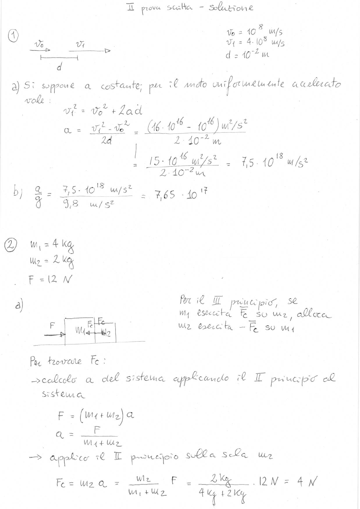 II prova - solutione 1 Vo = m/s Vo = 4.108 m/s d = d a) Si suppone a costante; per il moto uniformemente accelerato = + 2ad a = - = - 2d m = = b) a = = 7,65 g 9,8 2 m, = 4 kg = 2 kg F = 12 N a) Per il III principio, se m1 eseccita SU m2, alloca F Fc Fc M14 esercita - Fc SU m1 Per calcolo a del sistema il II principio al sistema F = a a = F applico il II principio sulla Fc = m2 a = F = 2 kg 12 N = 4 N m, + 4 kgb) Si procede in modo analogo al caso 'acceleratione del sistema a, rimane la stessa (in Per Fc applico il II principio alla F a = m1 M2 + Fc Fc F Fc = a = F = 4 Kg 12 N = 8 N 2 + 4 m 3 h = 3 m mg m = 20 key h a) Durante la salita, il lavoro dalla di gravita e negativo Lg = - = - mgh + = - = - 20 kg 98 3m = - 588 J b) Se AUg venisse convertito interamente in energia cinetica dell AK = = 588 J 2 = = 2 AUg v' = 2 Aug = = 7,67 m/s m m c) realta 20 L = AK - Lg - La =La = = 588J - = - 2 = 4 P acqua = 1 S mg mg in in acqua aria, il peso dato da mg spinta ) dell' acqua, il peso apparente dato da mg + in modulo S. Sappiamo che peso in aria = mg = K = 1,36 peso in S mg = k s) (I) m = (II) S = Vc g con Vc = Vr + Va aria campione roccia chiede Va Vc Ricavo S dalla (I): mg = - - = - KS mg = S (II) I S = mg (K-1) = prVr g (K-1)Confeonto l'espressione per S COST ottenuta con la (III) S= = + = pr Vr g (K-1) questa equatione usando Vc = Vr + Va = (Vc-Va) K Risolvo in : Vc K-1 = (1 for K-1 = Vc for K-1 K = Va Vc Si ha infine: Va Vc = K-1 K = 5.2 1 1.36 0.36 = - 0,726 = 0,284 = 28,4%