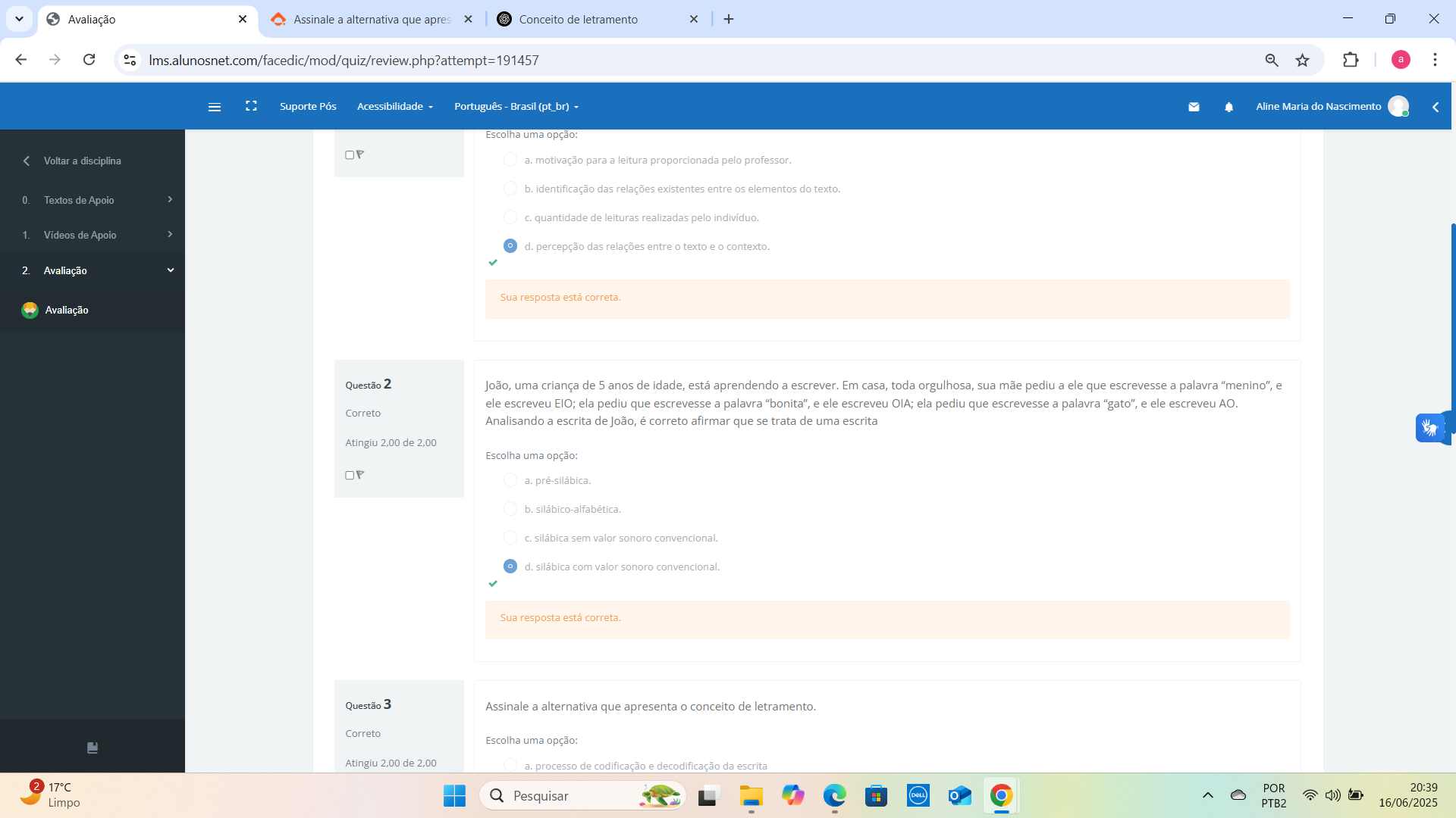 Avaliação Assinale a alternativa que apres Conceito de letramento + X Ims.alunosnet.com/facedic/mod/quiz/review.php?attempt=191457 a : Suporte Pós Acessibilidade Português Brasil (pt_br) Aline Maria do Nascimento Escolha uma opção: P Voltar a disciplina a. motivação para a leitura proporcionada pelo professor. b. identificação das relações existentes entre os elementos do texto. 0. Textos de Apoio > C. quantidade de leituras realizadas pelo indivíduo. 1. Vídeos de Apoio > d. percepção das relações entre 0 texto e contexto. 2. Avaliação Sua resposta está correta. Avaliação Questão 2 João, uma criança de 5 anos de idade, está aprendendo a escrever. Em casa, toda orgulhosa, sua mãe pediu a ele que escrevesse a palavra "menino", e ele escreveu EIO; ela pediu que escrevesse a palavra "bonita", e ele escreveu OIA; ela pediu que escrevesse a palavra "gato", e ele escreveu AO. Correto Analisando a escrita de João, é correto afirmar que se trata de uma escrita Atingiu 2,00 de 2,00 Escolha uma opção: a. pré-silábica. b. silábico-alfabética. C. silábica sem valor sonoro convencional. d. silábica com valor sonoro convencional. Sua resposta está correta. Questão 3 Assinale a alternativa que apresenta 0 conceito de letramento. Correto Escolha uma opção: Atingiu 2,00 de 2,00 a. processo de codificação e decodificação da escrita 2 17°C POR 20:39 Pesquisar Limpo PTB2 16/06/2025
