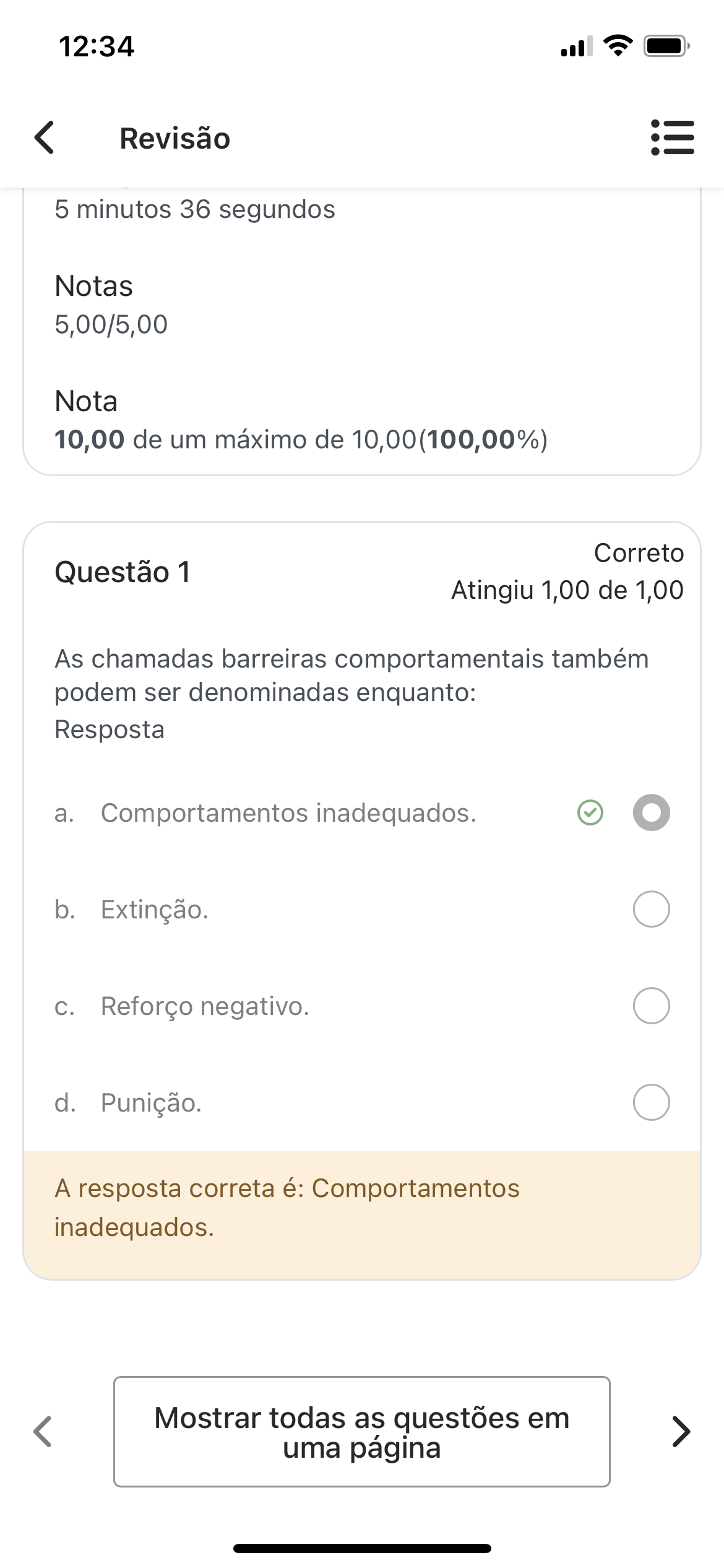 12:34 Revisão 5 minutos 36 segundos Notas 5,00/5,00 Nota 10,00 de um máximo de 10,00(100,00%) Correto Questão 1 Atingiu 1,00 de 1,00 As chamadas barreiras comportamentais também podem ser denominadas enquanto: Resposta a. Comportamentos inadequados. b. Extinção. Reforço negativo. d. Punição. A resposta correta é: Comportamentos inadequados. Mostrar todas as questões em uma página