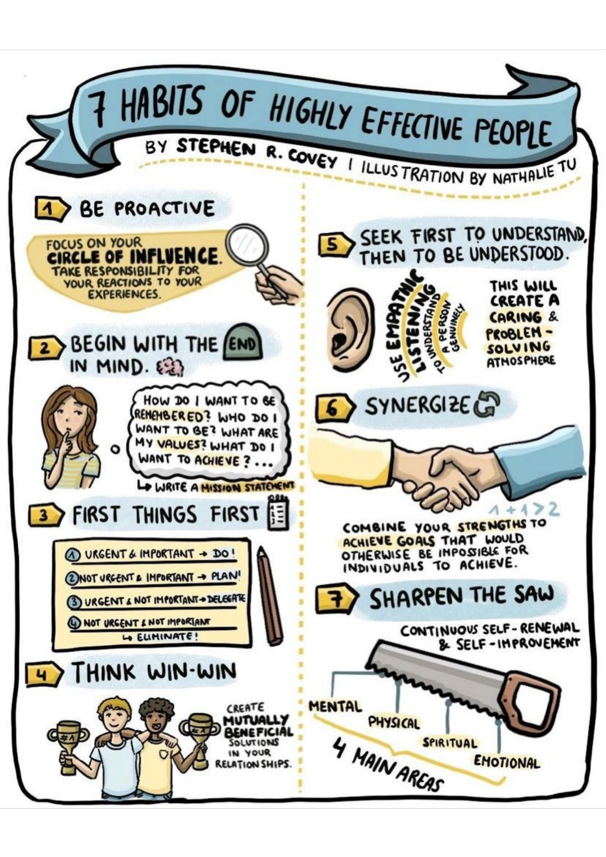 7 HABITS OF HIGHLY EFFECTIVE PEOPLE BY STEPHEN R. COVEY 1 ILLUS TRATION BY NATHALIE TU 1 BE PROACTIVE FOCUS ON YOUR 5 SEEK FIRST TO UNDERSTAND, CIRCLE OF INFLUENCE. THEN TO BE UNDERSTOOD. TAKE RESPONSIBILITY FOR YOUR REACTIONS TO YOUR THIS WILL EXPERIENCES. BEGIN WITH THE END USE EMPA GENUINELY PERSON UNDERSTAND CREATE A CARING & PROBLEM - 2 A SOLVING IN MIND. ATMOSPHERE How DO I WANT TO BE 6 SYNERGIZE REMEMBERED? WHO DO I WANT TO BE? WHAT ARE MY VALUES? WHAT DO I WANT TO ACHIEVE ? WRITE A MISSION STATEMENT 3 FIRST THINGS FIRST 1+1>2 COMBINE YOUR STRENGTHS TO ACHIEVE GOALS THAT WOULD 1 URGENT & IMPORTANT DO! OTHERWISE BE IMPOSSIBLE FOR INDIVIDUALS TO ACHIEVE. 2 NOT URGENT & IMPORTANT PLAN! 3 URGENT & NOT IMPORTANT-DELEGATE 7 SHARPEN THE SAW J NOT URGENT & NOT IMPORTANT CONTINUOUS SELF- RENEWAL ELIMINATE! & SELF - IMPROVEMENT 4 THINK WIN-WIN CREATE MENTAL MUTUALLY PHYSICAL BENEFICIAL SOLUTIONS IN YOUR RELATION SHIPS. 4 MAIN AREAS SPIRITUAL EMOTIONAL