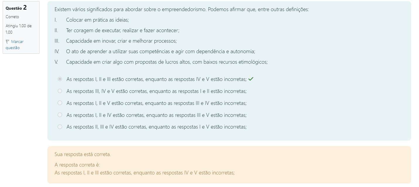 Questão 2 Existem vários significados para abordar sobre empreendedorismo. Podemos afirmar que, entre outras definições: Correto I. Colocar em prática as ideias; Atingiu 1,00 de II. Ter coragem de executar, realizar e fazer acontecer; Marcar III. Capacidade em inovar, criar e melhorar processos; questão IV. ato de aprender a utilizar suas competências e agir com dependência e autonomia; V. Capacidade em criar algo com propostas de lucros altos, com baixos recursos etimológicos; As respostas I, e III estão corretas, enquanto as respostas IV e V estão incorretas;