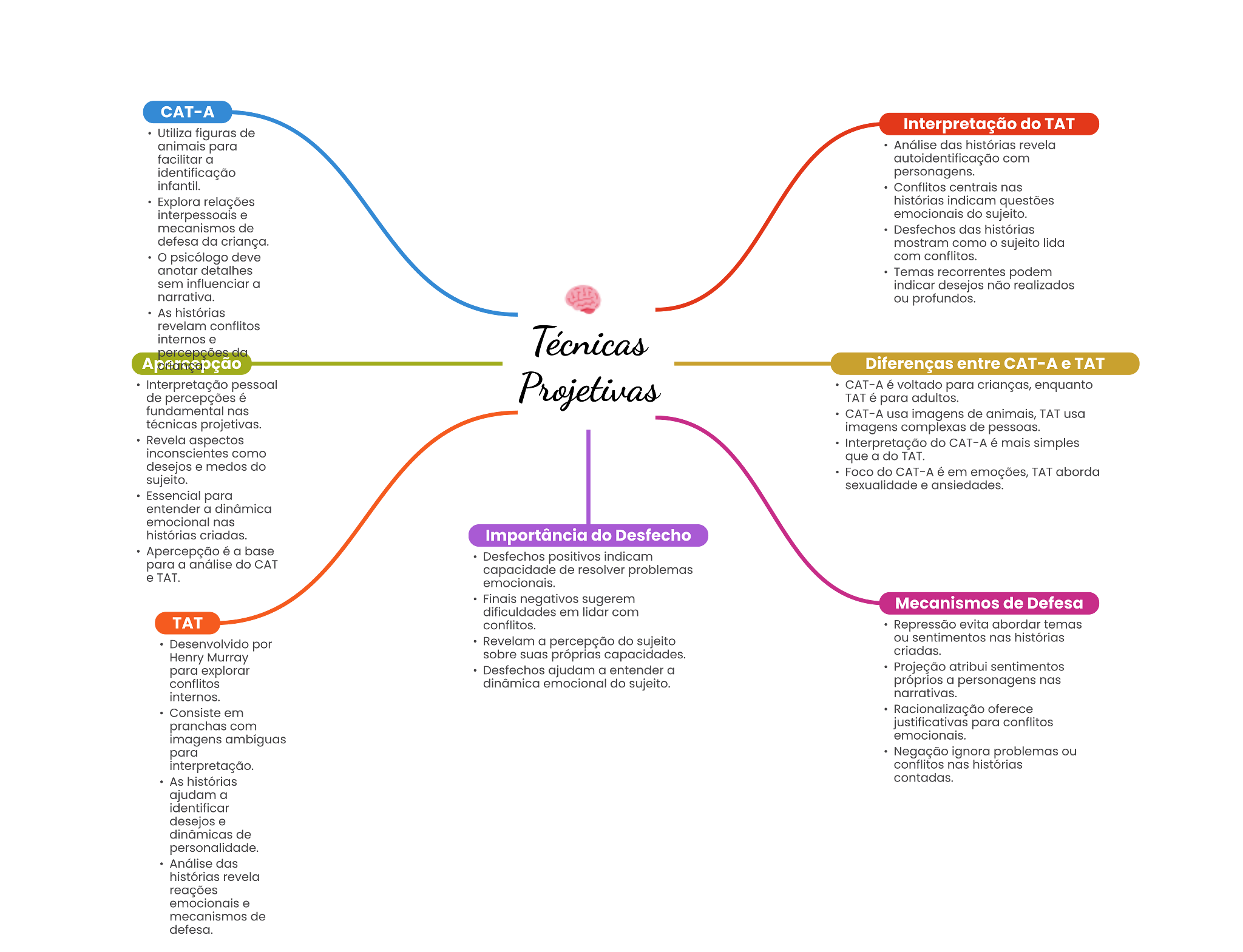 CAT-A Utiliza figuras de Interpretação do TAT para facilitar a com identificação personagens. nas Explora relações questões do de Desfechos das histórias da criança. mostram como lida com Ternas recorrentes podem sem a indicar desejos não narrativa. ou profundos. Diferenças entre CAT-A e TAT pessoal CAT-A é voltado para crianças, enquanto de percepções é TAT é para adultos. fundamental nas CAT-A usa imagens de TAT usa técnicas projetivas. imagens complexas de Revela interpretação do CAT-A simples como que a do TAT. desejos medos do Foco do CAT-A em emoções, TAT aborda . para entender a dinâmica emocional nas histórias criadas. Importância do Desfecho Apercepção a base Desfechos positivos indicam para a do CAT TAT. capacidade de resolver problemas emocionals. Finais negativos Mecanismos de Defesa em lidar com TAT evita abordar temas Desenvolvido por Revelam a perospção do sujeito ou sentimentos nas Henry Murray sobre próprias capacidades. criadas. para explorar ajudam a entender a Projeção atribul sentimentos emocional do a personagene nas narrativas. Consiste em oferece pranchas com justificativas para para Negação problemas ou nas As ajudam a identificar . dinâmicas de personalidade. Análise das de defesa.