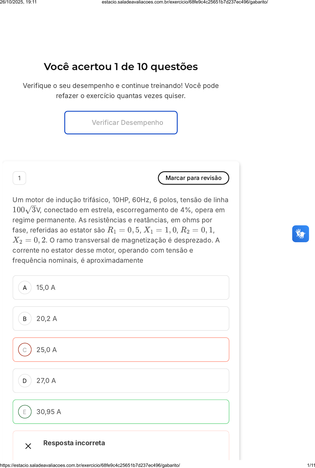 Você acertou 1 de 10 questões Verifique o seu desempenho e continue treinando! Você pode refazer o exercício quantas vezes quiser. Verificar Desempenho A B C D E 1 Marcar para revisão Um motor de indução trifásico, 10HP, 60Hz, 6 polos, tensão de linha V, conectado em estrela, escorregamento de 4%, opera em regime permanente. As resistências e reatâncias, em ohms por fase, referidas ao estator são , , , . O ramo transversal de magnetização é desprezado. A corrente no estator desse motor, operando com tensão e frequência nominais, é aproximadamente 100√3 R1 = 0, 5 X1 = 1, 0 R2 = 0, 1 X2 = 0, 2 15,0 A 20,2 A 25,0 A 27,0 A 30,95 A Resposta incorreta 26/10/2025, 19:11 estacio.saladeavaliacoes.com.br/exercicio/68fe9c4c25651b7d237ec496/gabarito/ https://estacio.saladeavaliacoes.com.br/exercicio/68fe9c4c25651b7d237ec496/gabarito/ 1/11 A B C D E Opa! A alternativa correta é a letra E. Confira o gabarito comentado! Gabarito Comentado Gabarito: 30,95 A Justificativa: Como o ramo transversal (de magnetização) é desprezado, o circuito equivalente resume-se a uma impedância em série de todos os parâmetros, que já estão referidos ao estator. A corrente de estator será: 2 Marcar para revisão (CEPERJ / 2011) O rotor de um determinado motor de indução trifásico, 60 Hz e quatro polos, consome 120 KW a 3 Hz. Se as perdas rotacionais forem de 2 KW, a potência mecânica na saída será de: 108 KW 110 KW 112 KW 114 KW 116 KW Resposta incorreta Opa! A alternativa correta é a letra C. Confira o gabarito comentado! 26/10/2025, 19:11 estacio.saladeavaliacoes.com.br/exercicio/68fe9c4c25651b7d237ec496/gabarito/ https://estacio.saladeavaliacoes.com.br/exercicio/68fe9c4c25651b7d237ec496/gabarito/ 2/11 A B C D E Gabarito Comentado Gabarito: 112 KW Justificativa: Para calcular a potência mecânica na saída, primeiro deve-se calcular o escorregamento: Calculando a potência mecânica: 3 Marcar para revisão (Petrobrás / 2010) Caso o rotor de um motor de indução fosse capaz de atingir sua velocidade síncrona, Seu escorregamento valeria 1(um). Seu torque atingiria o máximo valor teoricamente calculado. A frequência da tensão induzida nas bobinas do rotor seria igual à frequência da rede. A tensão induzida nas bobinas do rotor seria igual a zero. A tensão induzida nas bobinas do estator seria igual à sua tensão de alimentação. Resposta incorreta Opa! A alternativa correta é a letra D. Confira o gabarito comentado! 26/10/2025, 19:11 estacio.saladeavaliacoes.com.br/exercicio/68fe9c4c25651b7d237ec496/gabarito/ https://estacio.saladeavaliacoes.com.br/exercicio/68fe9c4c25651b7d237ec496/gabarito/ 3/11 A B C D E Gabarito Comentado Gabarito: A tensão induzida nas bobinas do rotor seria igual a zero. Justificativa: Se o rotor de um motor de indução atingisse sua velocidade síncrona, o escorregamento seria nulo, ou seja, não haveria diferença entre a velocidade do campo magnético e a velocidade do rotor. Como o escorregamento é o que gera o torque no motor, se ele fosse nulo, o torque também seria zero. Além disso, a frequência da tensão induzida no rotor é diretamente proporcional ao escorregamento. Portanto, se o escorregamento fosse zero, a frequência da tensão induzida também seria zero. Isso significa que a tensão induzida nas bobinas do rotor seria igual a zero, conforme indicado na alternativa D. 4 Marcar para revisão (Cesgranrio / 2012) Um motor de indução de oito polos é alimentado por uma rede elétrica cuja frequência é de 50Hz. O motor aciona uma carga, e sua velocidade de rotação é constante e igual a 705RPM. O valor do escorregamento desse motor é: 3,7% 4,0% 5,3% 6,0% 6,4% Resposta incorreta 26/10/2025, 19:11 estacio.saladeavaliacoes.com.br/exercicio/68fe9c4c25651b7d237ec496/gabarito/ https://estacio.saladeavaliacoes.com.br/exercicio/68fe9c4c25651b7d237ec496/gabarito/ 4/11 A B C D E Opa! A alternativa correta é a letra D. Confira o gabarito comentado! Gabarito Comentado Gabarito: 6,0% Justificativa: Primeiro deve-se calcular a velocidade síncrona do campo girante: O escorregamento será dado por: 5 Marcar para revisão Um ensaio CC é realizado em um motor de indução ligado em . Os valores medidos foram e . Nesse motor, o valor da resistência de estator é de: Δ VCC = 36V ICC = 54A 0,24 Ω 0,44 Ω 0,92 Ω 0,73 Ω 0,66 Ω 26/10/2025, 19:11 estacio.saladeavaliacoes.com.br/exercicio/68fe9c4c25651b7d237ec496/gabarito/ https://estacio.saladeavaliacoes.com.br/exercicio/68fe9c4c25651b7d237ec496/gabarito/ 5/11 A B C D E Resposta incorreta Opa! A alternativa correta é a letra E. Confira o gabarito comentado! Gabarito Comentado Gabarito: 0,66 Ω Justificativa: Se o enrolamento de armadura do motor está ligado em delta, a resistência de estator será dada por: 6 Marcar para revisão (FUNCAB / 2012) Um motor de indução trifásico, 60Hz, opera na velocidade nominal de 850RPM. O deslizamento desse motor (em %) é de: 4,95 5,56 7,06 8,50 9,17 Questão 7 de 10 Corretas (1) Incorretas (9) Em branco (0) 1 2 3 4 5 6 7 8 9 10 Lista de exercícios Arquitetura Da… Sair 26/10/2025, 19:11 estacio.saladeavaliacoes.com.br/exercicio/68fe9c4c25651b7d237ec496/gabarito/ https://estacio.saladeavaliacoes.com.br/exercicio/68fe9c4c25651b7d237ec496/gabarito/ 6/11 A B C Resposta incorreta Opa! A alternativa correta é a letra B. Confira o gabarito comentado! Gabarito Comentado Gabarito: 5,56 Justificativa: A velocidade síncrona do motor será de: Para atingir uma velocidade de aproximadamente (e maior) a velocidade do rotor, essa máquina deve possuir 8 polos: O escorregamento será dado por: 7 Marcar para revisão (FGV / 2013) Um motor de indução possui 4 polos e opera na frequência de 60 Hz. A velocidade do campo magnético girante, em RPM, é igual a: 1200 1500 1800 26/10/2025, 19:11 estacio.saladeavaliacoes.com.br/exercicio/68fe9c4c25651b7d237ec496/gabarito/ https://estacio.saladeavaliacoes.com.br/exercicio/68fe9c4c25651b7d237ec496/gabarito/ 7/11 D E A B 