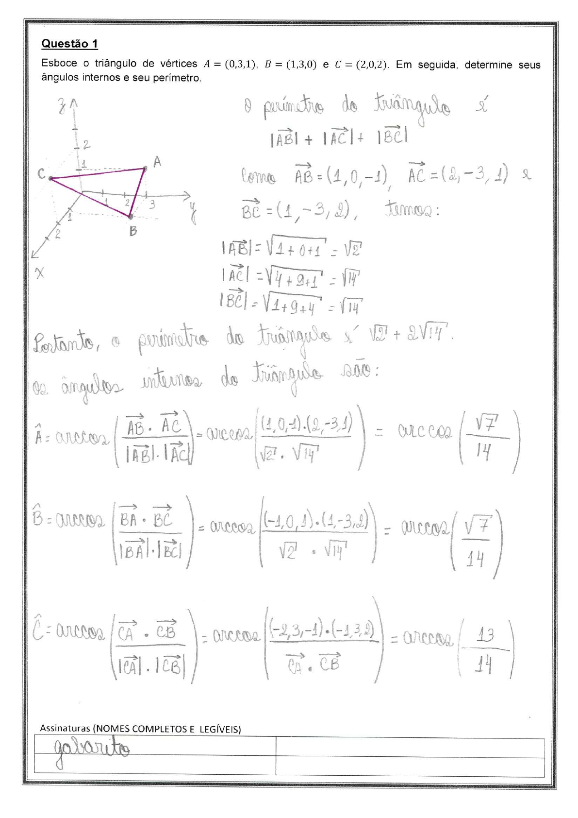 Questão 1 Esboce triângulo de vértices A = (0,3,1), B = (1,3,0) e C = (2,0,2). Em seguida, determine seus ângulos internos e seu perímetro. perimetro do triangulo & 2 + 1 A AB = (1,0,-1), AC = l 2 3 1 BC = (1, -3,2), 2 B ABI = V 1+0+1 = = 4+9+1 = = 1+9+4 = V14 Portanto, perimetro do + angulos internos do AB. AC (1,0,1).(2,-3,1) = are V7 = AC 14 B = arcos BA BC = arccos - = arccos V7 V14 14 CA CB = = 13 CA CB 14 Assinaturas (NOMES COMPLETOS E LEGÍVEIS) gabaritoQuestão 2 Esboce o tetraedro de vértices A = (0,3,1), B = (1,3,0), C = (2,0,2) e D = (1,1,1). Em seguida, utilize os produtos entre vetores convenientes para determinar a área de sua superfície e seu volume. rolume do 3 = AB. 2 C 1 A 6 A R 3 1 Y Como AB = (1,0,-1), AC = (2,-3,1) B 1 AD = 3 K i j K X ACX AD 2-31 = AB. = 1-20 = 3 Portanto, volume do tetraedro 2 1 de volume. A area do superficie do tetraedro a soma das de suas faces, que triangulos. Assim, As: = + 2 2 2 2 Como i j K i K AB 10-1 = (-3,-3,-3), AB AD = = 1, 2), 1-20 i j K BC BD = = AB AC = 3V3, ABX AD =3, 0-21 ACX AD = X = V6, temos As = + 3 + 2V6 unidades de AREA 20 Assinaturas (NOMES COMPLETOS E LEGÍVEIS)