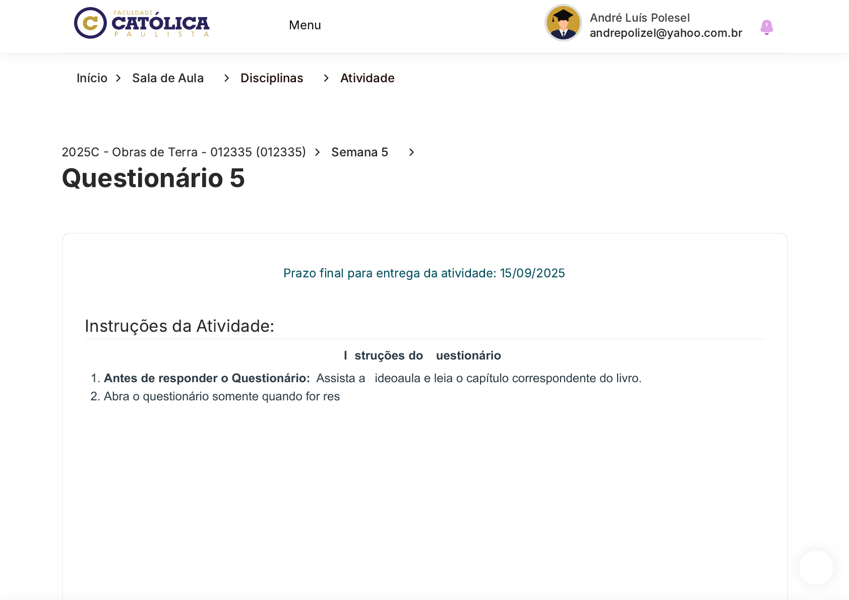 Início 〉 Sala de Aula 〉 Disciplinas 〉 Atividade 2025C - Obras de Terra - 012335 (012335) 〉 Semana 5 〉 Questionário 5 Instruções da Atividade: Prazo final para entrega da atividade: 15/09/2025 Instruções do Questionário: 1. Antes de responder o Questionário: Assista a videoaula e leia o capítulo correspondente do livro. 2. Abra o questionário somente quando for responder; 3. Ao abrir o questionário você terá 4 questões para responder; 4. Leia com calma todas as questões e entenda o que pede a questão: se pede a incorreta, a correta e qual o tema da questão; 5. Lembre-se de Clicar no botão "Enviar"; 6. Você tem duas tentativas para fazer o teste, a segunda tentativa é opcional; 7. Lembre-se que as respostas mudam de lugar em cada tentativa; 8. As respostas corretas só aparecem após o envio da segunda tentativa; 9. O sistema considera a maior nota entre as duas tentativas; 10. Lembre-se que na segunda tentativa zera TODAS as questões, inclusive as que você acertou na primeira tentativa. Bons estudos! Menu André Luís Polesel andrepolizel@yahoo.com.br https://ava.uca.edu.br/aluno/sala-de-aula/disciplina/modulo/atividade/487605 https://ava.uca.edu.br/aluno/sala-de-aula/disciplina/modulo/atividade/487605 https://ava.uca.edu.br/aluno/sala-de-aula/disciplina https://ava.uca.edu.br/aluno/sala-de-aula/disciplina/modulo/atividade/:id/:nome https://api.whatsapp.com/send?phone=5514988263000&text=Suporte javascript:void(0); javascript:void(0) javascript:void(0) Primeira Tentativa 4EB52F2F-0759-6978-127A-FF045CE5BB4B -- Nota Automática -- Nota Final: 0,400 de 0,400 pontos andrepolizel@yahoo.com.br - 12/08/2025 23:36:11 Visualizar Entrega Fazer Segunda Tentativa Perguntas Pergunta 1. Pergunta 2. Pergunta 3. Pergunta 4. pontos: 0,100Pergunta 1. Avaliação Menu André Luís Polesel andrepolizel@yahoo.com.br https://api.whatsapp.com/send?phone=5514988263000&text=Suporte javascript:void(0); javascript:void(0) javascript:void(0) Os deslizamentos nas encostas, destacam-se como uma das principais formas e processos de movimentos de massa. Os movimentos de massa mais importantes e bastante comuns nas áreas urbanas de encostas do Sudeste e Sul do Brasil são: Múltipla Escolha: A. Os Rastejos, que se caracterizam por movimentos muito rápidos e por uma alta complexidade dos processos de transporte de materiais. B. As Avalanches de detritos, que se caracterizam por movimentos lentos de solo e rocha de regiões montanhosas úmidas. C. As Quedas de blocos, que se caracterizam por movimentos rápidos de blocos caindo pela ação da gravidade na presença de uma superfície bem definida de deslizamentos, indiferente aos processos de intemperismo físico e químico. D. As Corridas (ou fluxos), que se caracterizam por movimentos lentos; os materiais se comportam como fluidos de alta viscosidade. Estão geralmente associados à baixa concentração dos fluxos de água superficiais em algum ponto da encosta. E. Os Escorregamentos, que se caracterizam por movimentos rápidos, de curta duração, com plano de ruptura bem definido; são classificados como rotacionais (slumps) ou translacionais. Nota Avaliada: 0,100 de 0,100 Menu André Luís Polesel andrepolizel@yahoo.com.br https://api.whatsapp.com/send?phone=5514988263000&text=Suporte javascript:void(0); javascript:void(0) javascript:void(0) pontos: 0,100Pergunta 2. O que mais provoca fatalidades no Brasil são os deslizamentos em áreas serranas, como os que acontecem no Estado do Rio de Janeiro, Estes movimentos são caracterizados pela ocorrência de diversos desastres naturais e com alto poder destrutivo: Múltipla Escolha: A. Rastejo. B. Fluxo de lama. C. Tombamentos. D. Subsidência. E. Rolamentos. pontos: 0,100Pergunta 3. A análise de estabilidade dos taludes tem como principal objetivo impedir a movimentação das massas e evitar a instabilidade. Pode-se dizer que a instabilidade é deflagrada quando as Avaliação Nota Avaliada: 0,100 de 0,100 Avaliação Nota Avaliada: 0,100 de 0,100 Menu André Luís Polesel andrepolizel@yahoo.com.br https://api.whatsapp.com/send?phone=5514988263000&text=Suporte javascript:void(0); javascript:void(0) javascript:void(0) tensões cisalhantes se igualam a resistência ao cisalhamento. Conforme pode-se observar na imagem abaixo. Analise as alternativas abaixo: Fonte: https://images.app.goo.gl/u3GJcHzGaTtmMHqh6 Links para um site externo. I – A análise de estabilidade de taludes avalia a superfície potencial de ruptura através de métodos de equilíbrio-limite. II - Pode-se expressar o fator de segurança como relação entre a tensão de cisalhante(atuante) dividido pela resistência ao cisalhamento (resistentes). III – Os métodos probabilísticos expressam a análise de ruptura através do estabelecimento do FS (fator de segurança) e no determinístico é quantificado o FS a partir de incertezas. IV – O coeficiente de segurança determinada a condição do talude através do nível de segurança para vida humana e ambiental. V – Para adotar um dos diferentes métodos de cálculo de estabilidade, é necessário conhecer somente o FS. Qual alternativa está correta: Múltipla Escolha: A. III, IV, V. B. I, III, IV. C. II, IV, V. Menu André Luís Polesel andrepolizel@yahoo.com.br https://images.app.goo.gl/u3GJcHzGaTtmMHqh6 https://images.app.goo.gl/u3GJcHzGaTtmMHqh6 https://images.app.goo.gl/u3GJcHzGaTtmMHqh6 https://images.app.goo.gl/u3GJcHzGaTtmMHqh6 https://images.app.goo.gl/u3GJcHzGaTtmMHqh6 https://api.whatsapp.com/send?phone=5514988263000&text=Suporte javascript:void(0); javascript:void(0) javascript:void(0) D. II, III, V. E. I, II, IV. pontos: 0,100Pergunta 4. Os movimentos de massas que geram a desestabilização de talude geralmente dependem da natureza do material, da velocidade de movimentação e natureza do movimento. Os fatores internos que agem no talude são caracterizados pela diminuição da resistência interna do material do maciço, ou seja, aumentam a solicita