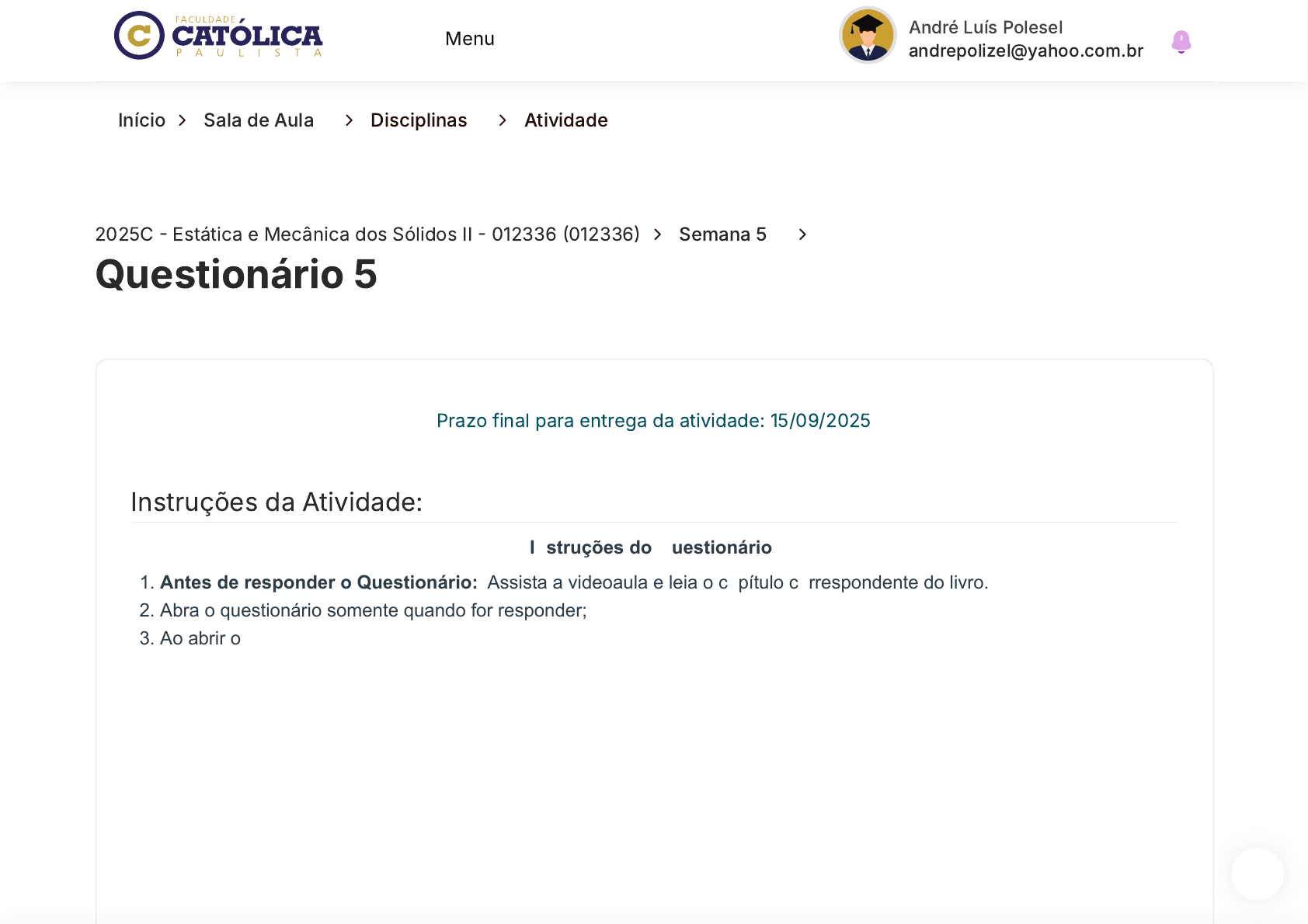 Início 〉 Sala de Aula 〉 Disciplinas 〉 Atividade 2025C - Estática e Mecânica dos Sólidos II - 012336 (012336) 〉 Semana 5 〉 Questionário 5 Instruções da Atividade: Prazo final para entrega da atividade: 15/09/2025 Instruções do Questionário: 1. Antes de responder o Questionário: Assista a videoaula e leia o capítulo correspondente do livro. 2. Abra o questionário somente quando for responder; 3. Ao abrir o questionário você terá 4 questões para responder; 4. Leia com calma todas as questões e entenda o que pede a questão: se pede a incorreta, a correta e qual o tema da questão; 5. Lembre-se de Clicar no botão "Enviar"; 6. Você tem duas tentativas para fazer o teste, a segunda tentativa é opcional; 7. Lembre-se que as respostas mudam de lugar em cada tentativa; 8. As respostas corretas só aparecem após o envio da segunda tentativa; 9. O sistema considera a maior nota entre as duas tentativas; 10. Lembre-se que na segunda tentativa zera TODAS as questões, inclusive as que você acertou na primeira tentativa. Bons estudos! Menu André Luís Polesel andrepolizel@yahoo.com.br https://ava.uca.edu.br/aluno/sala-de-aula/disciplina/modulo/atividade/486741 https://ava.uca.edu.br/aluno/sala-de-aula/disciplina/modulo/atividade/486741 https://ava.uca.edu.br/aluno/sala-de-aula/disciplina https://ava.uca.edu.br/aluno/sala-de-aula/disciplina/modulo/atividade/:id/:nome https://api.whatsapp.com/send?phone=5514988263000&text=Suporte javascript:void(0); javascript:void(0) javascript:void(0) Primeira Tentativa E401EE82-F448-4152-A633-8AF00DC15918 -- Nota Automática -- Nota Final: 0,300 de 0,400 pontos andrepolizel@yahoo.com.br - 12/08/2025 22:09:36 Visualizar Entrega Segunda Tentativa 9870F469-84F3-BA97-21D8-15B5AA6A9761 -- Nota Automática -- Nota Final: 0,300 de 0,400 pontos andrepolizel@yahoo.com.br - 12/08/2025 22:55:00 Visualizar Entrega Perguntas Pergunta 1. Pergunta 2. Pergunta 3. Pergunta 4. pontos: 0,100Pergunta 1. Considerando o estado plano de deformações e dado os valores abaixo. Avaliação Menu André Luís Polesel andrepolizel@yahoo.com.br https://api.whatsapp.com/send?phone=5514988263000&text=Suporte javascript:void(0); javascript:void(0) javascript:void(0) εₓ = 120 εᵧ = -10 εₓᵧ = 10 θ = 10º Qual o valor da deformação principal mínima? Múltipla Escolha: A. -11,76 B. -12,76 C. -10,19 D. -13,76 E. -14,76 pontos: 0,100Pergunta 2. O aço quando submetido ao ensaio de tração no laboratório apresenta um patamar no gráfico de tensão por deformação em que a tensão permanece constante e a deformação continua aumentando. A este patamar em materiais dúcteis chamamos de…. Nota Avaliada: 0,000 de 0,100 Avaliação Nota Avaliada: Menu André Luís Polesel andrepolizel@yahoo.com.br https://api.whatsapp.com/send?phone=5514988263000&text=Suporte javascript:void(0); javascript:void(0) javascript:void(0) Múltipla Escolha: A. Ruptura B. Esfregamento C. Escoamento D. Esfacelamento E. Empoderamento pontos: 0,100Pergunta 3. Considerando o estado plano de deformações e dado os valores abaixo. εₓ = 120 εᵧ = -10 εₓᵧ = 10 θ = 10º Qual o valor da deformação principal máxima? Múltipla Escolha: 0,100 de 0,100 Avaliação Nota Avaliada: 0,100 de 0,100 Menu André Luís Polesel andrepolizel@yahoo.com.br https://api.whatsapp.com/send?phone=5514988263000&text=Suporte javascript:void(0); javascript:void(0) javascript:void(0) A. 150,76 B. 140,76 C. 130,76 D. 120,19 E. 160,76 pontos: 0,100Pergunta 4. O critério de ruptura da máxima tensão de cisalhamento prevê que o material não pode chegar até a tensão de…. Múltipla Escolha: A. Escoamento B. Esfacelamento C. Esfregamento Avaliação Nota Avaliada: 0,100 de 0,100 Menu André Luís Polesel andrepolizel@yahoo.com.br https://api.whatsapp.com/send?phone=5514988263000&text=Suporte javascript:void(0); javascript:void(0) javascript:void(0) D. Ruptura E. Empoderamento Fechar Visualização 〈 Voltar aos Módulos 〈 Anterior Próxima 〉 Faculdade Católica Paulista Contato Endereço Avenida Cristo Rei, 305 – Banzato Marília, São Paulo – CEP: 17515-200 Horário De Funcionamento Segunda a quinta, das 8:00 às 20:00 horas As sextas, das 8:00 às 18:00 horas. WhatsApp : (14) 9.8826-3000 Telefone Sede: (14) 3422-1815 Central de Atendimento: 0800 664 5583 E-mail : secretaria@uca.edu.br Menu André Luís Polesel andrepolizel@yahoo.com.br https://www.instagram.com/faculdadecatolicaead/ https://facebook.com/ucaead https://www.youtube.com/@UcaEduBr https://www.linkedin.com/school/faculdade-catolica-paulista/?originalSubdomain=br https://maps.app.goo.gl/wWsD9QX5fVPa3h6PA https://api.whatsapp.com/send?phone=5514988263000&text=Suporte tel:14-3422-1815 tel:14-3422-1815 tel:0800-664-5583 tel:0800-664-5583 mailto:secretaria@uca.edu.br https://api.whatsapp.com/send?phone=5514988263000&text=Suporte javascript:void(0); javascript:void(0) javascript:void(0) Menu André Luís Polesel andrepolizel@yahoo.com.br https://api.whatsapp.com/send?phone=5514988263000&text=Suporte javascript:void(0); javascript:void(0) javascript:void(0)