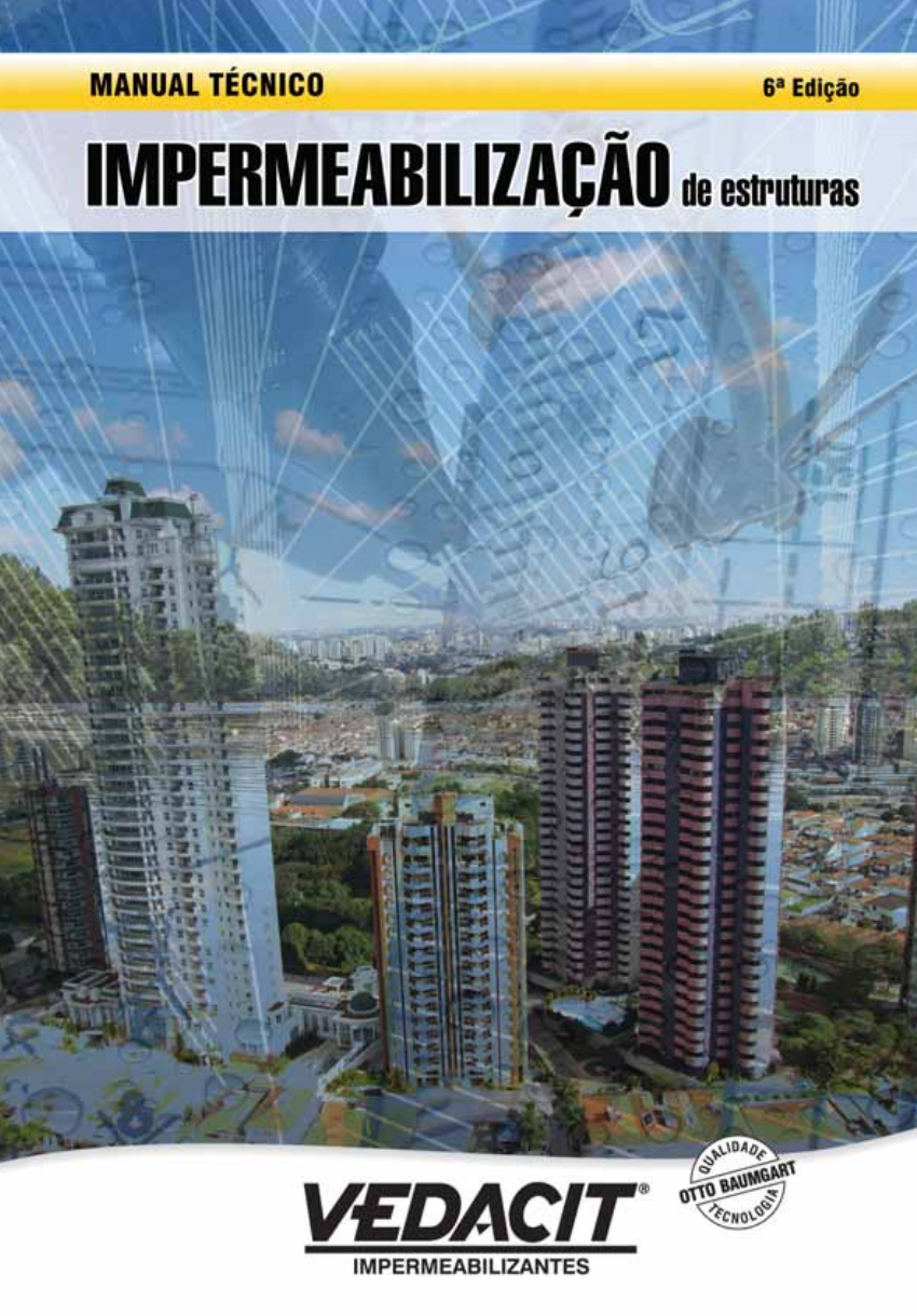 Impermeabilização de Estruturas - 1 2 Introdução ......................................................................................................................................................5 Histórico .........................................................................................................................................................6 1. Impermeabilização.....................................................................................................................................7 1.1 - Objetivo...............................................................................................................................................9 1.2 - Importância.........................................................................................................................................9 1.3 - Infiltração de água em construção por capilaridade e percolação......................................................9 Capilaridade.......................................................................................................................................9 Percolação.........................................................................................................................................9 Eflorescências.......................................................................................................................10 1.4 - Normas Técnicas..............................................................................................................................10 1.5 - Projeto de Impermeabilização..........................................................................................................10 1.6 - Equipamentos de Proteção Individual (EPI) e Ferramentas ..............................................................11 2. Sistemas utilizados em Impermeabilização...............................................................................................13 3. Sistema de Impermeabilização Rígido......................................................................................................17 Locais de Aplicação............................. .............................................................................................19 Argamassa com aditivo impermeabilizante........................................................................................19 Ponte de Aderência ..........................................................................................................................20 Argamassa Polimérica........................................................................................................................21 Concreto Impermeável .....................................................................................................................21 A impermeabilização rígida passo-a-passo .......................................................................................21 Precauções ........................................................................................................................................21 Impermeabilização de Alicerces..........................................................................................................................22 Impermeabilização de Paredes de encosta..........................................................................................................22 Impermeabilização de Pisos................................................................................................................................23 Impermeabilização de Paredes Externas..............................................................................................................24 Impermeabilização de Paredes Externas com tijolos aparentes.............................................................................24 Impermeabilização de Reservatórios de Água e Piscinas Enterrados....................................................................25 Produtos: Acqüella.........................................................................................................................................29 Adiment....................................................................................................................................... ....30 Bianco.............................................................................................................................................31 Cemix...............................................................................................................................................33 Cemix 2000.....................................................................................................................................................34 Neutrol...........................................................................................................................................35 Neutrolin.................................................................................................................................. ......37 Vedacit............................................................................................................................................38 Vedacit Rapidíssimo..........................................................................................................................................41 Vedacit Tamp ...................................................................................................................................42 Vedajá ......................................................................................................................................... ...43 Vedatop ..........................................................................................................................................45 • • • • • • • • • - - - - - - - • - - - - - - - - - - - - Impermeabilização de Estruturas - 3 4. Sistema de Impermeabilização Fl