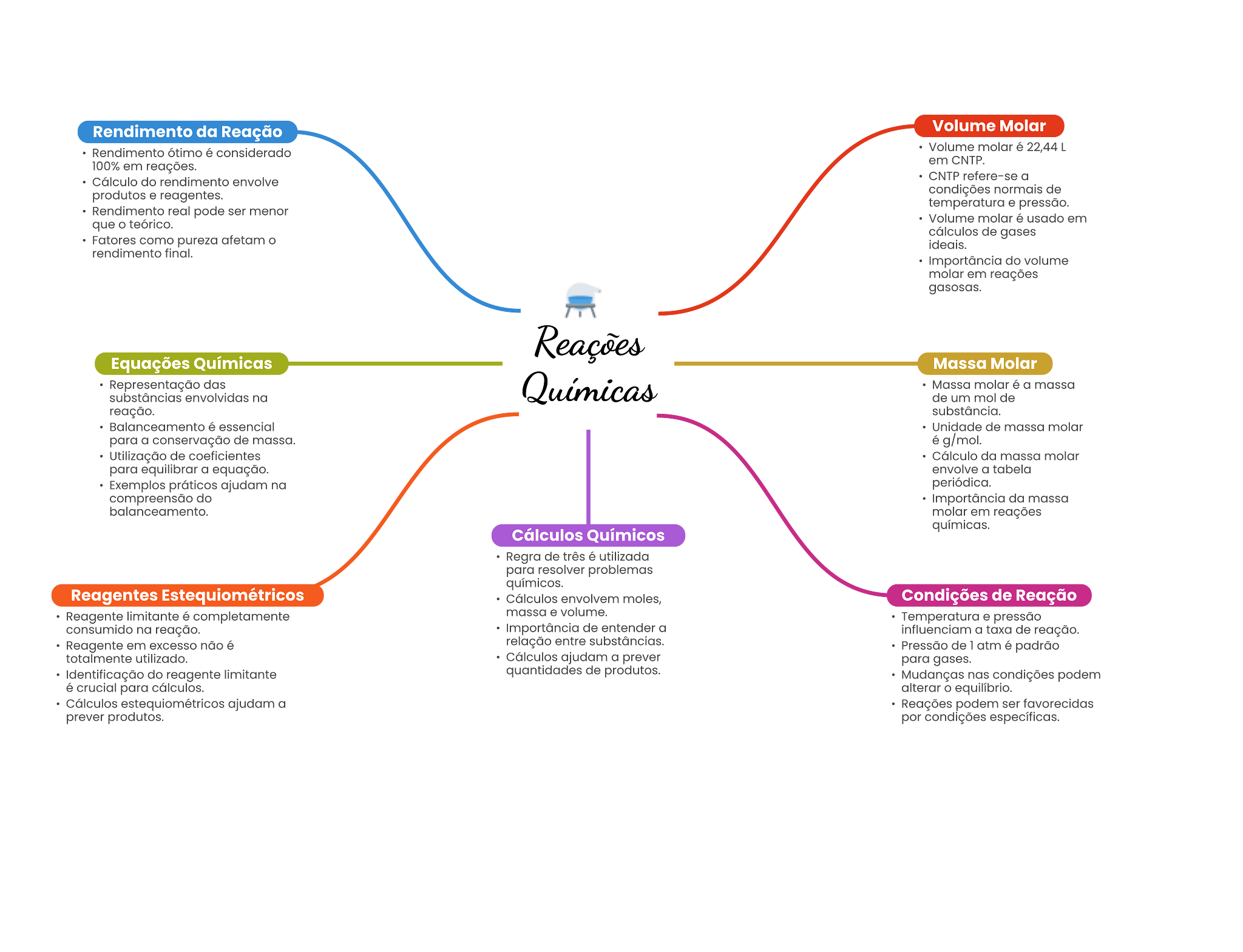 Rendimento da Reação Volume Molar Rendimento ótimo considerado Volume molar é 100% em em CNTP. Cálculo do rendimento envolve CNTP refere-se a produtos condições de temperatura . pressão. Rendimento real pode ser menor que Volume molar usado em como pureza afetam cálculos de gases rendimento final. do volume molar em reações Equações Químicas Massa Molar Representação das Massa molar é a massa substâncias envolvidas na de um de reação. substância. Balanceamento é essencial Unidade de massa molar para a conservação de é g/mol. Utilização de Cálculo da massa molar para a equação. envolve a tabela Exemplos ajudam na do da massa molar em reações Cálculos Químicos Regra de utilizada para resolver Reagentes Estequiométricos Cálculos envolvem Condições de Reação limitante é completamente massa volume. Temperatura e pressão consumido na reação. de entender a a de em não relação entre Pressão de 1 atm é padrão totalmente utilizado. Cálculos ajudam a prever para gasse. do limitante quantidades de produtos. nas condições podem crucial para alterar Cálculos ajudam a Reações podem ser favorecidas prever produtos. por condições