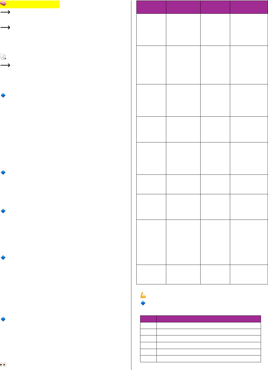 PROVA MODULAR 🧠 Exame Neurológico Avalia a integridade funcional do sistema nervoso central e periférico. É composto por várias etapas, que devem ser realizadas de forma sistemática e comparativa (lado direito x esquerdo). 🩺 1. Nível de consciência e estado mental Avalia o funcionamento cortical e do sistema reticular ativador (tronco encefálico). 🔹 Estado de Consciência • Vigil: desperto, responde adequadamente. • Sonolento: desperta com estímulos leves. • Obnubilado: desperta com estímulo vigoroso. • Torporoso: resposta lenta e confusa. • Comatoso: sem resposta a estímulos. 🔹 Orientação • Perguntar nome, local e data → desorientação indica comprometimento cortical difuso. 🔹 Memória • Imediata (repetição de números/palavras). • Recente (lembrar fatos do dia). • Remota (fatos antigos). 🔹 Linguagem • Afasia de Broca: fala difícil, compreensão preservada → lesão frontal inferior. • Afasia de Wernicke: fala fluente, sem sentido → lesão temporal superior. 🔹 Atenção e Cálculo • Testes simples (contar regressivamente, soletrar). Alterações → lesões difusas ou frontais. 👀 2. Pares cranianos (I a XII) Nervo Função Como testar Alterações típicas I – Olfatório Olfato Testar odores familiares Perda: trauma, COVID, tumor de base frontal II – Óptico Visão Acuidade visual, campo visual, fundoscopi a Amaurose, hemianopsias, papiledema III, IV, VI – Oculomoto res Movimentos oculares Seguir o dedo em “H”; reflexo pupilar Diplopia, ptose, midríase V – Trigêmeo Sensibilidade da face e mastigação Toque em 3 regiões; contração masseter Hipoestesia, dor (neuralgia) VII – Facial Expressão facial e gustação Fechar olhos, sorrir, mostrar dentes Paralisia central/perif érica VIII – Vestibuloc oclear Audição e equilíbrio Teste de Weber/Ri nne Surdez, vertigem IX e X – Glossofarí ngeo e Vago Deglutição, reflexo do vômito, voz Dizer “ah”, observar úvula Disfagia, disfonia, desvio da úvula XI – Acessório Movimento do trapézio e esternocleid omastoideo Elevar ombros, girar cabeça contra resistênci a Fraqueza desses músculos XII – Hipoglosso Movimentos da língua Protrair a língua Desvio para o lado da lesão periférica 💪 3. Função motora 🔹 Força Muscular Avaliar comparativamente (escala de 0 a 5): Grau Descrição 0 Nenhuma contração 1 Contração sem movimento 2 Movimento sem vencer a gravidade 3 Movimento contra a gravidade 4 Movimento contra resistência parcial 5 Força normal ➡ Fraqueza (paresia) → lesão do trato corticoespinhal, nervos ou músculos. ➡ Padrão piramidal (motoneurônio superior): espasticidade, hiperreflexia, Babinski positivo. ➡ Padrão periférico (motoneurônio inferior): hipotonia, arreflexia, atrofia, fasciculações. 🔹 Tônus Muscular • Normal – resistência leve. • Hipotonia – flacidez (lesão cerebelar ou LM inferior). • Hipertonia espástica – resistência em “canivete” (lesão piramidal). • Rigidez plástica – resistência constante (parkinsonismo). 🔹 Trofismo • Observar atrofia muscular, especialmente em mãos, pernas e face → lesão periférica. 🧭 4. Coordenação e equilíbrio (Provas Cerebelares) Avaliam o cerebelo e vias proprioceptivas. Teste Achado normal Alteração e significado Dedo-nariz / Calcanhar- joelho Movimento preciso Dismetria → lesão cerebelar Movimentos alternados rápidos Rítmicos Disdiadococinesia → cerebelo Prova de Romberg Equilíbrio mesmo de olhos fechados Instabilidade → via proprioceptiva (cordões posteriores) Marcha em linha reta Estável Marcha atáxica → cerebelo/vermis 🚶 5. Marcha Tipo Características Local da lesão Hemiparética (ceifante) Membro inferior rígido e circundante Trato corticoespinhal Espástica (em tesoura) Membros cruzados, rigidez Paralisia cerebral / medular Atáxica Base alargada, instável Cerebelo Parkinsoniana Passos curtos, lentos, sem balanço Gânglios da base Sensitiva Pés “batendo” no chão Cordões posteriores 🪞 6. Reflexos 🔹 Reflexos Profundos (miotáticos) Reflexo Segmento medular Achado anormal Significado Bicipital C5–C6 Hipo ou hiperreflexia LM inferior / superior Tricipital C7–C8 Hipo ou hiperreflexia 〃 Patelar L3–L4 Hipo ou hiperreflexia 〃 Aquileu S1 Hipo ou hiperreflexia 〃 🔹 Reflexos Superficiais • Cutâneo-abdominal, corneano, cremasteriano → abolidos em LM superior. • Plantar (Babinski): o Flexão normal dos dedos. o Extensão (Babinski +) = lesão piramidal. 🔹 Reflexos Patológicos • Hoffman, Clônus → lesão piramidal. ⚡ 7. Sensibilidade Avalia as vias espinotalâmica (dor, temperatura) e lemnisco medial (tato fino, vibração, propriocepção). Tipo de sensibilidade Como testar Alteração → Local da lesão Tato leve Algodão Hemicorpo contralateral (tálamo, córtex) Dor Agulha Via espinotalâmica Temperatura Tubo com água quente/fria Espinotalâmica Vibração Diapasão (ossos) Cordões posteriores Propriocepção Movimento do dedo Cordões posteriores Discriminação Identificar dois pontos Lobo parietal (área sensitiva primária) 🧩 Distribuições típicas: • Dermatômica: raiz nervosa. • Glove and stocking: neuropatia periférica. • Hemicorpo: lesão cerebral contralateral. • Um membro isolado: lesão periférica. 🧮 8. Funções superiores corticais Função Teste Lesão provável Praxis (execução de gestos) Pedir gestos simples (pentear cabelo) Lobo parietal dominante Gnosia (reconhecimento) Reconhecer objetos pelo tato Lobo parietal Cálculo / escrita / leitura Testes simples Lobo parietal dominante Atenção / julgamento Testes de concentração Lobo frontal 👁🗨 9. Sinais de localização (resumo final) Local anatômico Achados clínicos típicos Córtex motor Hemiparesia contralateral, reflexos ↑, Babinski + Cápsula interna Hemiplegia proporcional contralateral Tronco encefálico Déficit motor + nervo craniano ipsilateral Ce