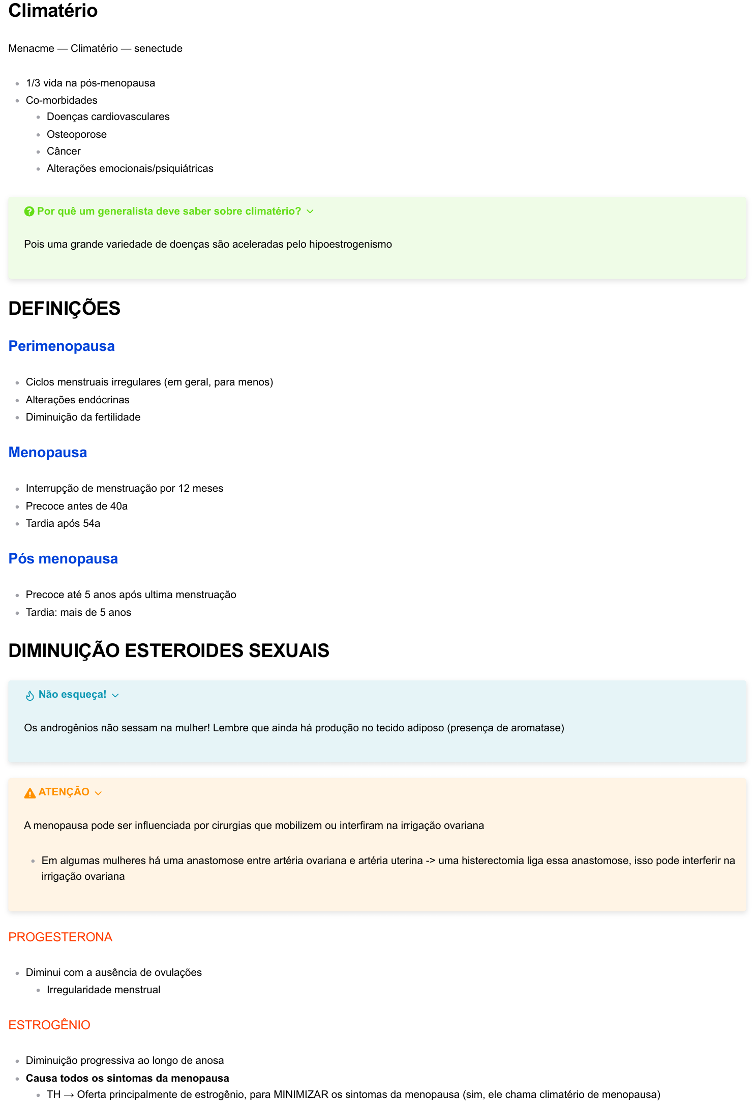 Climatério Menacme — Climatério — senectude DEFINIÇÕES Perimenopausa Menopausa Pós menopausa DIMINUIÇÃO ESTEROIDES SEXUAIS PROGESTERONA ESTROGÊNIO 1/3 vida na pós-menopausa Co-morbidades Doenças cardiovasculares Osteoporose Câncer Alterações emocionais/psiquiátricas Por quê um generalista deve saber sobre climatério? Pois uma grande variedade de doenças são aceleradas pelo hipoestrogenismo Ciclos menstruais irregulares (em geral, para menos) Alterações endócrinas Diminuição da fertilidade Interrupção de menstruação por 12 meses Precoce antes de 40a Tardia após 54a Precoce até 5 anos após ultima menstruação Tardia: mais de 5 anos Não esqueça! Os androgênios não sessam na mulher! Lembre que ainda há produção no tecido adiposo (presença de aromatase) ATENÇÃO A menopausa pode ser influenciada por cirurgias que mobilizem ou interfiram na irrigação ovariana Em algumas mulheres há uma anastomose entre artéria ovariana e artéria uterina -> uma histerectomia liga essa anastomose, isso pode interferir na irrigação ovariana Diminui com a ausência de ovulações Irregularidade menstrual Diminuição progressiva ao longo de anosa Causa todos os sintomas da menopausa TH → Oferta principalmente de estrogênio, para MINIMIZAR os sintomas da menopausa (sim, ele chama climatério de menopausa) TESTOSTERONA DEFINIÇÕES Idade da menopausa natural Fatores que influenciam FISIOPATOLOGIA Ovariana Endócrina Diminuição mais lenta ao longo dos anos Afeta o desejo sexual Note O fato de uma mulher parar de menstruar tardiamente não é necessariamente uma doença. Mas parar muito cedo pode ser uma doença Cerca de 50 anos (75%) Brasil: 48,1 anos HTA/Ooforectomia Variações anatômicas da a. uterina com anastomose da a. ovariana Paridade pequena (ou nulíparas) Tabagismo (antecede em 02 anos) Números de folículos ovarianos 1. Nascimento → 1 a 2 MI de folículos 2. Puberdade → 300.00 unidades 3. Menacme Ovulação: 1000 folículos (atresia) Ciclos regulares (30 anos) Decréscimo gradual a partir dos 35 anos Alteração do padrão menstrual Ciclos mais longos/menos folículos por ciclo Depleção da reserva folicular Alterações clínicas a partir de 45 anos (2-8 anos até a parada definitiva da menstruação) INIBINA (+ importante regulador do FSH) / FSH → 1as manifestações endócrinas indicativas de perda da reserva folicular Toda vez que os folículos são gastos, há um aumento do fsh Em um primeiro momento esse aumento do fsh é capaz de manter o nível de estrogênio semelhante ao que se tinha antes Mas de nada adiantará o FSH ficar constantemente elevado se os folículos estão diminuindo gradativamente Depleção de estrogênio / FSH e LH - Com o passar do tempo, ao custo da reserva folicular, as células da granulosa vai gradativamente diminuir, causando a depleção de estrogênio - Isso faz com que LH e FSH fiquem aumentados por um longo tempo Em algumas mulheres esse aumento do LH também exerce influência na maior produção de Androgênios Altos níveis circulantes de LH→ aumento da produção dos Androgênios - 30% Androstenediona ovário/ 70% adrenal - 50% testosterona ovário - Conversão periférica: androstenediona → estrona - No ovário (TECA) e no tecido adiposo - Então esse aumento proporciona um nível de estrogênio aumentado por mais um tempo Info As células da TECA se mantém por mais tempo que as da Granulosa → Mantém produção de androgênios por mais tempo → Se LH está aumentado, vai estimular mais essas células, assim aumentando a produção de androgênios Principal estrogênio pós menopausa: estrona Menstruais Fertilidade Urogenital ATROFIA URETRAL ATROFIA GENITAL Metabólicas METABOLISMO ÓSSEO Sexualidade Psíquicas QUADRO CLÍNICO Parte das mulheres podem sim serem assintomáticas Fogachos (ondas de calor) - Principal sintoma Não faria sentido usar análogo de gnrh em uma mulher que quer engravidar mais tarde, já que teria menos estímulo folicular? Depleção folicular: insuficiente desenvolvimento folicular LEMBRE: O folículo dominante é dependente do ambiente estrogênico adequado Variações de duração do ciclo menstrual Sangramento uterino disfuncional pedrominantemente anovulatório Amenorréia (estrogênios abaixo dos níveis críticos para estimulação endometrial) Insuficiência lútea Anovulação Esterilidade ITU de repetição Incontinência urinária Meio vaginal alcalino bacilos de doderlein Aumento da flora inespecífica Perda das rugosidades: vaginite atrófica (ou Síndrome Urogenital da Pós-menopausa) Elevação LDL/VLDL + Diminuição HDL → Risco para Aterosclerose "Grande estimulador dos osteoblastos" Aumento da reabsorção óssea → osteoporose Diminuição progressiva da libido Atenção Não é só a bioquímica/biológica do indivíduo que dita o desejo sexoal Deve-se descartar questões psíquicas Também pode ser influenciado por outros fatores, como Influência da educação Cultura Situação familiar Neurogênicas Alterações Menstruais Manifestações Metabólicas Síndrome Genitourinária DIAGNÓSTICO 60-75% das mulheres Súbito Principalmente no tórax, pescoço e segmento cefálico Sistema termorregulador hipotalâmico (núcleo pré-óptico) Vasodilatação periférica Taquicardia/sudorese/calafrios Mais comum no final do dia / á noite Pode ocorrer em uma ou mais vezes ao dia Passa em alguns minutos Independente de qualquer terapia que o médico passe, eles vão passar com o tempo → Se resolve de 2 a 3 anos → MAS NÃO É MOTIVO PARA DIZER PARA A PACIENTE ESPERAR QUE VAI PASSAR Insônia/perda de memória (”névoa mental")/fadiga Ansiedade/depressão/irritabilidade(labilidade emocional) Diminuição da libido Hipomenorreia/espaniomenorreia/amenorreia — para menos — mais clássico espaniomenorreia → amenorreia Hipermenorreia/proiomenorreia/polimenorreia — para mais (principalmente nos primeiros anos perimenopausa) Artralgia/mialgia Aterosc