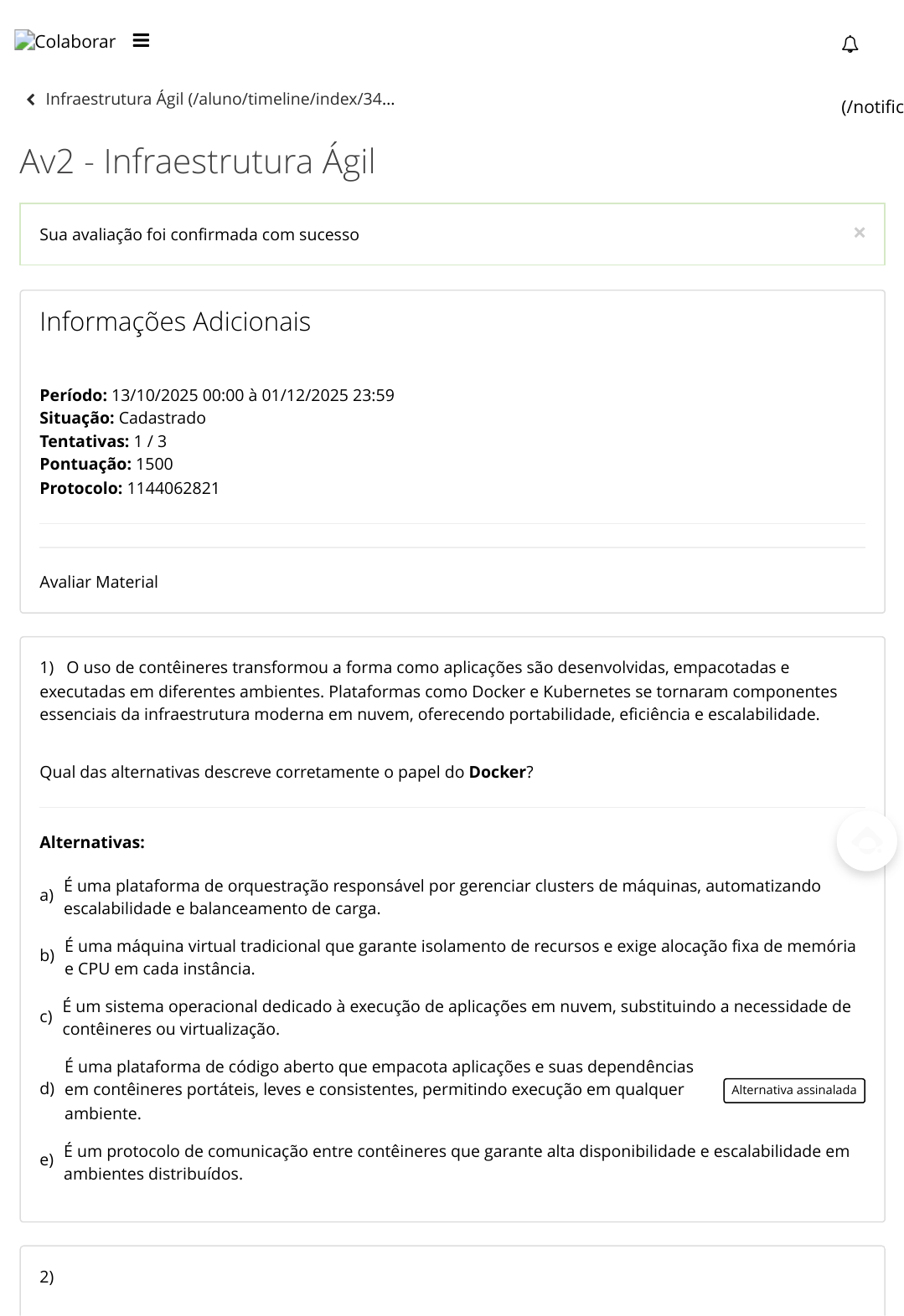 Infraestrutura Ágil (/aluno/timeline/index/34… Av2 - Infraestrutura Ágil Sua avaliação foi confirmada com sucesso Colaborar (/notific × Informações Adicionais Período: 13/10/2025 00:00 à 01/12/2025 23:59 Situação: Cadastrado Tentativas: 1 / 3 Pontuação: 1500 Protocolo: 1144062821 Avaliar Material 1) a) b) c) d) e) 2) O uso de contêineres transformou a forma como aplicações são desenvolvidas, empacotadas e executadas em diferentes ambientes. Plataformas como Docker e Kubernetes se tornaram componentes essenciais da infraestrutura moderna em nuvem, oferecendo portabilidade, eficiência e escalabilidade. Qual das alternativas descreve corretamente o papel do Docker? Alternativas: É uma plataforma de orquestração responsável por gerenciar clusters de máquinas, automatizando escalabilidade e balanceamento de carga. É uma máquina virtual tradicional que garante isolamento de recursos e exige alocação fixa de memória e CPU em cada instância. É um sistema operacional dedicado à execução de aplicações em nuvem, substituindo a necessidade de contêineres ou virtualização. É uma plataforma de código aberto que empacota aplicações e suas dependências em contêineres portáteis, leves e consistentes, permitindo execução em qualquer ambiente. Alternativa assinalada É um protocolo de comunicação entre contêineres que garante alta disponibilidade e escalabilidade em ambientes distribuídos. https://www.colaboraread.com.br/aluno/timeline/index/3487065106?ofertaDisciplinaId=2462714 https://www.colaboraread.com.br/aluno/timeline/index/3487065106?ofertaDisciplinaId=2462714 https://www.colaboraread.com.br/notificacao/index https://www.colaboraread.com.br/notificacao/index https://www.colaboraread.com.br/notificacao/index javascript:void(0); a) b) c) d) e) 3) a) Com a adoção massiva de contêineres e máquinas virtuais em ambientes corporativos, o monitoramento tornou-se um pilar essencial para garantir desempenho, segurança e disponibilidade de sistemas críticos. Entretanto, contêineres e VMs possuem arquiteturas diferentes, o que implica também em abordagens específicas para sua observação. Com base nas práticas de monitoramento de contêineres e máquinas virtuais (VMs), analise as assertivas abaixo: I. Contêineres compartilham o kernel do sistema operacional do host, o que os torna mais leves e eficientes, mas exige monitoramento mais rigoroso devido ao isolamento limitado. II. Máquinas virtuais, por possuírem um sistema operacional completo em cada instância, oferecem maior segurança e isolamento, mas demandam mais recursos computacionais e apresentam sobrecarga do hipervisor. III. Ferramentas como Prometheus e Grafana são amplamente utilizadas no monitoramento de ambientes conteinerizados, permitindo coleta de métricas em tempo real e visualização interativa. IV. O monitoramento de contêineres é mais simples que o de VMs, pois não há complexidades relacionadas a redes interconectadas ou persistência de dados. Alternativas: I e II. II e III. I, II e III. Alternativa assinalada II e IV. I, II e IV. A segurança em ambientes de contêineres exige medidas específicas, já que esses ecossistemas são altamente dinâmicos e distribuídos, ampliando a superfície de ataque. Vulnerabilidades de rede, falhas de configuração e acessos indevidos podem comprometer serviços críticos e permitir movimentação lateral de atacantes entre contêineres. Considerando a implementação de políticas de segurança em redes de contêineres, analise as assertivas abaixo: I. O isolamento de redes e a segmentação de tráfego reduzem a superfície de ataque, limitando o impacto caso um contêiner seja comprometido. II. A adoção de RBAC (controle de acesso baseado em funções) e do princípio do menor privilégio são práticas essenciais para restringir permissões e reduzir riscos de comprometimento. III. O tráfego entre contêineres não precisa ser criptografado, já que a execução dentro de clusters já garante a confidencialidade dos dados. IV. O monitoramento contínuo, com ferramentas como Prometheus ou Falco, auxilia na detecção de comportamentos anômalos e no alerta de possíveis ataques em tempo real. V. A revisão e atualização das políticas de segurança deve ser periódica, acompanhando a evolução da infraestrutura e utilizando automação para consistência. Alternativas: I, III e IV. b) c) d) e) 4) a) b) c) d) e) 5) I, II, IV e V. Alternativa assinalada I, IV e V. III, IV e V. I, II e IV. A computação em nuvem transformou a forma como empresas utilizam recursos de TI, oferecendo modelos de serviço como IaaS, PaaS e SaaS, cada um com diferentes níveis de abstração e responsabilidade compartilhada. Ao mesmo tempo, mecanismos como escalonamento automático e elasticidade permitem que os recursos se ajustem em tempo real às demandas variáveis, promovendo eficiência e otimização de custos. Considerando os modelos de serviço em nuvem (IaaS, PaaS e SaaS) e os conceitos de escalonamento automático, analise as assertivas abaixo: I. O IaaS fornece ao cliente controle direto sobre máquinas virtuais, redes e armazenamento, sendo um modelo indicado para empresas que necessitam de personalização da infraestrutura. II. O PaaS elimina a necessidade de gerenciamento da infraestrutura subjacente, permitindo foco no desenvolvimento de aplicações, com suporte a escalonamento automático para lidar com variações de demanda. III. O SaaS exige que o cliente gerencie diretamente as atualizações, segurança e manutenção do software adquirido, garantindo maior autonomia sobre o ciclo de vida da aplicação. IV. O escalonamento vertical envolve aumentar os recursos de uma máquina existente, como memória RAM ou CPU, enquanto o escalonamento horizontal adiciona novas instâncias para distribuir a carga. V. Elasticidade refere-se à adaptação instantânea de recursos às variações rápidas da demanda, enquanto escalabilid