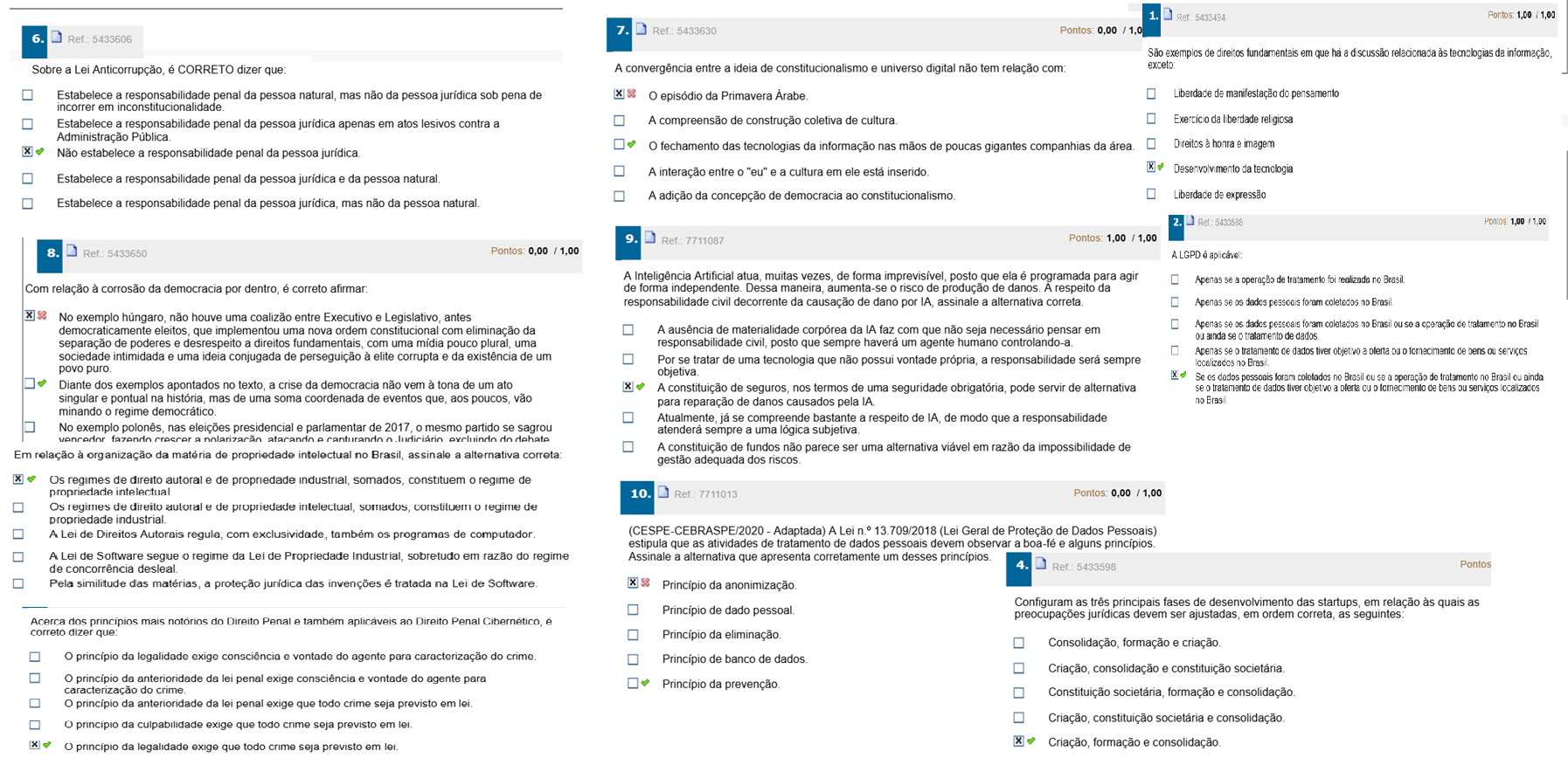 1. Ref. 5433494 Pontos: 1,00 7. Ref.: 5433630 Pontos: 0,00 1,0 6. Ref.: 5433606 São exemplos de direitos fundamentais em que ha a discussão relacionada tecnologias da informação, Sobre a Lei Anticorrupção, é CORRETO dizer que: A convergência entre a ideia de constitucionalismo e universo digital não tem relação com: Estabelece a responsabilidade penal da pessoa natural, mas não da pessoa jurídica sob pena de episódio da Primavera Liberdade de manifestação do pensamento incorrer em inconstitucionalidade Estabelece a responsabilidade penal da pessoa jurídica apenas em atos lesivos contra a A compreensão de construção coletiva de Exercício da liberdade religiosa Administração fechamento das tecnologias da informação nas mãos de poucas gigantes companhias da Direitos à honra e imagem Não estabelece a responsabilidade penal da pessoa A interação entre 0 "eu" e a cultura em ele Desenvolvimento da tecnologia Estabelece a responsabilidade penal da pessoa jurídica e da pessoa A adição da concepção de democracia ao Liberdade de expressão Estabelece a responsabilidade penal da pessoa jurídica, mas não da pessoa 2. 5433588 Pontos 1,00 9. Ref. 7711087 Pontos: 1,00 1,00 8. Ref.: 5433650 Pontos: 0,00 1,00 A LGPD aplicável: A Inteligência Artificial atua, muitas vezes, de forma imprevisível, posto que ela é programada para agir Apenas se operação de tratamento foi realizada no Com relação à corrosão da democracia por dentro, é correto de forma independente. Dessa maneira, aumenta-se risco de produção de A respeito da responsabilidade civil decorrente da causação de dano por IA, assinale a alternativa correta Apenas se dados foram no Brasil No exemplo húngaro, não houve uma coalizão entre Executivo e Legislativo, antes A ausência de materialidade corpórea da IA faz com que não seja necessário pensar em Apenas se dados foram coletados no Brasil ou so a operação de tratamento no Brasil democraticamente eleitos, que implementou uma nova ordem constitucional com eliminação da ou ainda se 0 tratamento de separação de poderes e desrespeito a direitos fundamentais, com uma pouco plural, uma responsabilidade civil, posto que sempre havera um agente humano controlando-a sociedade intimidada e uma ideia conjugada de perseguição à elite corrupta e da existência de um Apenas se 0 tratamento de dados tiver objetivo a ou 0 fornecimento de bens ou serviços Por se tratar de uma tecnologia que não possui vontade a responsabilidade sera sempre localizados no povo puro. objetiva. 05 dados pessoais foram coletados no Brasil ou a operação tratamento no Brasil ou ainda Diante dos exemplos apontados no texto, a crise da democracia não vem à tona de um ato A constituição de seguros, nos termos de uma seguridade obrigatória, pode servir de alternativa se tratamento de dados tiver objetivo a oferta 0 fornecimento de bens ou serviços localizados singular e pontual na mas de uma soma coordenada de eventos que, aos poucos, vão para reparação de danos causados pela IA no Brasil minando O regime Atualmente, já se compreende bastante a respeito de IA, de modo que a responsabilidade No exemplo nas eleições presidencial e parlamentar de 2017, mesmo partido se sagrou atendera sempre a uma vencedor fazendo crescer a atacando e canturando excluindo do debate A constituição de fundos não parece ser uma alternativa em razão da impossibilidade de Em relação à organização da materia de propriedade intelectual no Brasil, assinale a alternativa gestão adequada dos Os regimes de direito autoral e de propriedade industrial, somados, constituem regime de propriedade intelectual 10. 7711013 Pontos: 0,00 1,00 Os regimes de direito autoral e de propriedade intelectual, somados, constituem regime de propriedade industrial A Lei de Direitos Autorais regula, com programas de (CESPE-CEBRASPE/2020 Adaptada) A Lei 13.709/2018 (Lei Geral de Proteção de Dados Pessoais) estipula que as atividades de tratamento de dados pessoais devem observar a boa-fe e alguns A Lei de Software segue regime da Lei de Propriedade Industrial, sobretudo em razão do regime Assinale a alternativa que apresenta corretamente um desses de concorrência 4. Ref.: 5433598 Pontos Pela similitude das a proteção jurídica das invenções é tratada na Lei de Software Princípio da anonimização. Configuram as principais fases de desenvolvimento das startups, em relação às quais as de dado pessoal. preocupações jurídicas devem ser ajustadas, em ordem correta, as Acerca dos mais notórios do Direito Penal e tambem aplicáveis ao Direito Penal Cibernético, correto dizer que: da Consolidação, formação e criação. da legalidade exige consciência e vontade do agente para caracterização do de banco de dados. Criação, consolidação e constituição da anterioridade da lei penal exige consciência e vontade do agente para caracterização do Princípio da prevenção. Constituição societária, formação e consolidação. da anterioridade da lei penal exige que todo crime seja previsto em lei. Criação, constituição e consolidação. principio da culpabilidade exige que todo crime seja previsto em lei. principio da legalidade exige que todo crime seja previsto em lei. Criação, formação e consolidação.