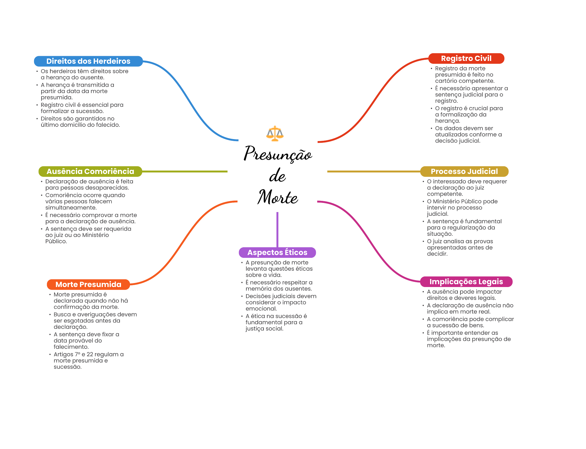 Direitos dos Herdeiros Registro Civil herdeiros têm direitos sobre Registro da a herança do presumida é feito no cartório competente. A herança a partir da data da É apresentar a presumida. sentença judicial para registro. Registro civil é essencial para a sucessão. registro para a formalização da Direitos são garantidos no último domicilio do herança. dados ser conforme a judicial. Ausência Comoriência Processo Judicial de feita requerer para a declaração Comoriência quando pessoas falecem Ministério Público pode no processo É comprovar a morte para a declaração de A sentença fundamental A sentença deve ser requerida para a regularização da ao ou do Ministério Público. apresentadas de Aspectos Éticos decidir. A presunção de morte questões éticas sobre a vida. Morte Presumida É respeitar a Implicações Legais memória dos Morte presumida é A ausência pode impactor Decisões devem declarada quando não direitos deveres legale. considerar o confirmação da emocional. A declaração de não Busca . averiguações em morte real. A ética na sucessão ser esgotadas da fundamental para a A pode complicar declaração. a de A sentença deve a É importante entender as provável do da presunção de falecimento. Artigos 7° 22 a morts presumida