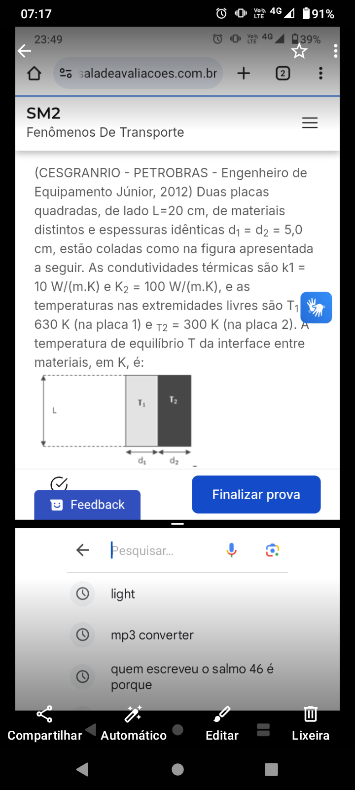 07:17 4G LTE 91% 23:49 4G LTE 39% saladeavaliacoes.com.br + 2 SM2 Fenômenos De Transporte (CESGRANRIO PETROBRAS Engenheiro de Equipamento Júnior, 2012) Duas placas quadradas, de lado L=20 cm, de materiais distintos e espessuras idênticas d₁ = d₂ = 5,0 cm, estão coladas como na figura apresentada a seguir. As condutividades térmicas são k1 = 10 W/(m.K) e K₂ = 100 W/(m.K), e as temperaturas nas extremidades livres são 630 K (na placa 1) e T2 = 300 K (na placa 2). A temperatura de equilíbrio T da interface entre materiais, em K, é: T1 L Finalizar prova Feedback Pesquisar... light mp3 converter quem escreveu o salmo 46 é porque Compartilhar Automático Editar Lixeira