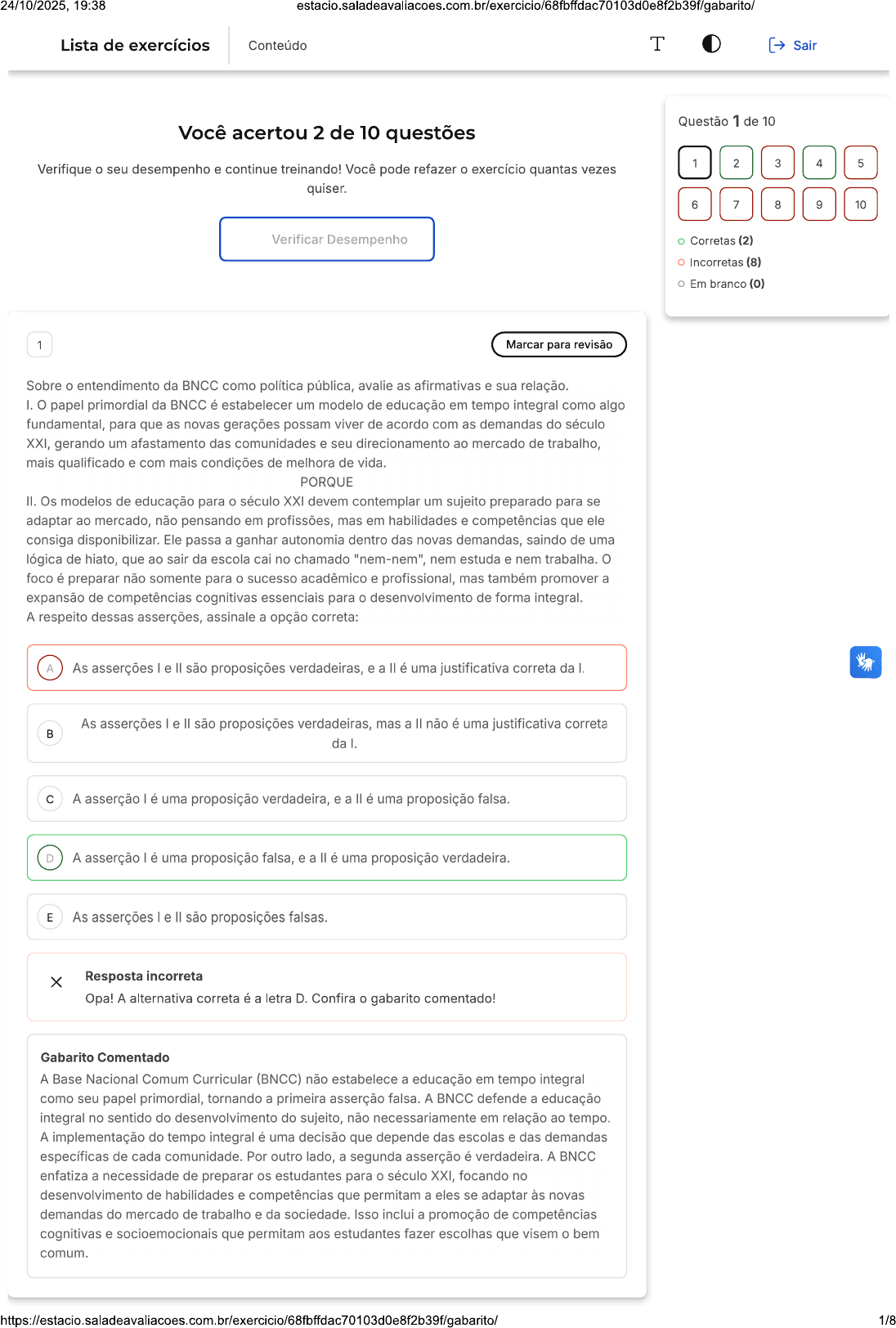 24/10/2025, 19:38 estacio.saladeavaliacoes.com.br/exercicio/68fbffdac70103d0e8f2b39f/gabarito/ Lista de exercícios Conteúdo T Sair Questão 1 de 10 Você acertou 2 de 10 questões 1 2 3 4 5 Verifique o seu desempenho e continue treinando! Você pode refazer o exercício quantas vezes quiser. 6 7 8 9 10 Verificar Desempenho Corretas (2) Incorretas (8) Em branco (0) 1 Marcar para revisão Sobre o entendimento da BNCC como política pública, avalie as afirmativas e sua relação. I. papel primordial da BNCC é estabelecer um modelo de educação em tempo integral como algo fundamental, para que as novas gerações possam viver de acordo com as demandas do século XXI, gerando um afastamento das comunidades e seu direcionamento ao mercado de trabalho, mais qualificado e com mais condições de melhora de vida. PORQUE II. Os modelos de educação para século XXI devem contemplar um sujeito preparado para se adaptar ao mercado, não pensando em profissões, mas em habilidades e competências que ele consiga disponibilizar. Ele passa a ganhar autonomia dentro das novas demandas, saindo de uma lógica de hiato, que ao sair da escola cai no chamado "nem-nem", nem estuda e nem trabalha. O foco é preparar não somente para sucesso acadêmico e profissional, mas também promover a expansão de competências cognitivas essenciais para o desenvolvimento de forma integral. A respeito dessas asserções, assinale a opção correta: A As asserções e são proposições verdadeiras, e a é uma justificativa correta da I. As asserções e são proposições verdadeiras, mas a não é uma justificativa correta da I. c A asserção é uma proposição verdadeira, e a é uma proposição falsa. D A asserção é uma proposição falsa, e a é uma proposição verdadeira. E As asserções e são proposições falsas. X Resposta incorreta Opa! A alternativa correta é a letra D. Confira o gabarito comentado! Gabarito Comentado A Base Nacional Comum Curricular (BNCC) não estabelece a educação em tempo integral como seu papel primordial, tornando a primeira asserção falsa. A BNCC defende a educação integral no sentido do desenvolvimento do sujeito, não necessariamente em relação ao tempo. A implementação do tempo integral é uma decisão que depende das escolas e das demandas específicas de cada comunidade. Por outro lado, a segunda asserção é verdadeira. A BNCC enfatiza a necessidade de preparar os estudantes para o século XXI, focando no desenvolvimento de habilidades e competências que permitam a eles se adaptar às novas demandas do mercado de trabalho e da sociedade. Isso inclui a promoção de competências cognitivas e socioemocionais que permitam aos estudantes fazer escolhas que visem o bem comum. 1/824/10/2025, 19:38 estacio.saladeavaliacoes.com.br/exercicio/68fbffdac70103d0e8f2b39f/gabarito/ 2 Marcar para revisão (IDHTEC 2019 Professor) currículo escolar se apresenta como elemento central do projeto pedagógico, por isso, é preciso considerar em sua construção a complexidade dos saberes e das diferentes áreas presentes no contexto atual. Nesse sentido, pensar a organização do currículo escolar implica: Construir um currículo que prevaleça a hierarquia das disciplinas, uma vez que facilitará o A processo de ensino. Dar ênfase aos conceitos em detrimento das habilidades e competências. Desenvolver práticas que priorizem as disciplinas de primeira grandeza, como linguagens c e matemática. D Refletir sobre a neutralidade inerente ao processo de construção da proposta da escola. Construir uma proposta fundamentada na interdisciplinaridade e na contextualização de E modo a assegurar um maior diálogo entre as áreas do saber. Resposta correta Parabéns, você selecionou a alternativa correta. Confira o gabarito comentado! Gabarito Comentado A alternativa correta é a E. A organização do currículo escolar deve ser pensada de maneira a promover a interdisciplinaridade e a contextualização, garantindo assim um maior diálogo entre as diferentes áreas do saber. Isso significa que o currículo deve ser construído de forma a integrar os diferentes campos de conhecimento, permitindo que os alunos compreendam a complexidade e a inter-relação dos saberes. Além disso, a contextualização permite que os conteúdos sejam ensinados de maneira relevante e significativa para os alunos, relacionando- os com o seu contexto social, cultural e pessoal. Portanto, a organização do currículo escolar é um processo dinâmico e complexo, que deve ser constantemente avaliado e aprimorado para garantir a qualidade da educação. 3 Marcar para revisão De acordo com a Base Nacional Comum Curricular (BNCC), homologada em dezembro de 2017 pelo Ministério da Educação, assinale a alternativa incorreta. A contribuição mais significativa da BNCC é substituir os currículos das disciplinas A escolares das redes públicas federal, estaduais e municipais, uma vez que determina o que deve ser ensinado em cada escola. A BNCC determina os conhecimentos e as competências que os estudantes devem desenvolver ao longo da escolaridade, orientada por princípios éticos, políticos e estéticos. Fruto de amplo debate com diferentes atores do campo educacional e com a sociedade brasileira, a BNCC tem a finalidade de contribuir para a construção de uma sociedade justa, democrática e inclusiva. 2/824/10/2025, 19:38 A BNCC é um documento de referência, mas de caráter normativo, que define o conjunto D de aprendizagens essenciais que todos os alunos brasileiros devem desenvolver ao longo das etapas e modalidades da educação básica. Uma das finalidades da BNCC é contribuir para a superação da fragmentação das E políticas educacionais e para o fortalecimento do regime de colaboração entre as três esferas de governo. X Resposta incorreta Opa! A alternativa correta é a letra Confira o gabarito comentado! Gabarito Comentado A alternativa A está incorreta porque a Base Nacional C
