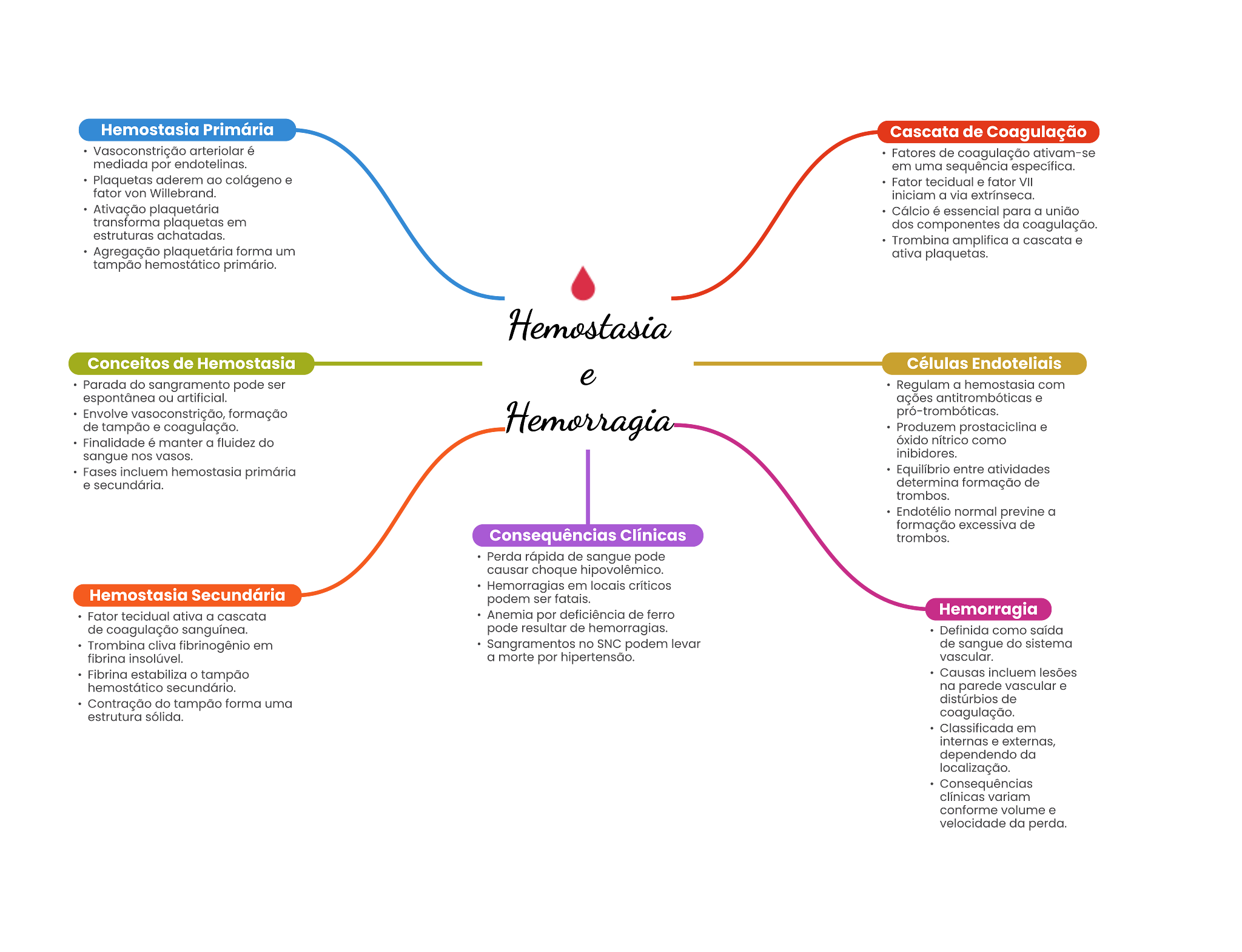 Hemostasia Primária Cascata de Coagulação Vasoconstrição é Fatores de coagulação ativam-se mediada por em uma sequência específica. aderem colágeno Fator tecidual e fator VII fator von Willebrand. iniciam a via Ativação é essencial para a transforma plaquetas em componentes da coagulação. Trombina amplifica a cascata Agregação forma um ativa tampão primário. Conceitos de Hemostasia Células Endoteliais Parada do pode ser Regulam a hemostasia com espontânea ou ações Envolve vasoconstrição, formação de tampão coagulação. Produzem . Finalidade é manter a do como sangue nos inibidores. hemostasia primária Equilibrio entre atividades . secundária. determina formação de normal previne a formação excessiva de Consequências Clínicas trombos. Perda de sangue pode choque hipovolêmico. em criticos Hemostasia Secundária podem ser Fator tecidual ativa a cascata Anemia por deficiência de ferro Hemorragia de coagulação pode resultar de hemorragias. Definida como Trombina cliva fibrinogênio em Sangramentos no SNC podem de sangue do fibrina a morte por vascular. Fibrina estabiliza tampão Causas na parede vascular Contração do tampão forma uma de estrutura sólida. coagulação. Classificada em internas externas, dependendo da localização. Consequências variam conforme volume e velocidade da perda.