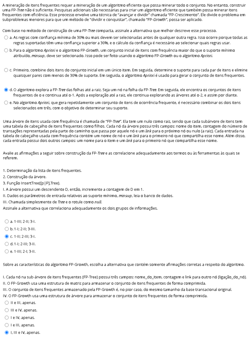 A mineração de itens frequentes requer a mineração de um algoritmo eficiente que possa minerar todo 0 conjunto. No entanto, construir uma FP-Tree não é suficiente. Pesquisas adicionais são necessárias para criar um algoritmo eficiente que também possa minerar itens frequentes com eficiência. Esse processo envolve uma técnica de "avançar e dividir" chamada "FP-Crescimento". Ele divide 0 problema em subproblemas menores para que um método de "dividir e conquistar", chamado "FP-Growth", possa ser aplicado. Com base no método de construção de uma FP-Tree compacta, assinale a alternativa que melhor descreve esse processo. a. As regras com confiança mínima de 30% ou mais devem ser selecionadas antes de qualquer outra regra. Isso ocorre porque todas as regras suportadas têm uma confiança superior a 30%, e cálculo da confiança é necessário ao selecionar quais regras usar. b. Para 0 algoritmo Apriori e 0 algoritmo FP-Growth, um conjunto inicial de itens com frequência maior do que 0 suporte mínimo atribuído, minsup, deve ser selecionado. Isso pode ser feito usando algoritmo FP-Growth ou algoritmo Apriori. C. Primeiro, combine dois itens do conjunto inicial em um único item. Em seguida, determine suporte para cada par de itens e elimine quaisquer pares com menos de 30% de suporte. Em seguida, algoritmo Apriori é usado para gerar conjunto de itens frequentes. algoritmo explora a FP-Tree das folhas até a raiz. Seja um nó na folha da FP-Tree. Em seguida, ele encontra conjuntos de itens frequentes de e continua até Após a exploração até a raiz, ele continua explorando as árvores até o-2, e assim por diante. e. No algoritmo Apriori, que gera repetidamente um conjunto de itens de ocorrência frequente, é necessário combinar os dois itens selecionados em três, com objetivo de determinar seu suporte. Uma árvore de itens usada com frequência é chamada de "FP-Tree". Ela tem um nulo como raiz, sendo que cada subárvore de itens tem uma tabela de cabeçalho de itens frequentes como filhos. Cada nó da árvore possui três campos: nome do item, contagem do número de transações representadas pela parte do caminho que passa por aquele nó e um link para próximo nó ou nulo (a raiz). Cada entrada na tabela de cabeçalho usada com frequência contém um nome de nó e um link para primeiro nó que compartilha esse nome. Além disso, cada entrada possui dois outros campos: um nome para item e um link para primeiro nó que compartilha esse nome. Avalie as afirmações a seguir sobre construção da FP-Tree e as correlacione adequadamente aos termos ou às ferramentas às quais se referem. 1. Determinação da lista de itens frequentes. 2. Construção da árvore. 3. Função I.A árvore possui um descendente D, então, incremente a contagem de D em 1. II. Dados os parâmetros de entrada relativos ao suporte mínimo, minsup, leia banco de dados. III. Chamada simplesmente de Tree e 0 rotule como null. Assinale a alternativa que correlaciona adequadamente os dois grupos de informações. a. b. C. d. e. Sobre as características do algoritmo FP-Growth, escolha a alternativa que contém somente afirmações corretas a respeito do algoritmo. I. Cada nó na sub-árvore de itens frequentes (FP-Tree) possui três campos: nome_do_item, contagem e link para outro nó II. FP-Growth usa uma estrutura de matriz para armazenar 0 conjunto de itens frequentes de forma comprimida. III. O conjunto de itens frequentes armazenado pela FP-Growth é, no pior caso, do mesmo tamanho da base transacional original. IV. O FP-Growth usa uma estrutura de árvore para armazenar conjunto de itens frequentes de forma comprimida. e III, apenas. III e IV, apenas. e IV, apenas. e III, apenas. I, III e IV, apenas.Observe a representação binária da base transacional abaixo contendo cinco transações com itens comprados em um supermercado. Escolha a alternativa que indica corretamente valores de suporte e confiança da regra de associação (Tomate). ID Alface Cebola Tomate Maçã Sabão Arroz Leite Açúcar 1 1 0 1 1 1 0 0 1 2 1 1 1 0 1 1 0 0 3 1 0 1 0 0 0 0 1 4 0 1 0 0 0 1 1 0 5 1 0 1 1 0 0 1 0 Suporte = confiança = 80% Suporte = 80%, confiança = 100% Suporte = 80%, confiança = 80% Suporte = confiança = 75% Suporte = 75%, confiança 80% Sobre as medidas de suporte e confiança, indique a alternativa que relaciona corretamente as afirmações a seguir com as duas medidas. 1. Suporte. 2. Confiança. I.É útil para a definição de limite para a eliminação de regras de associação pouco interessantes. II. Sua fórmula é: número de registros da tabela que contêm todos os itens da regra de asociação dividido pelo número de registros da tabela que contêm o antecedente de tal regra. III. É medida de acurácia de uma regra de associação. IV. Indica a probabilidade de ocorrência de uma regra de associação no conjunto total de transações. 1 e II; 2 III e IV. 1 e IV; 2 e III.Sobre a análise de regras de associação, indique a alternativa que contém somente exemplos de onde essas regras são frequentemente utilizadas. I. Realização de promoções. II. Campanhas de III. Identificação de categorias de produtos. IV. Vendas casadas. I, e III, apenas. IV, apenas. II e III, apenas. III e IV, apenas. I, e IV, apenas. Sobre as etapas do processo de mineração de regras de associação, observe a imagem a seguir. Selecione a alternativa que indica corretamente quais são as etapas no diagrama apresentado da figura. 1 2 3 4 Avaliação. II. Mineração das regras. III. Pré-processamento dos dados. IV. Geração do conjunto de itens frequentes. 1 III; 2 IV: 3 II; 4 1 III; 2 3 II; 4 IV