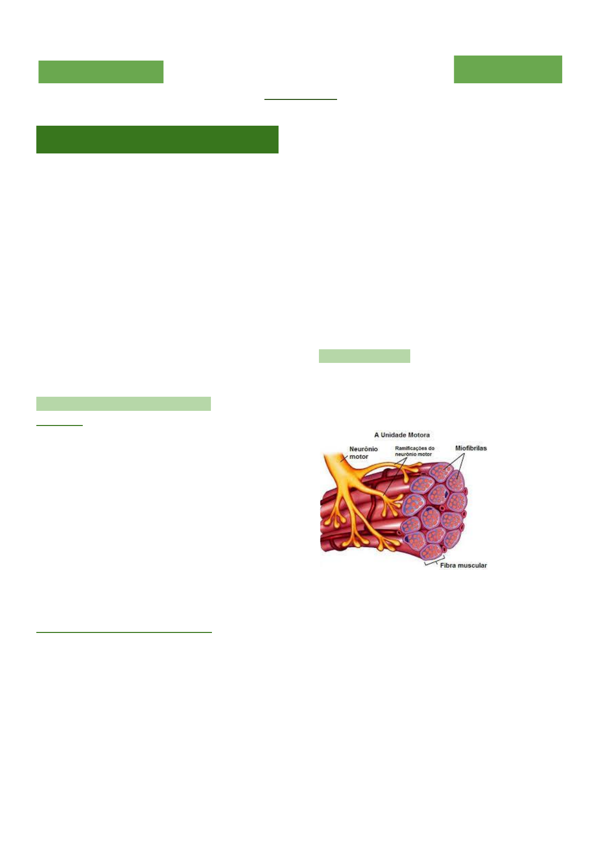 Samara e Sarah | @fisios.tododia Tr��nam�nt� Físic� Fun�i�nal 8º semestre 09.08.2024 Fisi�l�gia e Tr��nam�nt� de F�ça - Definição: ● O que é Força? É uma capacidade de treinamento, ou seja, é a capacidade de exercer tensão contra uma resistência, seja uma carga (peso), elástico, um objeto (ex: parede), superando, cedendo ou sustentando-a, baseado em aspectos mecânicos (músculos, ossos, tendões) e químicos (energia; ATP) Exemplo: Exercício de flexão de cotovelo - ao flexionar, vencemos a resistência; ao retornar, cedemos; e ao segurar no ar, sustentamos. Fatores que modificam a força Neurais: O sistema musculoesquelético depende diretamente do SNC, pois não trabalha de forma autônoma como outros sistemas - ele não faz nada sozinho. Isto significa que a coordenação e a ativação dos músculos dependem das mensagens que o SNC envia. - Exemplo: Na Esclerose Múltipla, a destruição da bainha de mielina afeta a transmissão de impulsos nervosos, resultando em uma redução da força muscular. Hipertróficos ou metabólicos: Referem-se ao aumento do tamanho das células musculares. As fibras musculares se hipertrofiam, aumentando a seção transversal, resultando em maior torque, ou seja, a capacidade de gerar força. O torque dessa célula será maior do que o de uma menor. Entretanto, isso influencia menos do que os fatores neurais. Por exemplo, um fisiculturista e um levantador de peso podem ter músculos hipertrofiados, mas o levantador, que foca mais no treinamento neural, pode demonstrar maior força em atividades de levantamento. Isso ocorre pois os fatores neurais permitem uma melhor coordenação e recrutamento das fibras musculares, potencializando ainda mais a força gerada. Psicológicos: O fator emocional também interfere, como a presença do treinador físico atrás do praticante para dar segurança, bem como o incentivo e comando verbal Unidade Motora Definição: Um motoneurônio e as fibras musculares que ele inerva, no local de transição, chamado de junção neuromuscular. Essas fibras funcionam concomitantemente (simultaneamente), à medida que a descarga chega neste neurônio. Ou seja, não é possível individualizá-las; é possível recrutar menos unidades motoras, mas não dá para separar as fibras das UM recrutadas Estruturas da Unidade Motora Dendritos - Área de captação de sinal neuronal Axônios - Área de propagação de sinal Bainha de mielina - Determina a velocidade de propagação 1 *PROIBIDO COMPARTILHAR ESTE MATERIAL SEM A AUTORIZAÇÃO PRÉVIA DAS AUTORAS* Samara e Sarah | @fisios.tododia Tr��nam�nt� Físic� Fun�i�nal 8º semestre Neurotransmissor - Acetilcolina (Ach - principal do músculo esquelético) Receptor nicotínico - liga-se à Ach Acetilcolinesterase - Enzima que quebra a molécula de Ach e a transforma em Ácido Acético + Colina, deixando o músculo em repouso (não passam a condução elétrica) Sinapse - Sinal trocado entre neurônios *Qualquer condição que faça a Ach ficar mais ou menos tempo no receptor trará implicações nervosas e/ou de contração muscular no indivíduo TIPOS DE UNIDADES MOTORAS ● Lenta oxidativa (LO): Neurônios com pouca bainha de mielina e que inervam um menor número de fibras, velocidade de propagaçãomais lenta. Ligadas a fibras do tipo I, fibras de resistência ● Rápida oxidativa (RO): Neurônios intermediários, com boa velocidade média e que inervam um número maior de fibras, com estrutura mais densa. Ligados ao tipo IIA (rápidas, mas não tão explosivas, que suportam prolongamento/resistência das tensões; fibras intermediárias) ● Rápida glicolítica (RG): Neurônios muito densos, de grande calibre, que podem inervar milhares de fibras. Ligados às fibras IIB/X (brancas), de muita velocidade e explosão Todos os músculos têm os 3 tipos de UM, com diferentes predominâncias. Exemplos: - Quadríceps: Predomínio de IIB para movimentos de subir e descer escadas e suportar o peso do corpo, saltar, etc - Abdômen: Predomínio de IIA, para prolongar a tensão e estabilizar o corpo, ou seja, tensão de resistência com prolongamento, assim como os paravertebrais - Olhos: Predomínio de I, com resistência mais fina e apurada U.M. LO RO RG Neurônios Pouca bainha de mielina Intermediári os Muito densos, grande calibre Nº fibras Menor nº de fibras Maior nº de fibras Milhares de fibras Velocidade Mais lenta Média Muita velocidade e explosão Fibras Tipo I Tipo IIA Tipo IIB Recrutamento: Baseado na Lei do Tamanho, que determina o recrutamento da menor para a maior fibra (I→ IIA→ IIB) Esta lei pode ser modificada em tempo, de modo que, quanto mais rápido seja o movimento realizado, mais rápido 2 *PROIBIDO COMPARTILHAR ESTE MATERIAL SEM A AUTORIZAÇÃO PRÉVIA DAS AUTORAS* Samara e Sarah | @fisios.tododia Tr��nam�nt� Físic� Fun�i�nal 8º semestre ocorrerá a transição da utilização destas fibras, mantendo a sequência do tamanho Exemplo: Subir numa caixa de crossfit exige velocidade e explosão, portanto a utilização das fibras rápidas ocorrerá mais rápido; diferente de um exercício de resistência, onde essas fibras serão recrutadas após um tempo maior, à medida que as fibras lentas e intermediárias forem “fadigando” Coordenação - Coordenação para que essa situação regional do recrutamento de UMs ocorra da melhor forma, isso é possível com o treinamento, em condições normais. 1. Coordenação intracelular (de um único neurônio): No primeiro momento conseguimos esse tipo de coordenação que se refere a função de chegar o impulso por exemplo no núcleo de um neurônio; Como no caso de pessoas que não treinam, não tem memorização e tem dificuldade de se manter estável em um exercício. Conquistados nos primeiros dias ou semanas de treinamento geralmente, mas não há uma regra, existe grande variedade entre indivíduos. 2. Coordenação entre neurônios: No segundo