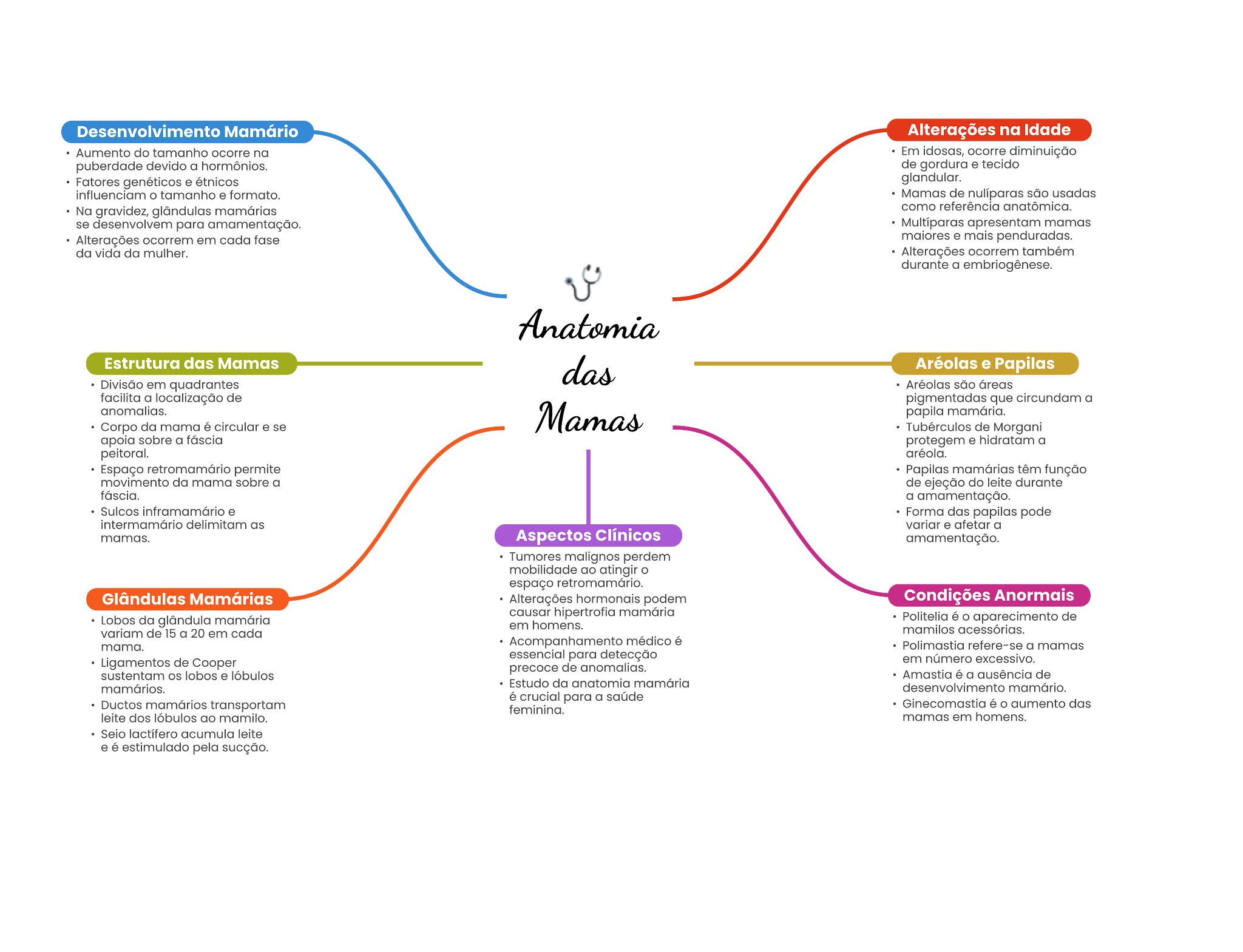 Desenvolvimento Mamário Alterações na Idade Aumento do tamanho ocorre na Em ocorre puberdade devido a de gordura tecido Fatores genéticos glandular. o tamanho formato. de são usadas Na gravidez, mamárias como referência para amamentação. apresentam mamas Alterações em cada fase malores penduradas. da vida da mulher. Alterações ocorrem também durante a Estrutura das Mamas Aréolas e Papilas Divisão em quadrantes facilita a de pigmentadas que circundam a anomalias. papila mamária. Corpo da mama é circular se de Morgani sobre a protegem . hidratam a Espaço permite Papilas têm função movimento da mama sobre a de ejeção do durante a amamentação. e Forma dos pode delimitam as a mamas. Aspectos Clínicos amamentação. Turnores perdem mobilidade o espaço retromamário. Glândulas Mamárias Alterações hormonals podem Condições Anormais Lobos da mamária hipertrofia mamária 0 de em homens. variam de 15 a 20 em cada mamilos mama. Acompanhamento médico Polimastia refere-se a mamas essencial para detecção Ligamentos de Cooper em número excessivo. sustentam lobos lóbulos precoce de Amastia é a queência de Estudo da anatomia mamária desenvolvimento Ductos mamários transportam para a aumento das leite dos ao mamas em homens. Selo acumula leite . estimulado pela