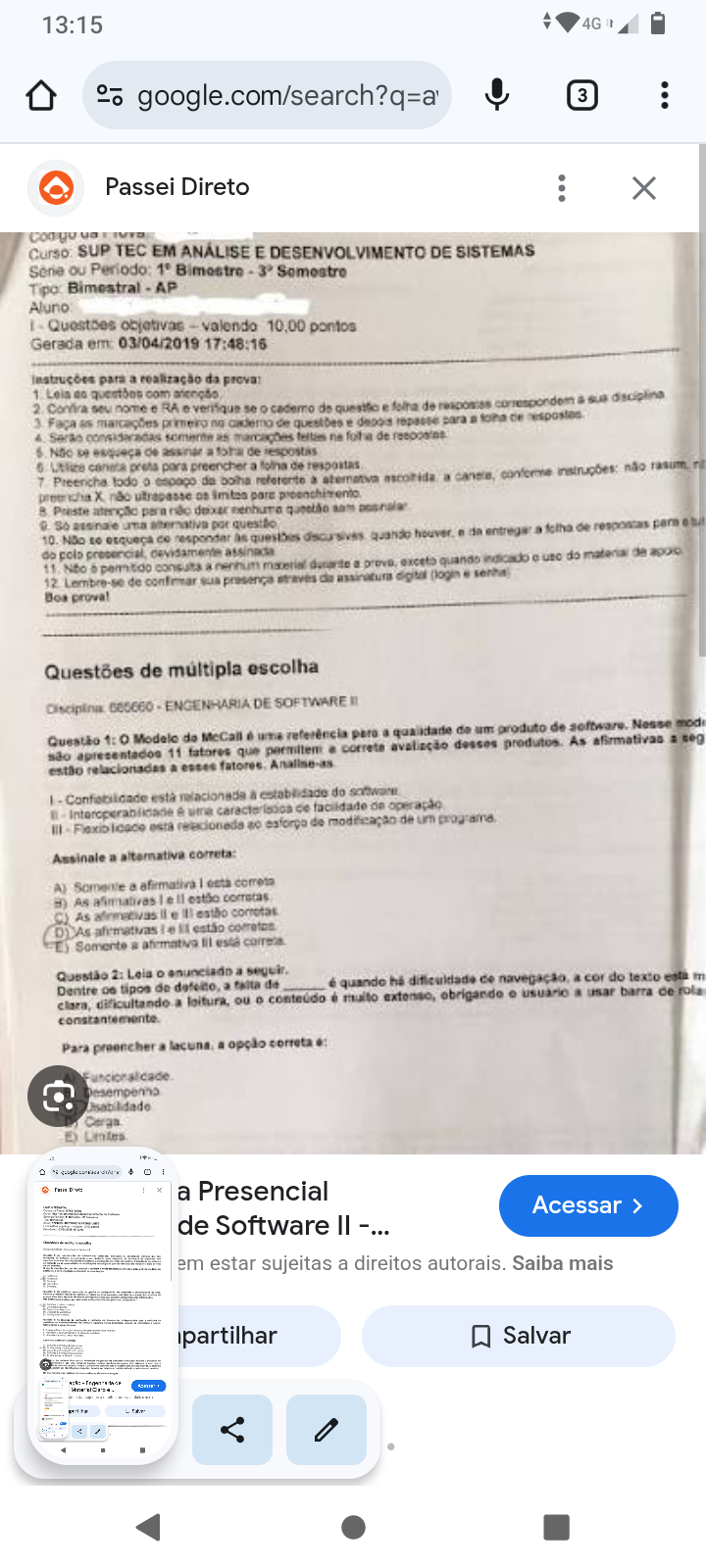13:15 4G google.com/search?q=a 3 Passei Direto X Codigo Curso: SUP TEC EM E DESENVOLVIMENTO DE SISTEMAS ou Periodo: Bimostre Tipo: Bimestral AP I objetivas valendo pontos Gerada em: 03/04/2019 17:48:16 para a realização da prova: 2. seu nome RA verifique se cademo de e de correspondem a 1. com Faça marcações primeiro no cademo de e repasse para de respostes consideradas somente as marcações de Não esqueça de assinar a de respostas 6 7. Utilize Preencha todo preta espaço para preencher a referente de a a conforme instruções: não preencha X não ultrapasse Preste atenção não questão 10. So Não esqueça responder por questão as quando de de do 11. polo permitido a assinada material durante a excets quando indicado do material de Lembre-se de presença digital (login Boa proval Questões de múltipla escolha ENGENHARIA DE SOFTWARE 1: McCall referência para a qualidade de um produto de software. afirmativas Nesse a são Questão apresentados 11 fatores que desses produtos. As estão relacionadas a está establidade do uma operação esta de modificação de um Assinale a alternative correta: A) Somente I esta As estão As estão As afirmativas estão corretos Somente está Questão 2: a é quando há de navegação, a cor do texto Dentre clara, dificultando tipos de a a ou de conteúdo obrigando usar barra de rola Para preencher a opção correta Usabilidade E) Limites a Presencial Acessar > de Software -... em estar sujeitas a direitos autorais. Saiba mais partilhar Salvar
