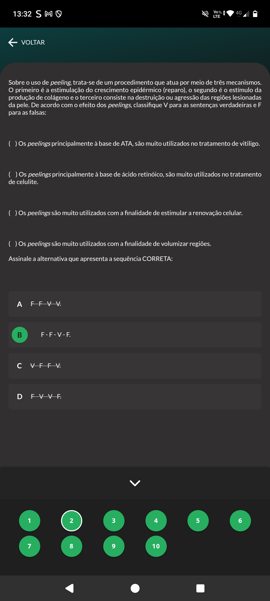 13:32 S M 4G LTE VOLTAR Sobre uso de peeling, trata-se de um procedimento que atua por meio de três mecanismos. primeiro é a estimulação do crescimento epidérmico (reparo), segundo é estímulo da produção de colágeno e o terceiro consiste na destruição ou agressão das regiões lesionadas da pele. De acordo com efeito dos peelings, classifique V para as sentenças verdadeiras e F para as falsas: Os peelings principalmente à base de ATA, são muito utilizados no tratamento de vitiligo. Os peelings principalmente à base de ácido retinóico, são muito utilizados no tratamento de celulite. Os peelings são muito utilizados com a finalidade de estimular a renovação celular. Os peelings são muito utilizados com a finalidade de volumizar regiões. Assinale a alternativa que apresenta a sequência CORRETA: F-F-V-F. c D 1 2 3 4 5 6 7 8 9 10