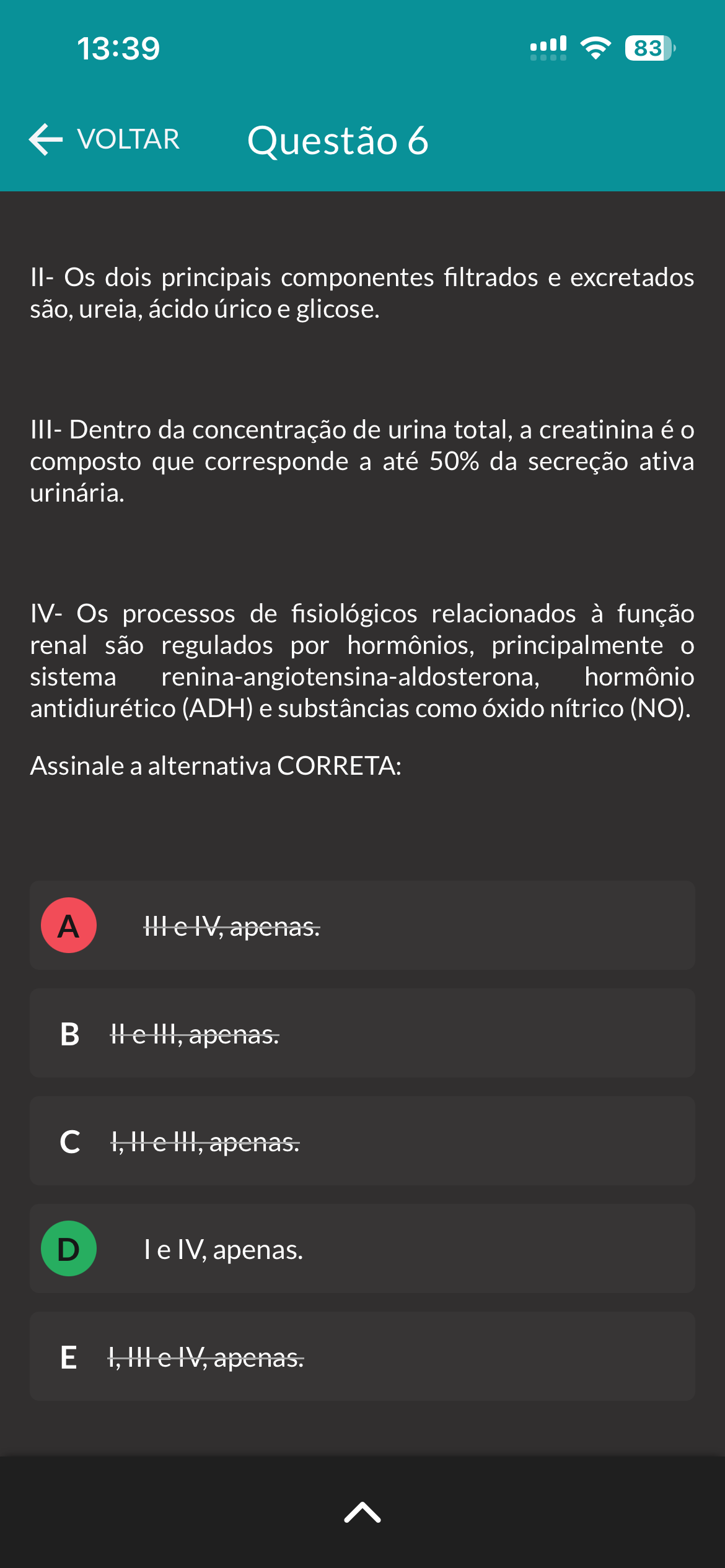 13:39 83 VOLTAR Questão 6 II- Os dois principais componentes filtrados e excretados são, ureia, ácido úrico e glicose. III- Dentro da concentração de urina total, a creatinina é o composto que corresponde a até 50% da secreção ativa urinária. IV- Os processos de fisiológicos relacionados à função renal são regulados por hormônios, principalmente o sistema renina-angiotensina-aldosterona, hormônio antidiurético (ADH) e substâncias como óxido nítrico (NO). Assinale a alternativa CORRETA: A B c D le IV, apenas. E