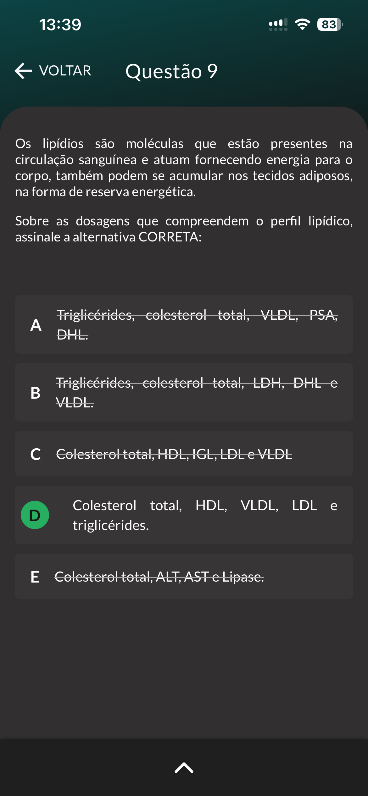 13:39 83 VOLTAR Questão 9 Os lipídios são moléculas que estão presentes na circulação sanguínea e atuam fornecendo energia para o corpo, também podem se acumular nos tecidos adiposos, na forma de reserva energética. Sobre as dosagens que compreendem perfil lipídico, assinale a alternativa CORRETA: Triglicérides, colesterol total, VLDL, PSA, A DHL. Triglicérides, colesterol total, LDH, DHL e VLDL. c Colesterol total, HDL, IGL, LDL e VLDL Colesterol total, HDL, VLDL, LDL e D triglicérides. E Colesterol total, ALT, AST e Lipase.