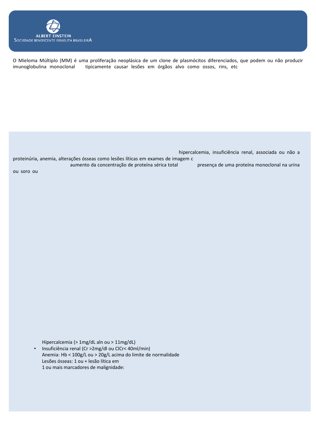 Guia do Episódio de Cuidado Mieloma Múltiplo 1. Avaliação inicial e diagnóstico 1.1. A suspeita clínica de MM por sintomas ou alterações de exames – hipercalcemia, insuficiência renal, associada ou não a proteinúria, anemia, alterações ósseas como lesões líticas em exames de imagem como RX, tomografia computadorizada, PET-CT ou ressonância magnética ou aumento da concentração de proteína sérica total e / ou a presença de uma proteína monoclonal na urina ou soro ou presença de aumento de cadeia leve livre kappa ou lambda – deve desencadear investigação diagnóstica dirigida, incluindo: • Hemograma completo, função renal, função hepática, albumina, cálcio iônico • DHL, B2 microglobulina • Eletroforese de proteínas sérica e urinária • Imunofixação sérica • Proteinúria 24h, eletroforese de proteínas e imunofixaçcão em urina de 24h • Dosagem de imunoglobulinas (IgA, IgG, IgM) • Cadeia leve livre sérica • Sorologias (HbsAg, AntiHBC, AntiHBS, Anti-HCV, HIV) • Rastreio amiloidose: Ecocardiograma Transtorácico • Avaliação medular– BMO, mielograma, imunofenotipagem, FISH para MM e Cariótipo de Medula Óssea • Cinética de DNA na medula óssea • Avaliação óssea – Preferência por PET-CT. RNM de Corpo Inteiro e Tomografia Computadorizada de Corpo Inteiro são opções Para a avaliação genética, o FISH deve analisar somente as células plasmocitárias, através de purificação ou em combinação com detecção por imunofluorescência de Ig de cadeia leve citoplasmática. Também pode ser utilizado avaliação de expressão gênica para estratificação de risco. 1.2. O diagnóstico de MM deve ser realizado no contexto clínico adequado(2): Plasmócitos clonais ≥ 10% na medula óssea ou plasmocitoma extramedular + 1 dos seguintes: • Hipercalcemia (> 1mg/dL aln ou > 11mg/dL) • Insuficiência renal (Cr >2mg/dl ou ClCr 20g/L acima do limite de normalidade • Lesões ósseas: 1 ou + lesão lítica em RX de esqueleto, CT de corpo inteiro ou PET-CT • 1 ou mais marcadores de malignidade: • Plasmócitos clonais na medula ≥60% • Relação de cadeia leve envolvida/não envolvida ≥ 100 • > 1 lesão focal em RNM 1.3. A partir do diagnóstico definitivo, avaliações adicionais devem ser realizadas conforme algoritmo abaixo: O Mieloma Múltiplo (MM) é uma proliferação neoplásica de um clone de plasmócitos diferenciados, que podem ou não produzir imunoglobulina monoclonal, e tipicamente causar lesões em órgãos alvo como ossos, rins, etc. O MM é responsável por aproximadamente 1 a 2 % de todos os cânceres e um pouco mais de 17 % das neoplasias hematológicas. É mais comum em homens do que mulheres e mais comum entre indivíduos de ascendência afro-americana. Dados dos Estados Unidos estimam cerca de 34.000 novos casos no ano de 2021 e aproximadamente 13.000 mortes, e representa uma incidência anual de aproximadamente 7 por 100.000 indivíduos por ano(1). Concordamos com a posição da National Comprehensive Cancer Network (NCCN) de que a inclusão em estudos clínicos deve ser considerada para todos os pacientes oncológicos. 2. ESTRATIFICAÇÃO DE RISCO 2.1 DURIE SALMON • Estadio I: Massa tumoral 10g/dL, Ca normal, IgG 1,2 x 1012 cels/m2 + Hb12mg/dL, IgG>7g/dL, IgA>5g/dL, proteína urinaria M >12g/24h, múltiplas lesões osteolíticas, fraturas, Cr 3,5 g/dl • Estádio II: Albumina 3g/dL, IgA > 4g/dL, IgG> 6g/dL TRATAMENTO: plasmaférese com reposição de plasma ou sangria com reposição de cristaloide/ Evitar transfusão de concentrado de hemácias 5.2 Compressão medular: Corticoide em altas doses (dexametasona 40mg) , avaliação da ortopedia e radioterapia (plasmocitomas de partes moles) 5.3 Deterioração da função renal: Hidratação vigorosa – 3L de salina diária, descontinuação de drogas nefrotóxicas, tratamento da hipercalcemia, início de corticoterapia em altas doses 5.4 Hipercalcemia: Hidratação + dexametasona (se Ca12mg/dl) ou Denosumabe se insuficiência renal presente. Se Ca>18mg/dl : hemodiálise Definição de resposta Critério de Resposta Resposta Completa Imunofixação negativa no soro e urina, desaparecimento de plasmocitoma e 50% de redução na proteína M sérica E redução de > 90% na proteína M em urina de 24h ou para 50% de redução na diferença entre cadeia - leve - livre envolvida/não - envolvida. - proteína M sérica e urinária e FLC não mensuráveis: >50% redução de plasmócitos da medula óssea, se basal >30% - plasmocitomas de partes moles presentes, redução de >50% na dimensão Resposta Mínima Redução de proteína M sérica ≥25% mas ≤49% e redução proteína M urinaria de 50-89% em 24h + redução de 50% de plasmocitoma, se presente ao diagnóstico 6. TRATAMENTO ADJUVANTE SE MIELOMA SINTOMÁTICO A) Bisfosfonatos (Zoledronato): Preferência se ClCr> 60 ml/min – Ácido Zoledrônico 4 mg IV 4/4sem. B) Denosumabe: Preferência se flu-like com zometa ou alteração renal – Denosumabe 120 mg SC 4/4sem. Reposição de cálcio e vitamina D se uso de bisfosfonato ou denosumabe. Profilaxias infecciosas: contra herpes zoster com aciclovir 400mg 12/12h ou Valaciclovir 500mg/dia quando em uso de Inibidor de Proteassoma ou Daratumumabe e Bactrim F 3x/semana se corticoide em altas doses ou CD4+ Lenalidomida + Dexametasona (Estudo Aspire) • Ixazomibe + Lenalidomida + Dexametasona (Estudo Tourmaline) • Elotuzumab + Lenalidomida + Dexamentasona (Estudo Eloquent) Considerar transplante autólogo de medula óssea caso o mesmo não tenha sido realizado na 1ª linha ou se recaída no mínimo 18 meses após o 1º transplante Quimioterapia sistêmica • mCBAD ou VDT-PACE ou DCEP poderão ser utilizados em pacientes refratários ou alto risco com leucemia células plasmocitárias como ponte para transplante 9. ACONSELHAMENTO GENÉTICO No momento, não existem genes específicos ou loci que conferem aumento de risco ou estejam diretamente rela