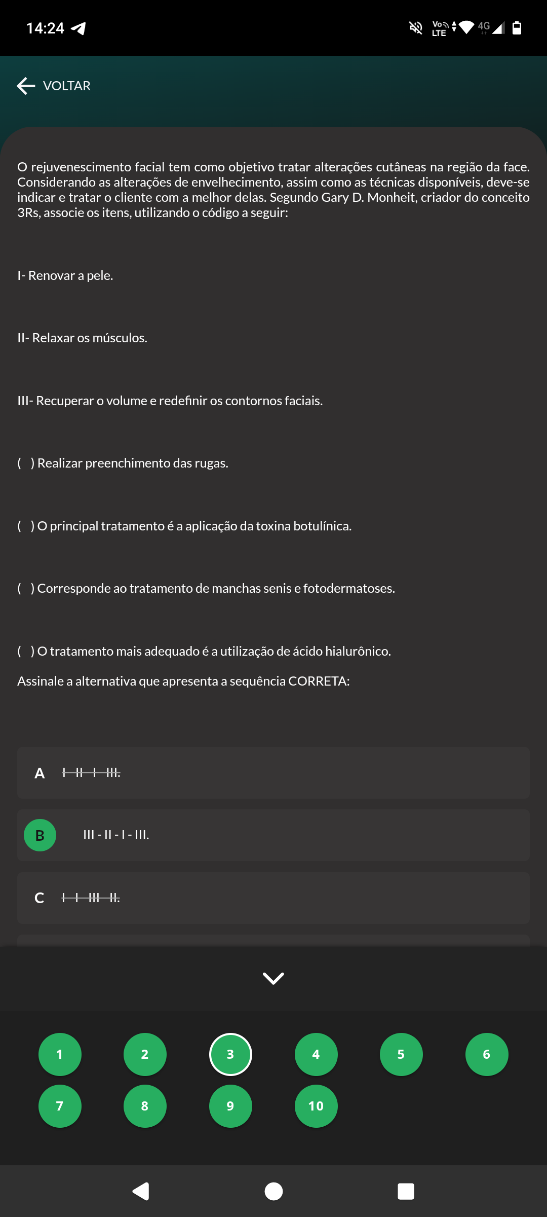 14:24 4G LTE VOLTAR rejuvenescimento facial tem como objetivo tratar alterações cutâneas na região da face. Considerando as alterações de envelhecimento, assim como as técnicas disponíveis, deve-se indicar e tratar o cliente com a melhor delas. Segundo Gary D. Monheit, criador do conceito 3Rs, associe os itens, utilizando o código a seguir: I- Renovar a pele. II- Relaxar os músculos. III- Recuperar volume e redefinir os contornos faciais. Realizar preenchimento das rugas. principal tratamento é a aplicação da toxina botulínica. Corresponde ao tratamento de manchas senis e fotodermatoses. tratamento mais adequado é a utilização de ácido hialurônico. Assinale a alternativa que apresenta a sequência CORRETA: III III. c 1 2 3 4 5 6 7 8 9 10