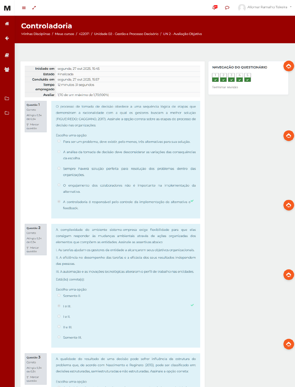M Aliomar Ramalho Teixeira Controladoria Minhas Disciplinas / Meus cursos / 422071 / Unidade 02 Gestão e Processo Decisório / UN 2 - Avaliação Objetiva Iniciado em segunda, 27 out 2025, 15:45 NAVEGAÇÃO DO QUESTIONÁRIO Estado Finalizada 1 2 3 4 5 Concluída em segunda, 27 out 2025, 15:57 Tempo 12 minutos 31 segundos Terminar revisão empregado Avaliar 1,70 de um máximo de 1,70(100%) Questão 1 processo de tomada de decisão obedece a uma sequência lógica de etapas que Correto demonstram a racionalidade com a qual gestores buscam a melhor solução Atingiu 0,34 de 0,34 (FIGUEIREDO; CAGGIANO, 2017). Assinale a opção correta sobre as etapas do processo de P Marcar decisão nas organizações: questão Escolha uma opção: Para ser um problema, deve existir, pelo menos, três alternativas para sua solução. A análise da tomada de decisão deve desconsiderar as variações das consequências da escolha. Sempre haverá solução perfeita para resolução dos problemas dentro das organizações. engajamento dos colaboradores não é importante na implementação da alternativa. A controladoria é responsável pelo controle da implementação da alternativa feedback. Questão 2 A complexidade do ambiente sistema-empresa exige flexibilidade para que elas Correto consigam responder às mudanças ambientais através de ações organizadas dos Atingiu 0,34 de 0,34 elementos que compõem as entidades. Assinale as assertivas abaixo: P Marcar questão As tarefas ajudam gestores da entidade a alcançarem seus objetivos organizacionais. II. A eficiência no desempenho das tarefas e a eficácia dos seus resultados independem das pessoas. III. A automação e as inovações tecnológicas alteraram perfil de trabalho nas entidades. Está(ão) correta(s): Escolha uma opção: Somente II. III. II. III. Somente III. Questão 3 A qualidade do resultado de uma decisão pode sofrer influência da estrutura do Correto problema que, de acordo com Nascimento e Reginato (2013), pode ser classificado em: Atingiu 0,34 de 0,34 decisões estruturadas, semiestruturadas e não estruturadas. Assinale a opção correta: P Marcar questão Escolha uma opção:AS nao estruturadas sao aquelas que apresentam baixa complexidade e resultados podem ser certos. As decisões não estruturadas são aquelas que podem ser sistematizadas até determinado nível. As decisões não estruturadas demandam menor capacidade de julgamento do decisor. As decisões estruturadas são pré-determinadas e constantes no modelo de decisão geral da entidade. As decisões estruturadas são imprevisíveis e impossíveis de serem incorporados no sistema de informação. Questão 4 As tarefas são executadas através de técnicas e princípios desenvolvidos pelas teorias Correto administrativas. Elas contam com O esforço humano, inovações tecnológicas e práticas de Atingiu 0,34 de 0,34 gestão modernas que permitem aumentar a produtividade das companhias. Pode-se P Marcar afirmar que, normalmente, a alocação das pessoas à execução de tarefas considera as questão variáveis: Escolha uma opção: Técnicas e de natureza humana. Estrutural e científica. Humana e tecnológica. Geográfica e social. Ambiental e sistêmica. Questão 5 Em relação ao processo de formulação estratégica, modelos de gestão podem ser Correto divididos em rígido e flexível. Relacione a primeira coluna com a segunda coluna: Atingiu 0,34 de 0,34 Modelo de gestão rígido Marcar questão Modelo de gestão flexível () Desempenho baseado em ações. () Planejamento contínuo. () Imprevisibilidade e volatilidade dos objetivos. () Avaliação interna sobre contexto e seus atores. A sequência correta de cima para baixo: Escolha uma opção: 1,2,2,1. 2,2,1,1. 1,1,2,1. Terminar revisão Conteúdo Online Seguir para... Conteúdo OnlineMOODLE BY ITVIX