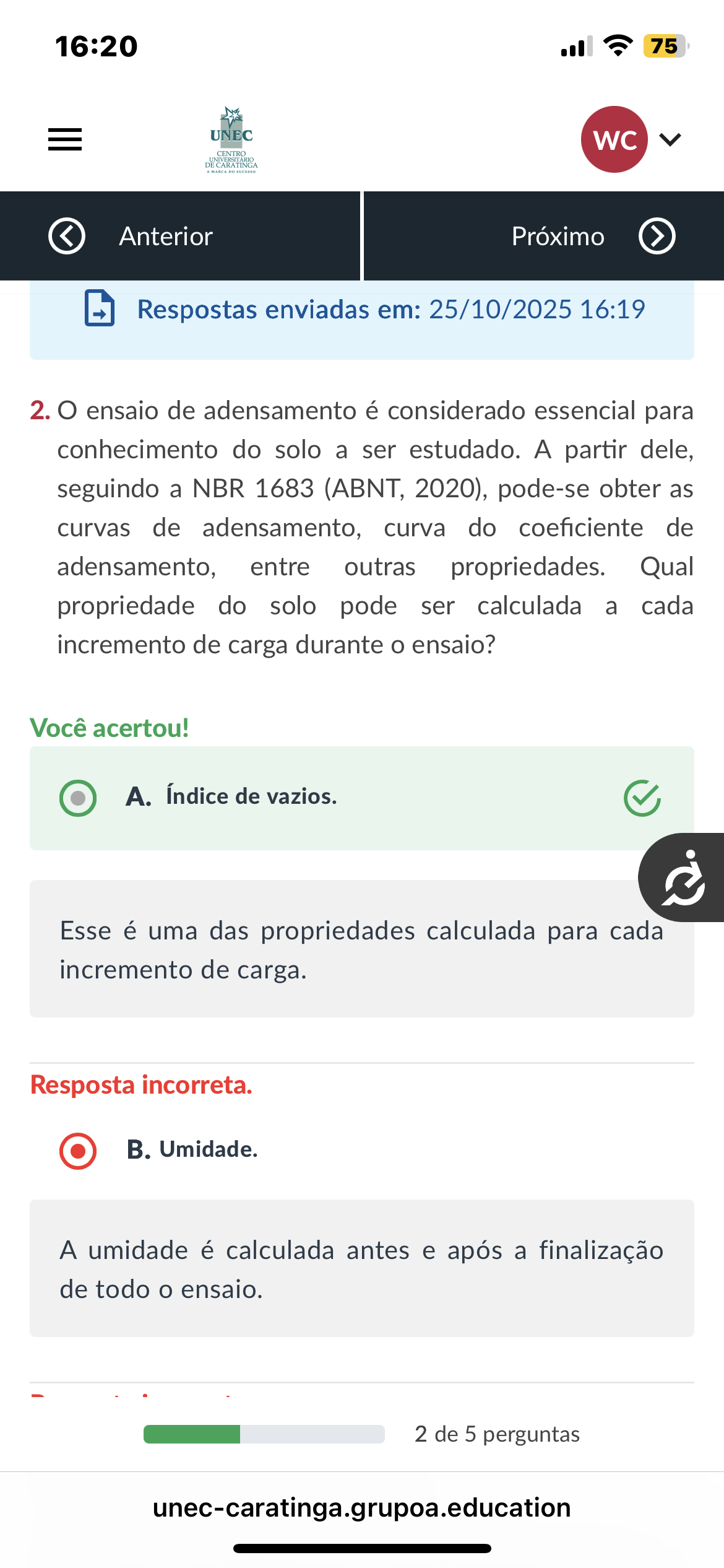 16:20 75 UNEC WC CENTRO DE CARATINGA Anterior Próximo > Respostas enviadas em: 25/10/2025 16:19 2.0 ensaio de adensamento é considerado essencial para conhecimento do solo a ser estudado. A partir dele, seguindo a NBR 1683 (ABNT, 2020), pode-se obter as curvas de adensamento, curva do coeficiente de adensamento, entre outras propriedades. Qual propriedade do solo pode ser calculada a cada incremento de carga durante o ensaio? Você acertou! A. Índice de vazios. Esse é uma das propriedades calculada para cada incremento de carga. Resposta incorreta. B. Umidade. A umidade é calculada antes e após a finalização de todo ensaio. 2 de 5 perguntas unec-caratinga.grupoa.education