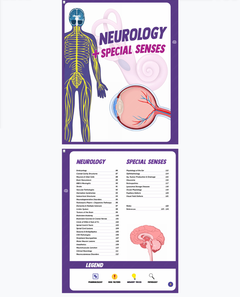 NEUROLOGY SPECIAL SENSES NEUROLOGY SPECIAL SENSES Embryology 86 Physiology of the Ear 113 Cranial Cavity Structures 87 Ophthalmology 114 Neurons & Glial Cells 88 Aq. Humor Production & Drainage 115 Brain Vasculature 89 Glaucoma 116 BBB & Meningitis 90 Retinopathies 117 Stroke 91 Lysosomal Storage Diseases 118 Vascular Pathologies 92 Ocular Physiology 119 Herniation Syndromes 93 Pupillary Defects 120 Subcorticol Structures 94 Visual Field Defects 121 Neurodegenerative Disorders 95 Parkinson's Pharm + Dopamine Pathways 96 Dementia & Multiple Sclerosis 97 Notes 122 Limbic System 98 References 123 124 Tumors of the Brain 99 Brainstem Anatomy 100 Brainstem Function & Cranial Nerves 101 Circle of Willis & Rule of 4's 102 Spinal Cord & Tracts 103 Spinal Cord Lesions 104 Seizures & Antiepileptics 105 CNS Pathologies 106 Peripheral Neuropathies 107 Motor Neuron Lesions 108 Anesthetics 109 Neuromuscular Junction 110 Clinical Neurology 111 Neurocutaneous Disorders 112 LEGEND PHARMACOLOGY RISK FACTORS MEMORY TRICKS PATHOLOGY 8Embryology NEURAL PLATE DAY NEUROectOdeRM Derivatives Neural Crest 18 Cell Derivatives Neurons All neurons in the CNS Neuroglia Astrocytes, Oligodendrocytes, NOTOCHORD eninges (pia & arachnoid) Ependymocytes, Choroid plexus cells ectoderm to dontoblasts differentiate into Neurohypophysis (posterior pituitary gland) to form neural plate racheal cartilage (pineal gland) nterochromaffin-like cells Optic nerve aryngeal cartilage Retina Muscles of the iris CRESTS Plate gives rise neural arafollicular C cells tube neural crest cells Microglia are the only neuroglial cells drenal medulla & All ganglia NEURAL TUBE with a Mesodermal origin. They act as chwann cells the "Macrophage-like" cells of the CNS. eptum (aorticopulmonary) REMEMBER the M's! 21 MOTEL Neural Tube Regionalization PASS Adult derivatives of: Walls Cavities NEURAL TUBE DEFECTS Telencephalon Cerebral Lateral ANENCEPHALY: Failure of rostral neuropore to close Hemispheres Ventricles "An" without Forebrain Diencephalon Thalamus, "Enkephalos" without forebrain Third (prosencephalon) Hypothalamus Ventricle Clinical findings: POLYHYDRAMNIOS: Midbrain Cerebral Mesencephalon Midbrain Excessive amniotic fluid for gestational age (mesencephalon) Aqueduct Impaired CNS swallowing Hindbrain Metencephalon Pons upper part SPINA BIFIDA VARIANTS Cerebellum OCCULTA MENINGOCELE MYELOMENINGOCELE Myelencephalon Medulla lower part Spinal Cord Memory Tricks "Fore" in front Forebrain Telepathy in your cerebral hemispheres" Telencephalon Diet (food centers in hypothalamus)' = Diencephalon M for Midbrain Mesencephalon No herniation, Meninges Meninges "Mes, Met, My follows alphabetical order!" associated with tuft herniate AND of hair or bony defect ONLY neural tube herniate LISSENCEPHALY HOLOPROSENCEPHALY failure of caudal neural tube to close "SMOOTH BRAIN" Holo = "failure to divide" of MARKERS CAUSES Failure of neuronal the prosencephalon into AFP migration leading the cerebral hemispheres. Folate deficiency AChE Diabetic mother to the absence of Associated with Patau Obesity 86 syndrome (trisomy 13) & *Spina Bifida occulta has sulci and gyri. normal AFP Fetal Alcohol Syndrome. Cranial Cavity Structures POSTERIOR FOSSA MALFORMATIONS SYRINGOMYELIA CHIARI MALFORMATIONS DANDY-WALKER Cystic enlargement of the spinal Small posterior fossa MALFORMATION cord (central canal) Agenesis of the cerebellar Tonsilar herniation vermis Compresses fibers crossing in the anterior white commissure Spina bifida SYRINGOMYELIA (myelomeningocele) Cystic enlargement of the 4th ventricle Spinothalamic tract affected: Bilateral pain and temperature CHIARI TYPE I CHIARI TYPE II loss malformation: malformation: Enlarged posterior fossa Classic "cape-like" distribution Herniation of II Can lead to: Displacement of NON-COMMUNICATING structure (cerebellar structures (cerebellum HYDROCEPHALUS tonsils) & medulla) VENTRICULAR SYSTEM LATERAL VENTRICLES (2) CSF drains into the venous system via arachnoid INTERVENTRICULAR granulations in the FORAMINA (2) superior sagittal sinus. VENTRICLE CEREBRAL AQUEDUCT Foramen of Luschka: Lateral 4TH VENTRICLE Foramen of Magendie: Medial CSF is produced by to spinal cord Ependymal cells in CENTRAL CANAL To subarachnoid space (between arachnoid & pia mater) the Choroid plexus. NORMAL PRESSURE HYDROCEPHALUS Affects older adults (>60 years), idiopathic. COMMUNICATING HYDROCEPHALUS Normal ICP or episodically elevated. Decreased CSF absorption CSF Decreased CSF absorption by arachnoid granulations. accumulation dilation of ventricles. Caused by inflammatory disease (e.g., meningitis) or hemorrhage. Wet Wacky Wobbly NON-COMMUNICATING HYDROCEPHALUS Structural blockage of CSF within the ventricular Urinary Cognitive Magnetic system. incontinence Dysfunction Gait Causes include: EX-VACUO HYDROCEPHALUS Cerebral aqueduct stenosis (most common) Extra-ventricular obstruction Enlarged ventricles in response to cortical atrophy. Congenital causes Not true hydrocephalus. Congenital toxoplasmosis infection. Seen in Alzheimer's, Schizophrenia, & advanced Results in: Increased ICP, Papilledema, Herniation stages of other Neurodegenerative conditions. 87Neurons & Glial Cells NEUROGLIA (CNS) NEURONS ASTROCYTE "Astro" "star-like" DENDRITES: Receive signals Most common glial cell CELL BODY ("SOMA"): Maintains the environment Contains organelles & Nissl physical support & repair bodies for biosynthesis component of BBB (blood- brain barrier) AXONS: Transmit signals Marker GFAP+ Away from the cell body Reactive Gliosis: Astrocytes hypertrophy to serve MYELIN SHEATH: Insulating a protective role during CNS injury. layer allowing electrical signals to quickly propagate down axons MICROGLIA CNS = Oligodendrocytes Macrophages of the CNS PNS = Schwann cells Activated by tissue damage Release inflammatory mediators Recall: Derived from Mesoderm EPENDYMAL CELLS OLIGODENDROCYTES CSF dEPENDs on "EPENDymal" cells! "ol-EGG-odendrocyte" classic "fried-egg" appearance Simple colum