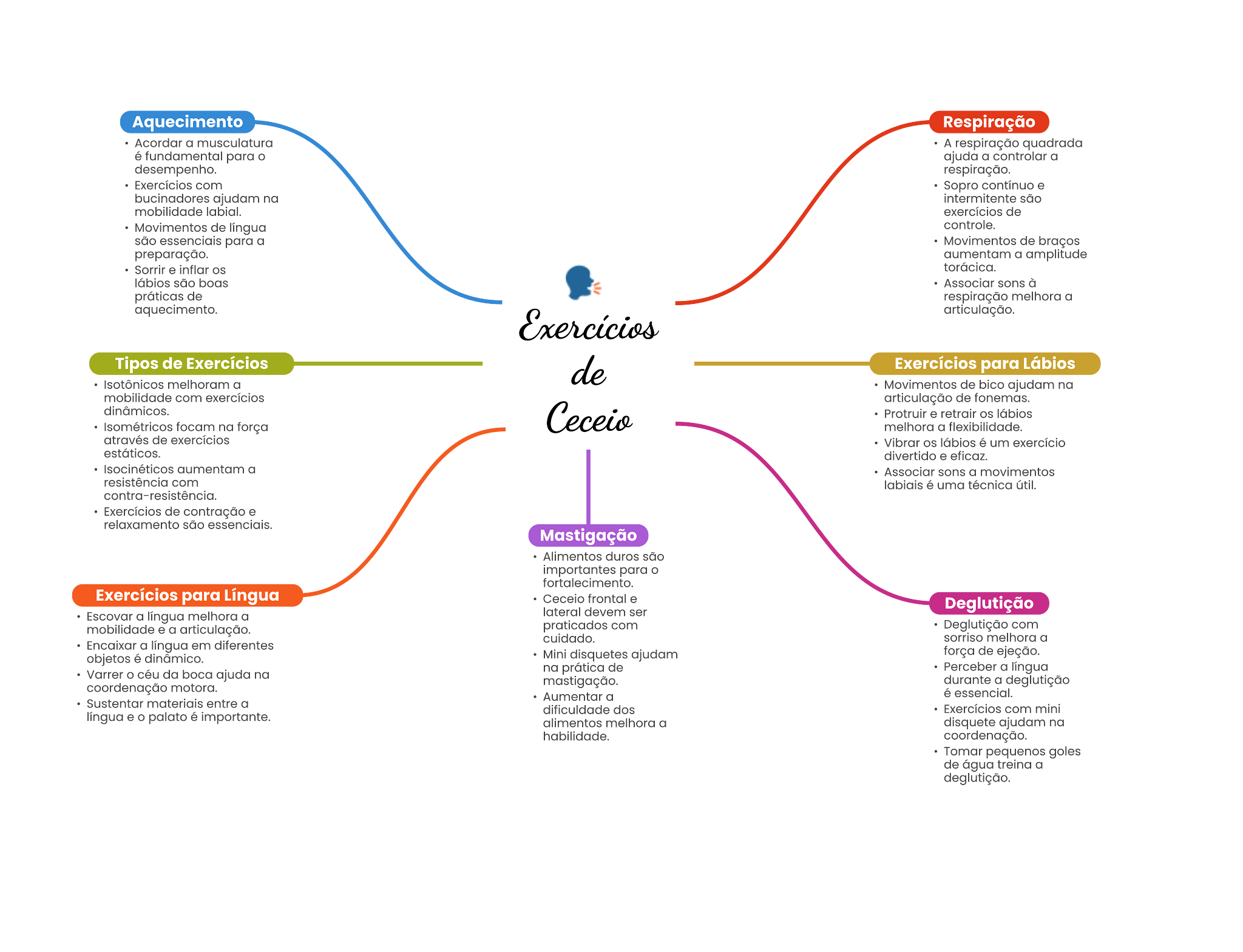 Aquecimento Respiração Acordar a musculatura A respiração quadrada fundamental para ajuda a controlar a desempenho. respiração. Exercícios com Sopro . bucinadores ajudam na são mobilidade labial. exercícios de Movimentos de lingua controle. essenciale para a Movimentos de braços preparação. a amplitude torácica. boas sons à de respiração melhora a aquecimento. Tipos de Exercícios Exercícios para Lábios melhoram a Movimentos de bico ajudam na mobilidade com exercícios articulação de dinâmicos. Protruir retrair focam na força melhora a de exercícios Vibrar é um exercício divertido a Associar sons a movimentos resistência com uma técnica Exercícios de contração e relaxamento são Mastigação Alimentos duros são importantes para fortalecimento. Exercícios para Língua frontal lateral ser Deglutição Escovar a lingua melhora a mobilidade a articulação. praticados com Deglutição com a lingua em cuidado. melhora a objetos Mini ajudam força de ejeção. na de Perceber a lingua Varrer boca ajuda na coordenação motora. durante a deglutição Aumentor a essencial. materials entre a Exercícios com mini lingua . palato alimentos melhora a ajudam na habilidade. coordenação. Tomor paquenos goles de água a