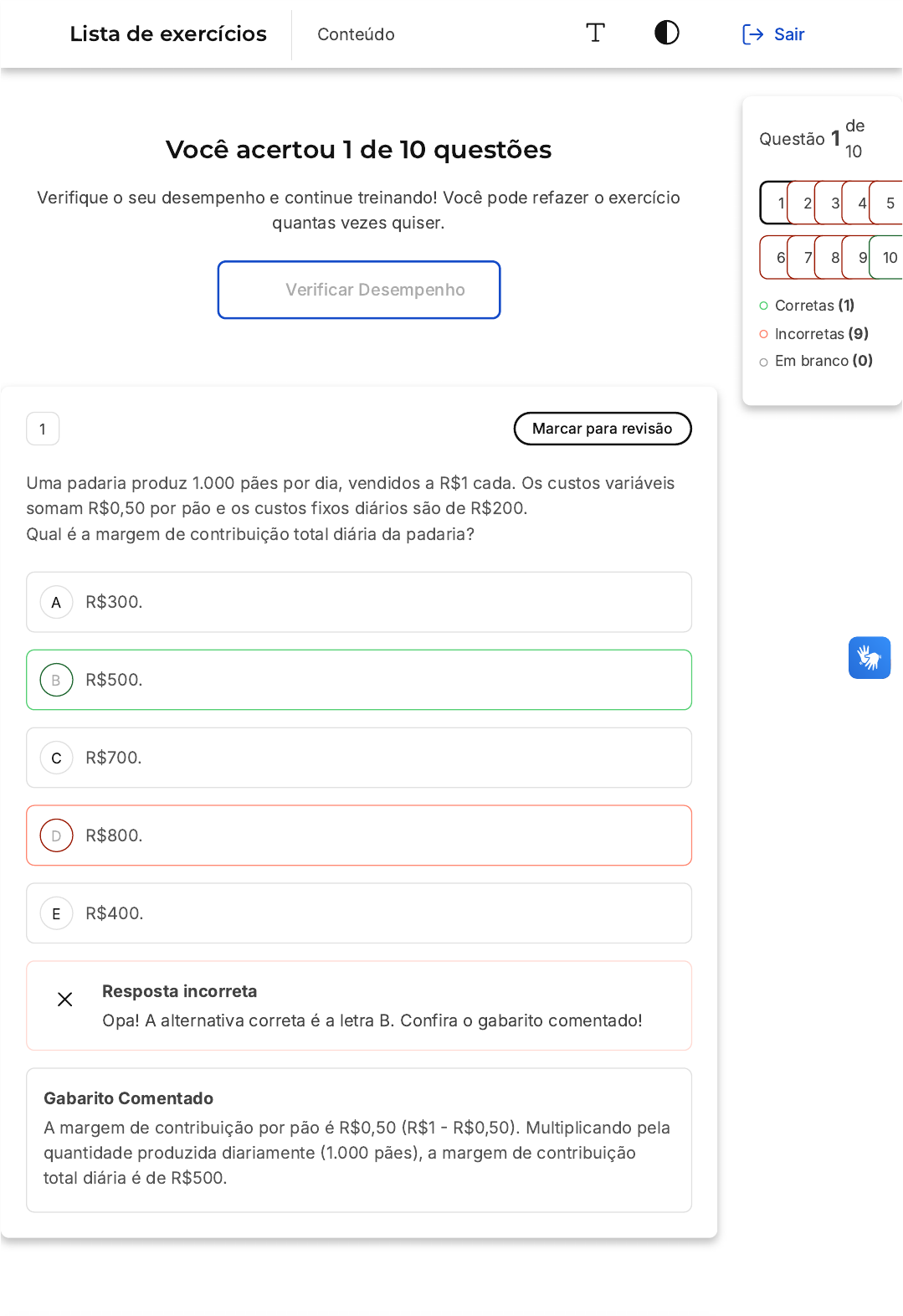 Você acertou 1 de 10 questões Verifique o seu desempenho e continue treinando! Você pode refazer o exercício quantas vezes quiser. Verificar Desempenho A B C D E 1 Marcar para revisão Uma padaria produz 1.000 pães por dia, vendidos a R$1 cada. Os custos variáveis somam R$0,50 por pão e os custos fixos diários são de R$200. Qual é a margem de contribuição total diária da padaria? R$300. R$500. R$700. R$800. R$400. Resposta incorreta Opa! A alternativa correta é a letra B. Confira o gabarito comentado! Gabarito Comentado A margem de contribuição por pão é R$0,50 (R$1 - R$0,50). Multiplicando pela quantidade produzida diariamente (1.000 pães), a margem de contribuição total diária é de R$500. Questão 1 de 10 Corretas (1) Incorretas (9) Em branco (0) 1 2 3 4 5 6 7 8 9 10 Lista de exercícios Conteúdo Sair A B C D E 2 Marcar para revisão Uma empresa de fabricação de calçados planeja aumentar a produção em 20%. Atualmente, ela vende 10.000 pares por mês a R$50 cada. Seus custos variáveis são R$20 por par e custos fixos mensais de R$200.000. Qual será o novo lucro mensal após o aumento da produção? R$150.000. R$300.000. R$160.000. R$260.000. R$370.000. Resposta incorreta Opa! A alternativa correta é a letra C. Confira o gabarito comentado! Gabarito Comentado Com o aumento de 20% na produção, a empresa venderá 12.000 pares por mês. A receita será de R$600.000 (12.000 pares x R$50). Subtraindo os custos variáveis totais (R$240.000) e custos fixos (R$200.000), o lucro mensal será de R$160.000. Pares/mês valor/par Custo variável Custo Fixo Valor de Venda Lucro 10.000 50 R$ 200.000,00 R$ 200.000,00 R$ 500.000,00 R$ 100.000,00 12.000 50 R$ 240.000,00 R$ 200.000,00 R$ 600.000,00 R$ 160.000,00 3 Marcar para revisão Uma empresa de tecnologia tem custos fixos de R$200.000 por mês. Ela vende um software por R$1.000, com custos variáveis de R$200 por licença vendida. A B C D E A B C Qual é o ponto de equilíbrio em número de licenças vendidas? 250 licenças. 200 licenças. 300 licenças. 350 licenças. 400 licenças. Resposta incorreta Opa! A alternativa correta é a letra A. Confira o gabarito comentado! Gabarito Comentado O ponto de equilíbrio é alcançado quando a receita total cobre exatamente os custos totais. A margem de contribuição por licença é de R$800 (R$1.000 - R$200). Portanto, a empresa precisa vender 250 licenças (R$200.000 / R$800) para atingir o ponto de equilíbrio. 4 Marcar para revisão Um restaurante vende 300 pratos por dia a R$30 cada. Seus custos variáveis diários são R$6.000 e custos fixos mensais de R$90.000. Qual é a receita diária do restaurante? R$8.000. R$9.000. R$10.000. D E A B C D E R$11.000. R$12.000. Resposta incorreta Opa! A alternativa correta é a letra B. Confira o gabarito comentado! Gabarito Comentado A receita diária é calculada multiplicando o número de pratos vendidos pelo preço de cada prato. Assim, 300 pratos x R$30 resulta em uma receita diária de R$9.000. 5 Marcar para revisão A análise da relação de custo x volume x lucro é muito utilizada na tomada de decisão e na avaliação dos componentes de custos dos produtos, além de ser muito útil para a elaboração de orçamentos. Uma empresa apresenta a seguinte estrutura dos seus gastos de produção: Preço de venda unitário: $ 15,00 Custos e despesas variáveis por unidade: $ 9,50. Custos e despesas fixas totais: $ 11.000,00. A partir desses dados, pode-se concluir que: A empresa deverá produzir 2.500 unidades para cobrir seus custos totais. A margem de contribuição unitária é de $ 5,00. Se produzir 2.300 unidades, terá uma margem de segurança de 300 unidades. A empresa deverá produzir e vender 1.900 unidades para cobrir seus custos totais. Se produzir 2.500 unidades, terá uma margem de segurança de 450 unidades. A B C D E Resposta incorreta Opa! A alternativa correta é a letra C. Confira o gabarito comentado! Gabarito Comentado Para resolver a questão, é necessário calcular a margem de contribuição unitária do produto, que é a diferença entre o preço de venda e os custos e despesas variáveis unitárias. Nesse caso, a margem de contribuição unitária é de $ 5,50 (15 - 9,5). Em seguida, divide-se os custos fixos pela margem de contribuição unitária para encontrar o ponto de equilíbrio, que é a quantidade de unidades que a empresa precisa vender para cobrir todos os seus custos. Nesse caso, o ponto de equilíbrio é de 2.000 unidades (11.000 / 5,5). Portanto, se a empresa produzir 2.300 unidades, ela estará produzindo 300 unidades acima do ponto de equilíbrio, o que significa que terá uma margem de segurança de 300 unidades. Isso indica que a empresa pode vender até 300 unidades a menos do que o planejado sem incorrer em prejuízo. Assim, a alternativa correta é a C: "Se produzir 2.300 unidades, terá uma margem de segurança de 300 unidades". 6 Marcar para revisão A análise da relação entre o custo, o volume e o lucro é uma ferramenta importante para a tomada de decisão nas empresas. Qual o objetivo da análise da relação entre o custo, o volume e o lucro nas empresas? Identificar os custos fixos da empresa. Definir a margem de lucro da empresa. Projetar os resultados financeiros da empresa para diferentes cenários de produção e venda. Analisar a qualidade dos produtos da empresa. Avaliar o desempenho dos funcionários da empresa. Resposta incorreta Opa! A alternativa correta é a letra C. Confira o gabarito comentado! A B C D E Gabarito Comentado A análise da relação entre o custo, o volume e o lucro tem como objetivo principal projetar os resultados financeiros da empresa para diferentes cenários de produção e venda. Com isso, é possível avaliar a viabilidade financeira do negócio e tomar decisões estratégicas. 7 Marcar para revisão Uma empresa tem capacidade máxima de produção de 80.000 unidades. Nesse nível de produção, seus custos fixos somam $ 700.000 e seus cust