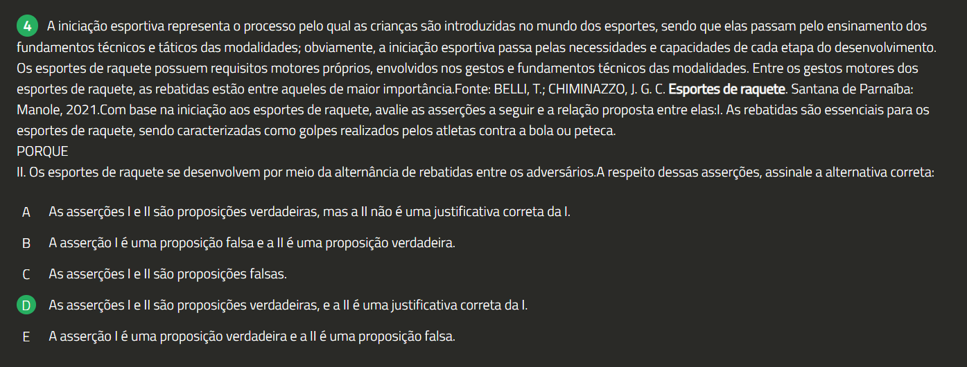 4 A iniciação esportiva representa 0 processo pelo qual as crianças são introduzidas no mundo dos esportes, sendo que elas passam pelo ensinamento dos fundamentos técnicos e táticos das modalidades; obviamente, a iniciação esportiva passa pelas necessidades e capacidades de cada etapa do desenvolvimento. Os esportes de raquete possuem requisitos motores próprios, envolvidos nos gestos e fundamentos técnicos das modalidades. Entre gestos motores dos esportes de raquete, as rebatidas estão entre aqueles de maior importância.Fonte: BELLI, T.; CHIMINAZZO, J. G.C. Esportes de raquete. Santana de Parnaíba: Manole, 2021.Com base na iniciação aos esportes de raquete, avalie as asserções a seguir e a relação proposta entre elas:l. As rebatidas são essenciais para esportes de raquete, sendo caracterizadas como golpes realizados pelos atletas contra a bola ou peteca. PORQUE II. Os esportes de raquete se desenvolvem por meio da alternância de rebatidas entre adversários.A respeito dessas asserções, assinale a alternativa correta: A As asserções I e são proposições verdadeiras, mas a não é uma justificativa correta da I. B A asserção é uma proposição falsa e a é uma proposição verdadeira. As asserções I e são proposições falsas. D As asserções I e são proposições verdadeiras, e a é uma justificativa correta da I. E A asserção é uma proposição verdadeira e a II é uma proposição falsa.
