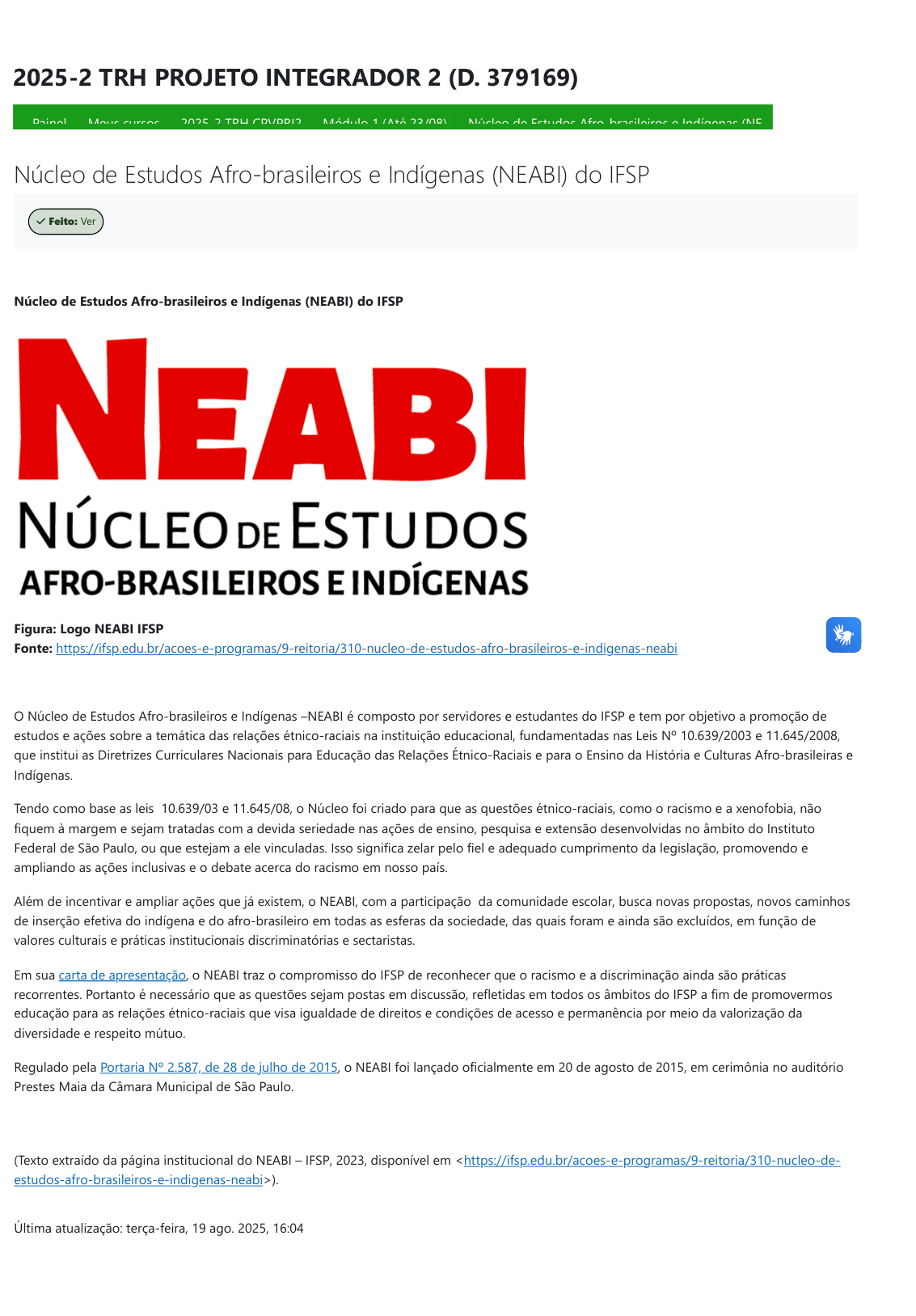 Núcleo de Estudos Afro-brasileiros e Indígenas (NEABI) do IFSP Núcleo de Estudos Afro-brasileiros e Indígenas (NEABI) do IFSP Figura: Logo NEABI IFSP Fonte: https://ifsp.edu.br/acoes-e-programas/9-reitoria/310-nucleo-de-estudos-afro-brasileiros-e-indigenas-neabi O Núcleo de Estudos Afro-brasileiros e Indígenas –NEABI é composto por servidores e estudantes do IFSP e tem por objetivo a promoção de estudos e ações sobre a temática das relações étnico-raciais na instituição educacional, fundamentadas nas Leis Nº 10.639/2003 e 11.645/2008, que institui as Diretrizes Curriculares Nacionais para Educação das Relações Étnico-Raciais e para o Ensino da História e Culturas Afro-brasileiras e Indígenas. Tendo como base as leis 10.639/03 e 11.645/08, o Núcleo foi criado para que as questões étnico-raciais, como o racismo e a xenofobia, não fiquem à margem e sejam tratadas com a devida seriedade nas ações de ensino, pesquisa e extensão desenvolvidas no âmbito do Instituto Federal de São Paulo, ou que estejam a ele vinculadas. Isso significa zelar pelo fiel e adequado cumprimento da legislação, promovendo e ampliando as ações inclusivas e o debate acerca do racismo em nosso país. Além de incentivar e ampliar ações que já existem, o NEABI, com a participação da comunidade escolar, busca novas propostas, novos caminhos de inserção efetiva do indígena e do afro-brasileiro em todas as esferas da sociedade, das quais foram e ainda são excluídos, em função de valores culturais e práticas institucionais discriminatórias e sectaristas. Em sua carta de apresentação, o NEABI traz o compromisso do IFSP de reconhecer que o racismo e a discriminação ainda são práticas recorrentes. Portanto é necessário que as questões sejam postas em discussão, refletidas em todos os âmbitos do IFSP a fim de promovermos educação para as relações étnico-raciais que visa igualdade de direitos e condições de acesso e permanência por meio da valorização da diversidade e respeito mútuo. Regulado pela Portaria Nº 2.587, de 28 de julho de 2015, o NEABI foi lançado oficialmente em 20 de agosto de 2015, em cerimônia no auditório Prestes Maia da Câmara Municipal de São Paulo. (Texto extraído da página institucional do NEABI – IFSP, 2023, disponível em ). Última atualização: terça-feira, 19 ago. 2025, 16:04 2025-2 TRH PROJETO INTEGRADOR 2 (D. 379169) Painel Meus cursos 2025 2 TRH CPVPRI2 Módulo 1 (Até 23/08) Núcleo de Estudos Afro brasileiros e Indígenas (NE ✓ Feito: Ver https://ifsp.edu.br/acoes-e-programas/9-reitoria/310-nucleo-de-estudos-afro-brasileiros-e-indigenas-neabi https://itq.ifsp.edu.br/images/NEABI/home/Carta_de_Apresentao_NEABI.pdf https://itq.ifsp.edu.br/images/NEABI/home/Portaria_2587_28_07_2015_Regulamento_Interno_NEABI.pdf https://ifsp.edu.br/acoes-e-programas/9-reitoria/310-nucleo-de-estudos-afro-brasileiros-e-indigenas-neabi https://ifsp.edu.br/acoes-e-programas/9-reitoria/310-nucleo-de-estudos-afro-brasileiros-e-indigenas-neabi https://ead.cpv.ifsp.edu.br/my/ https://ead.cpv.ifsp.edu.br/my/courses.php https://ead.cpv.ifsp.edu.br/course/view.php?id=1346§ion=0 https://ead.cpv.ifsp.edu.br/course/view.php?id=1346§ion=1 https://ead.cpv.ifsp.edu.br/mod/page/view.php?id=31955 ✉ Contate o suporte do site Você acessou como David Tobias Nunes (Sair) 2025-2 TRH CPVPRI2 Português - Brasil (pt_br) English (en) Português - Brasil (pt_br) Resumo de retenção de dados Baixar o aplicativo móvel. ◄ Horário de Funcionamento do Campus Capivari Seguir para... Vídeos para expandir sua compreensão sobre o NEABI ► https://glpi.cpv.ifsp.edu.br/ https://glpi.cpv.ifsp.edu.br/ https://glpi.cpv.ifsp.edu.br/ https://ead.cpv.ifsp.edu.br/user/profile.php?id=313 https://ead.cpv.ifsp.edu.br/login/logout.php?sesskey=NFDFlDM85M https://ead.cpv.ifsp.edu.br/course/view.php?id=1346 https://ead.cpv.ifsp.edu.br/mod/page/view.php?id=31955&lang=en https://ead.cpv.ifsp.edu.br/mod/page/view.php?id=31955&lang=pt_br https://ead.cpv.ifsp.edu.br/admin/tool/dataprivacy/summary.php https://download.moodle.org/mobile?version=2024100705.06&lang=pt_br&iosappid=633359593&androidappid=com.moodle.moodlemobile https://ead.cpv.ifsp.edu.br/mod/resource/view.php?id=31474&forceview=1 https://ead.cpv.ifsp.edu.br/mod/page/view.php?id=31957&forceview=1
